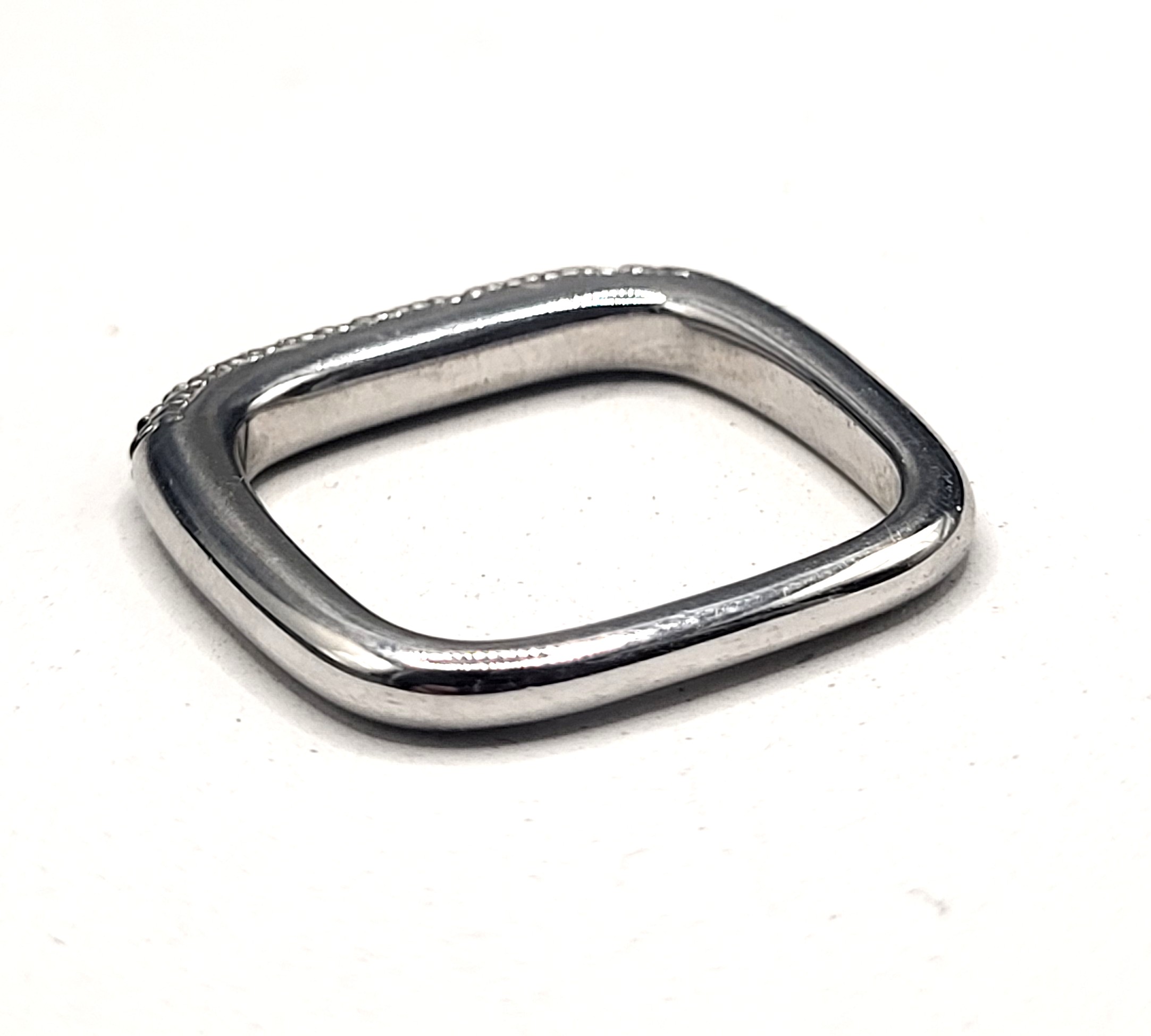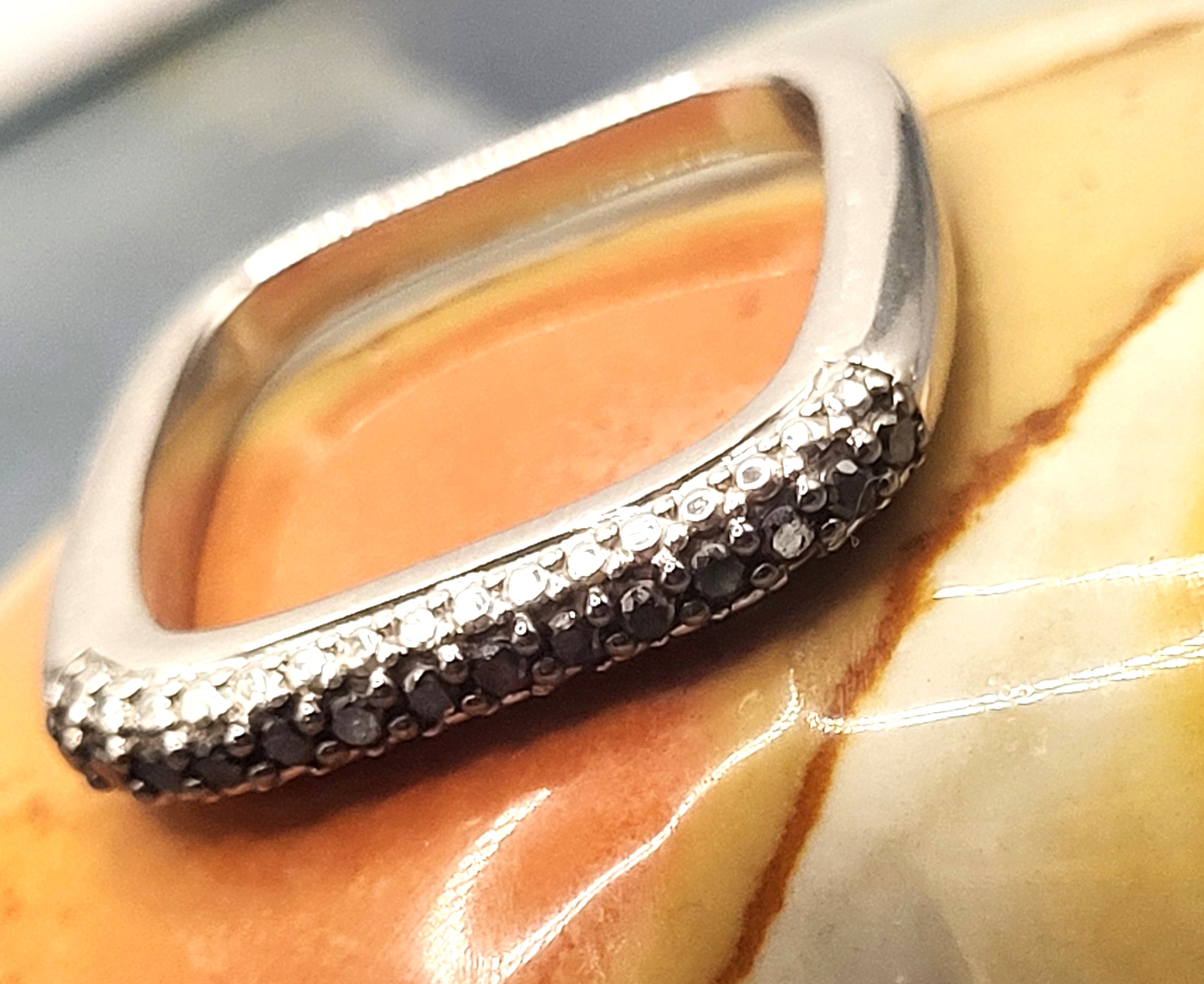 This uniquely designed pendant is made of sterling silver and genuine black diamonds. Three sides of the soft-cornered square have a mirror finish with a high-polish shine.  The fourth side is set with genuine, earth-mined, black diamonds (likely enhanced by heat or irradiation) on a textured surface. The square-shaped ring-design pendant is approximately 1" diameter and features approximately .21 carats total weight of round, faceted, earth-mined black diamonds.  The solid sides of the pendant taper from 3.3mm to 2.4mm wide and 4.4mm to 2.05mm in height. The pendant is quite versatile, as it can be worn by simply sliding a chain through the center, OR with a long, flexible (non-rigid) chain, let it hang from an anchor bend, aka fisherman’s knot.). 6.32 grams