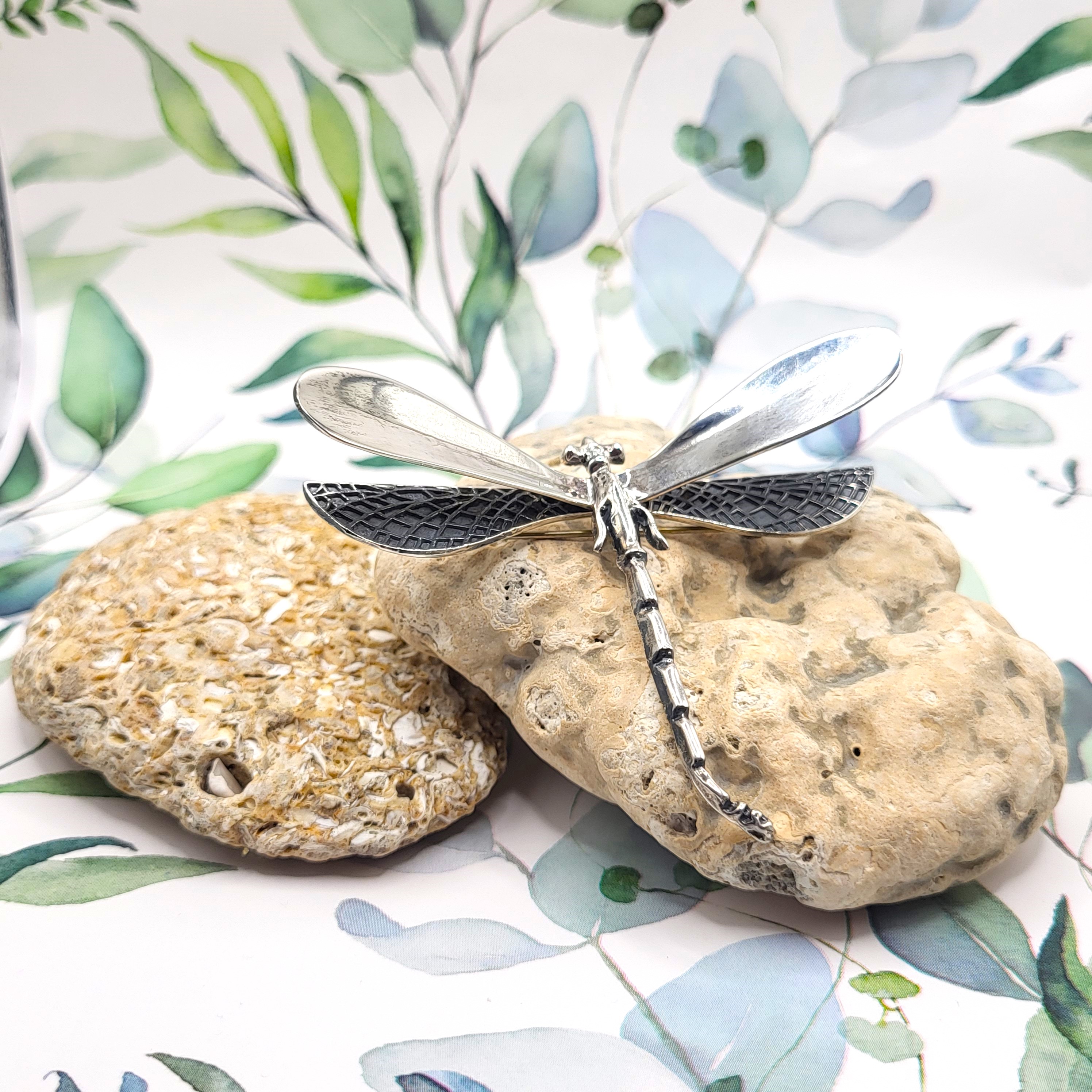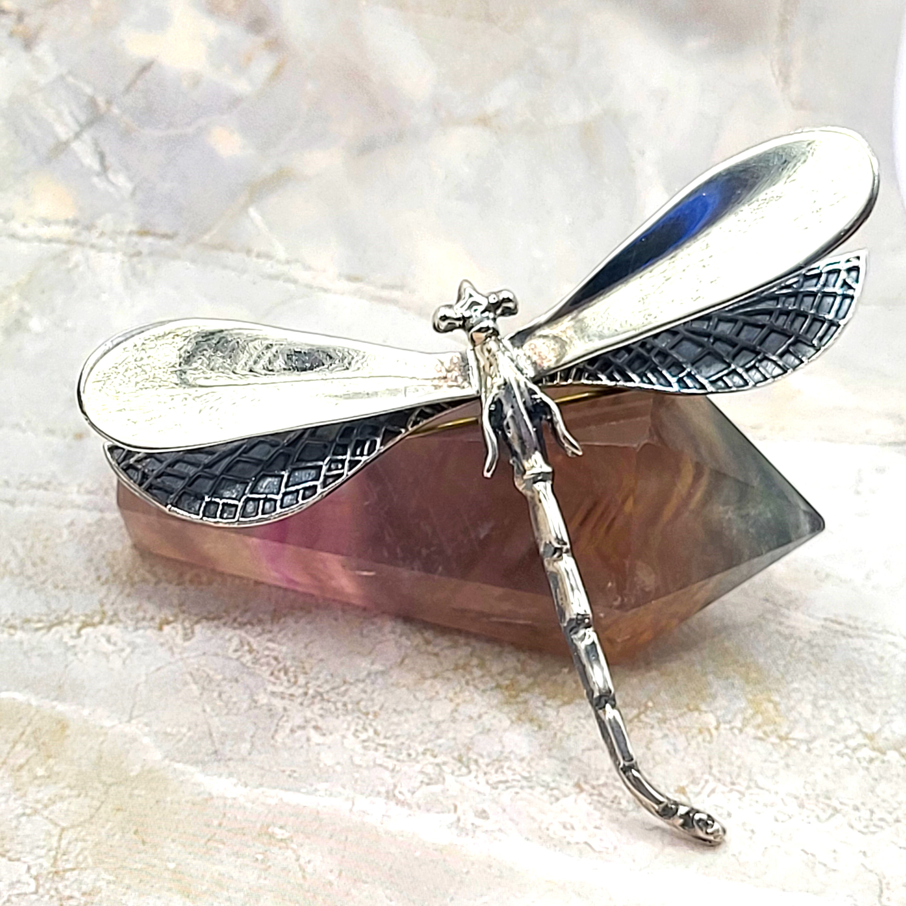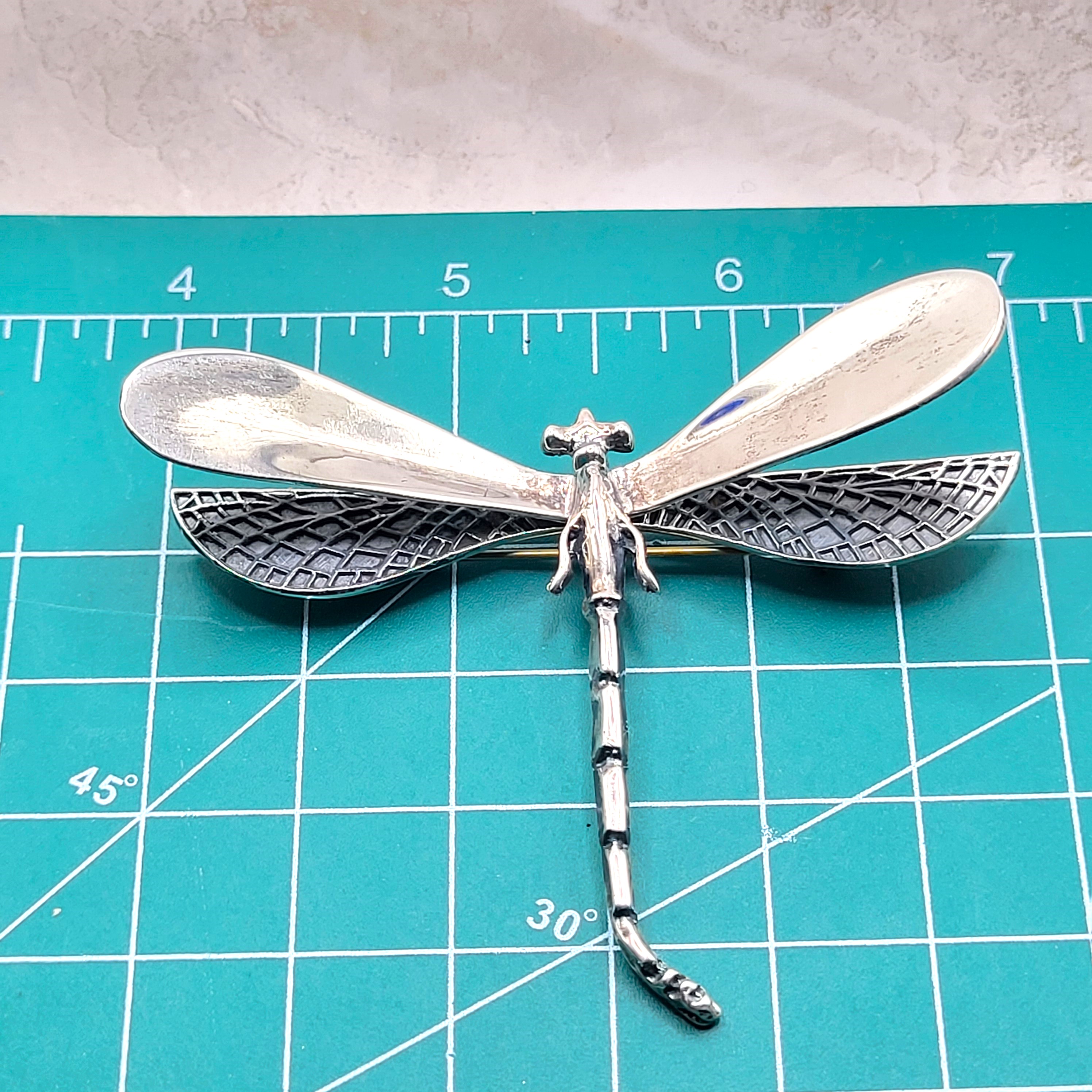 This sterling silver dragonfly brooch is looking for a place to land! Great detail is put into this piece from CII (A group of artisan silversmiths in Mexico "known for their high-quality silver jewelry and intricate designs") circa mid-late 1970’s. The brooch has very nice detail, such as the segments of the body and the venation on the wings. The pin measures approximately 2.25" long and a wingspan of 3". It closes with a locking "C" clasp. Please contact Bidfair Fine Jewelry if you would like to change this into a pendant. Admin: 33120/10ba