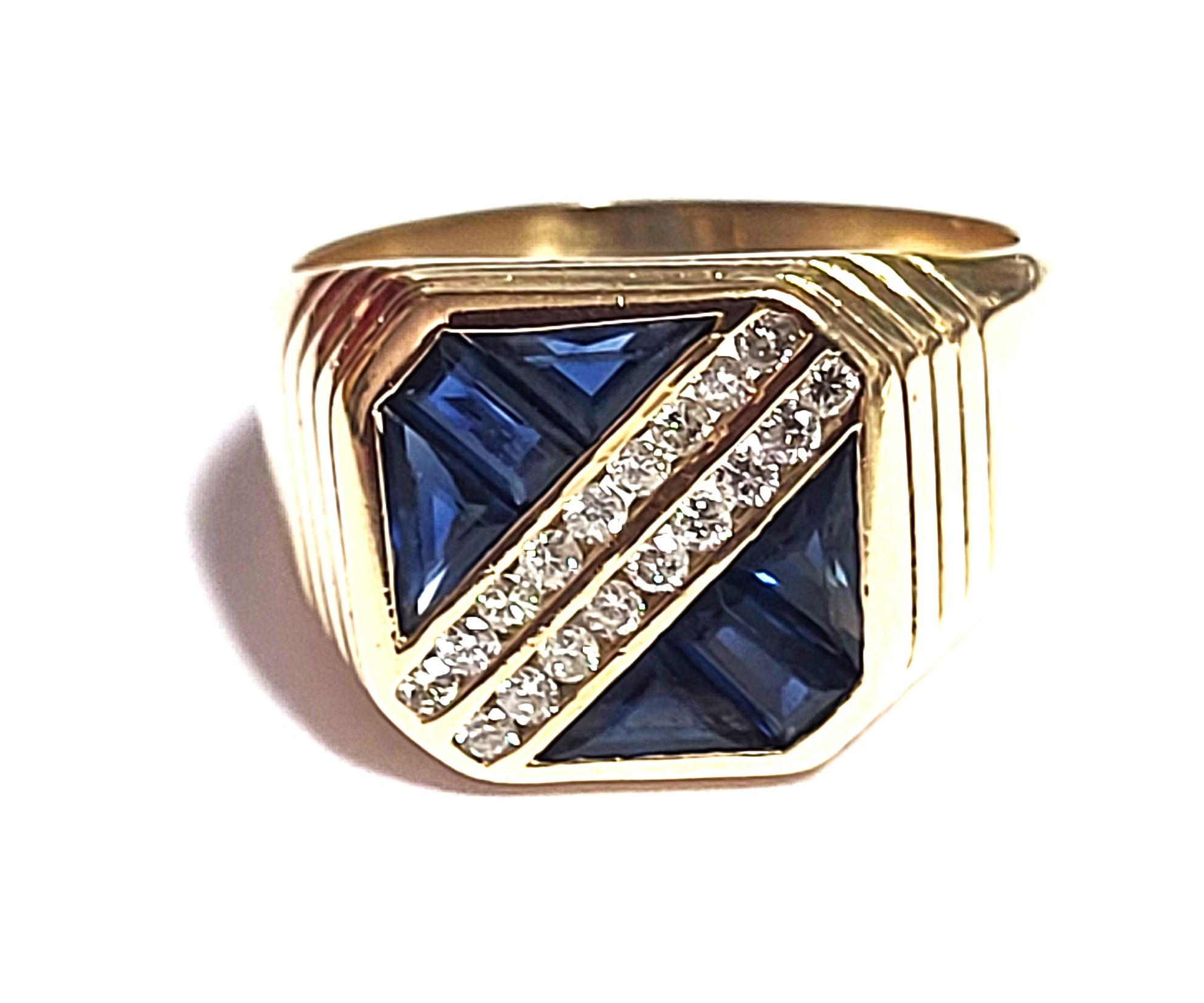 This is a 14 karat yellow gold approximately 1.00 carat total weight of trilliant- and baguette-cut invisible-set genuine blue sapphires and approximately .25 carats total weight round, brilliant-cut, approximate H color, SI2 clarity channel-set diamonds arranged diagonally across the center of the ring. It has a supportive lattice under gallery. The top of the ring is approximately 12mm and the ribbed shoulders taper to an approximate 4mm shank. The ring is US size 8 and can be sized for an additional charge. This item is eligible for appraisal at a discounted rate, from an independent appraiser (with qualifying credentials from GIA) with no affiliation to Bidfair Fine Jewelry. Please contact Bidfair Fine Jewelry for more information on appraisals and sizing. 8 grams. Admin: 33109/25irh