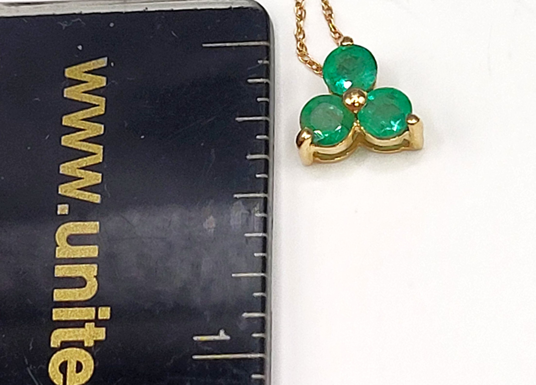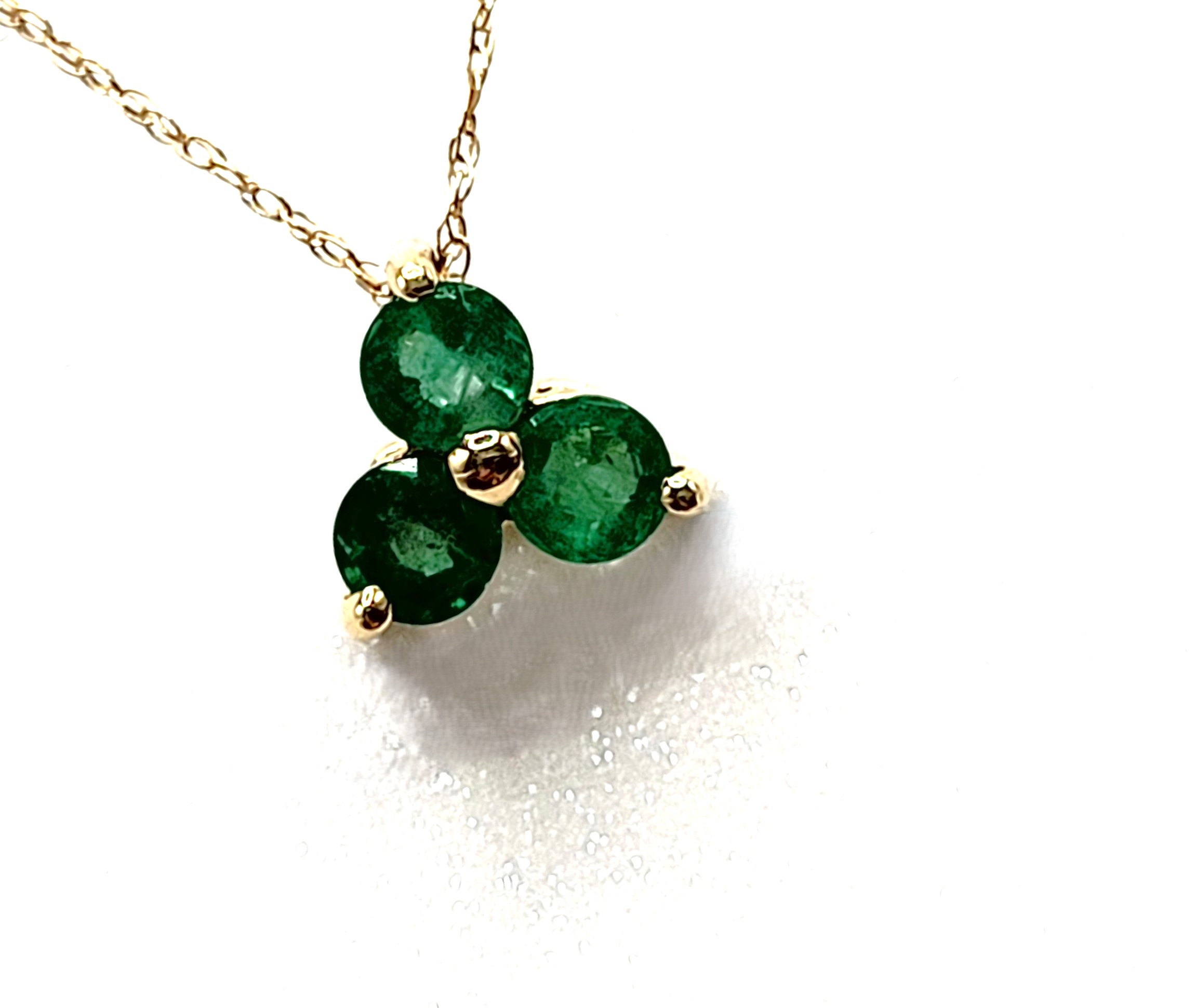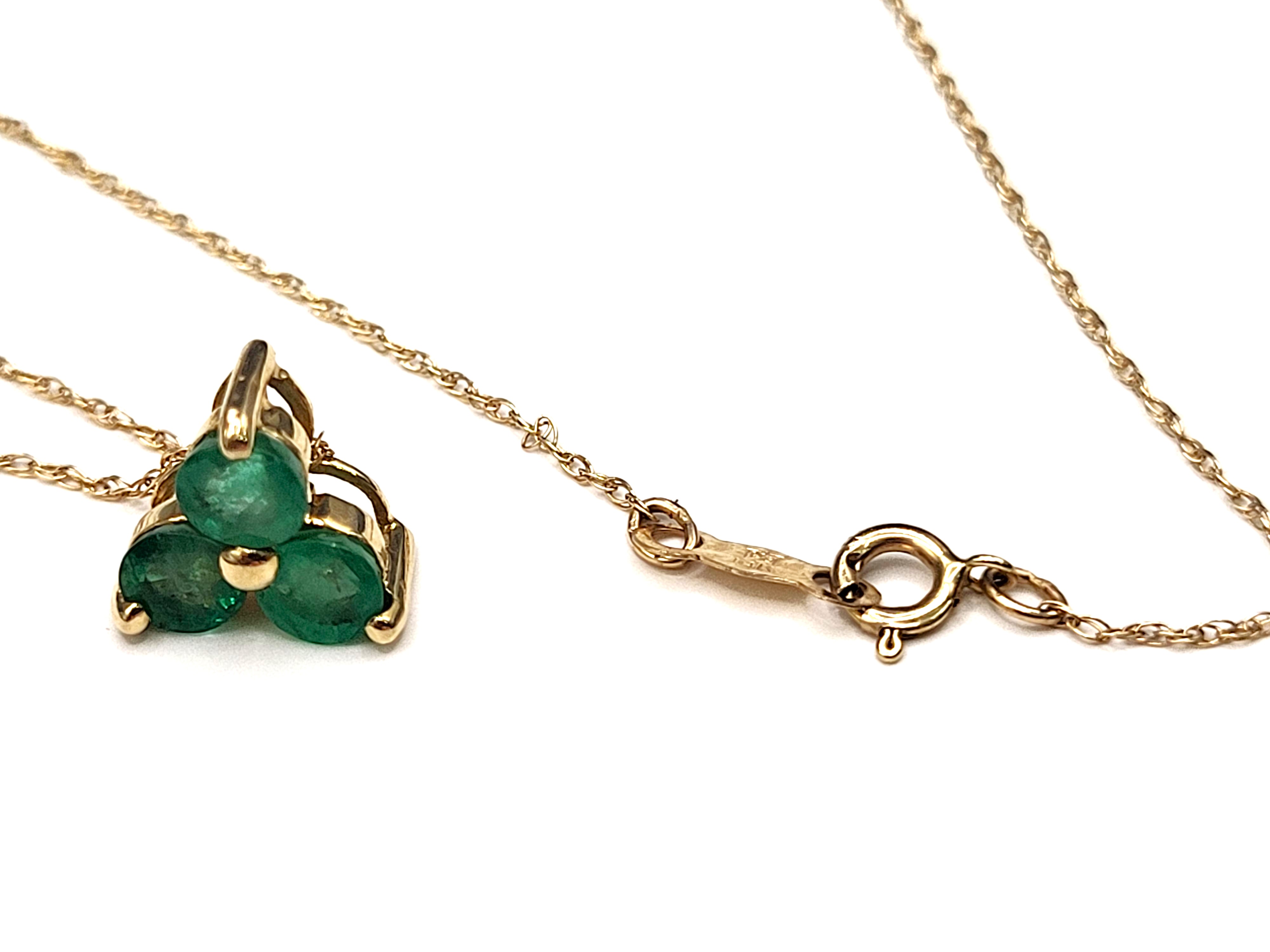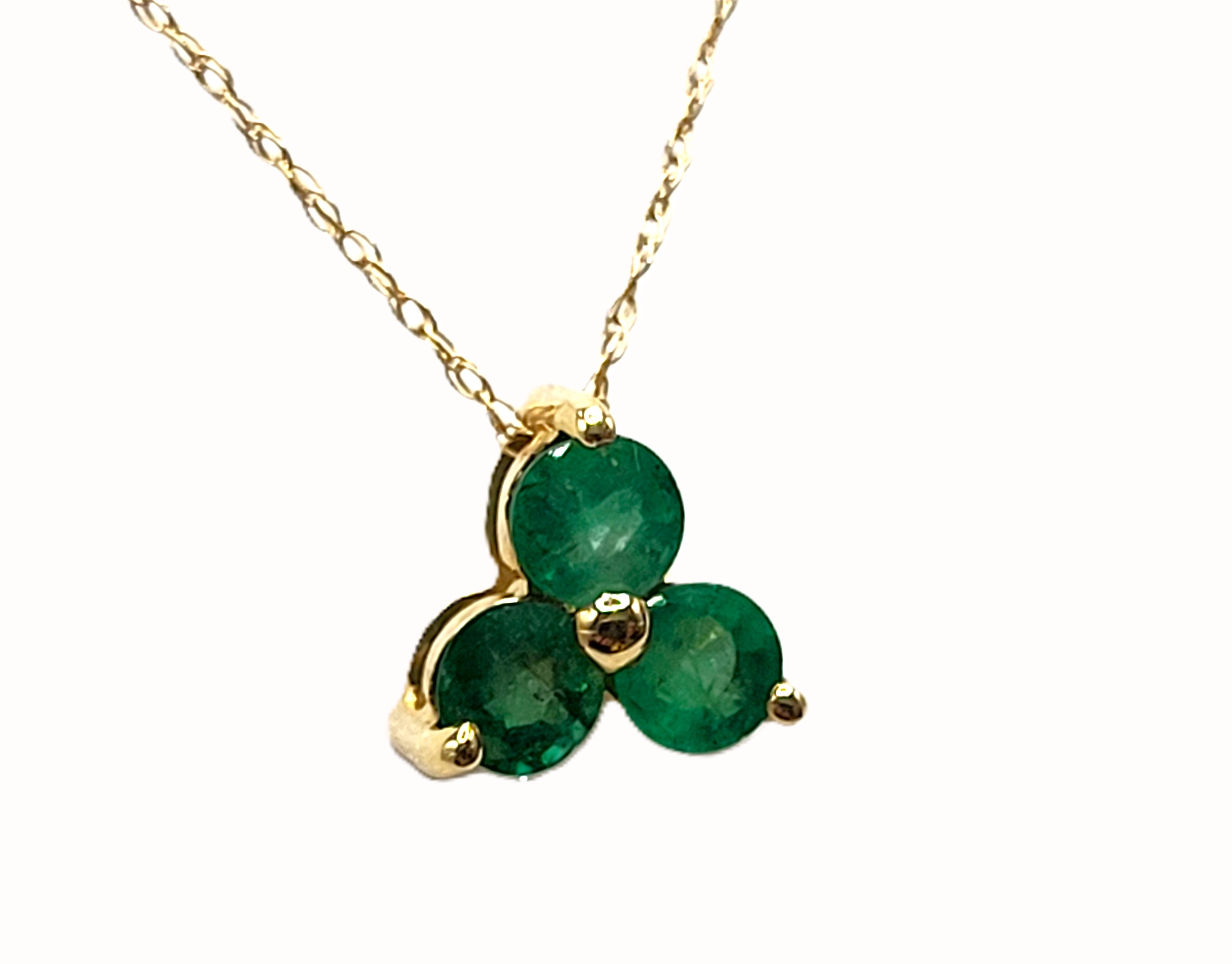 Sweet and simple, yet elegant. This 14 karat yellow gold necklace arranges three round, faceted, genuine emeralds into a clover design with a built-in bail for a simple slide. There is approximately .75 carats total weight in the pendant. It hangs from a 14 karat yellow gold 18" very fine rope chain (approximately .25mm) with a spring ring. This pendant bears the CID, Clyde Duneier, hallmark. Admin: 33110/18-ehAdminCode: 33110/17-pr