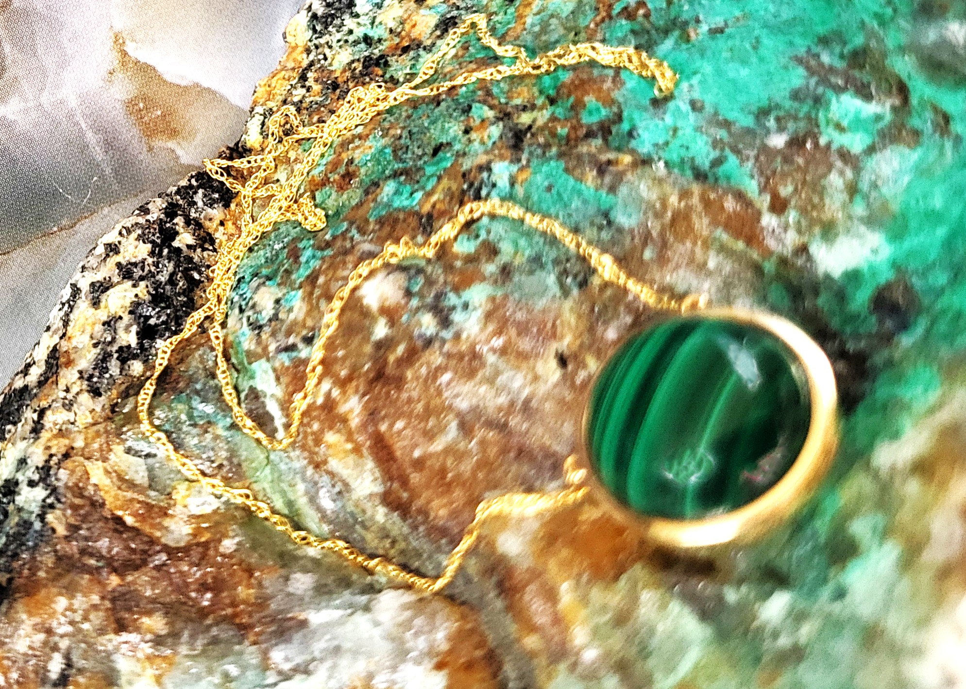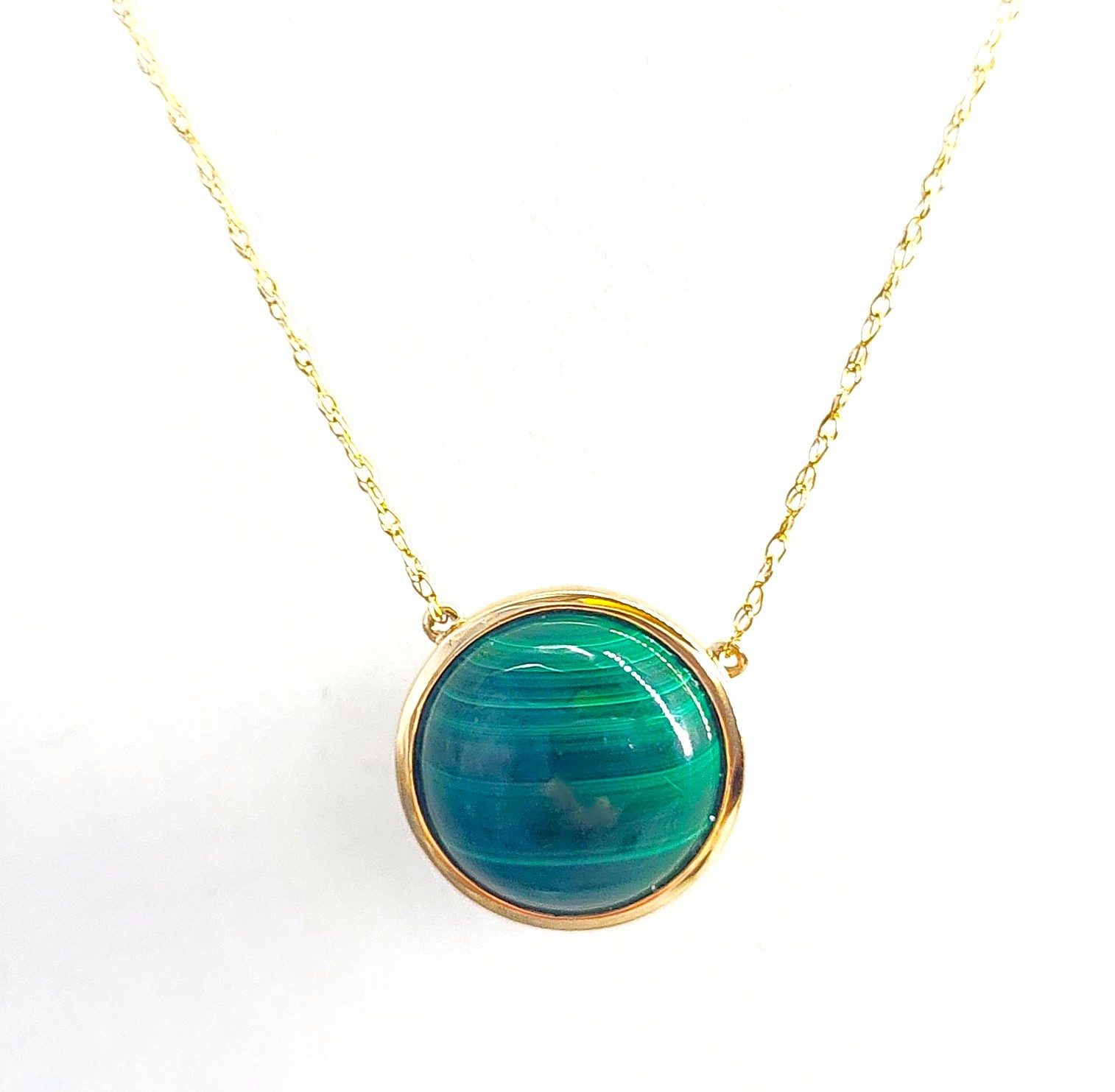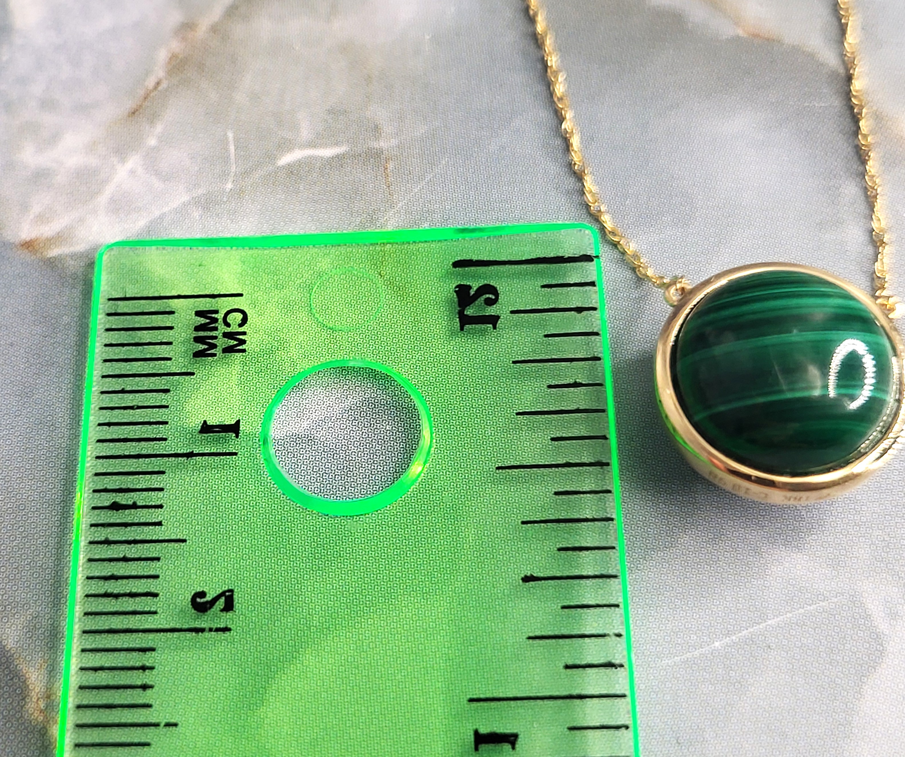 A stylish study in contrast and versatility, this 18" fine rope chain necklace features a reversible pendant showcasing half-round cabochons of lush green malachite and luminous white opal. Each stone is set in a wide bezel, offering a bold yet refined silhouette. The pendant remains stationary on the chain—9" on each side—creating a balanced, symmetrical drape. Finished with a classic spring ring clasp. Total weight: 4.2g. Admin Code: 6282/36.nrr