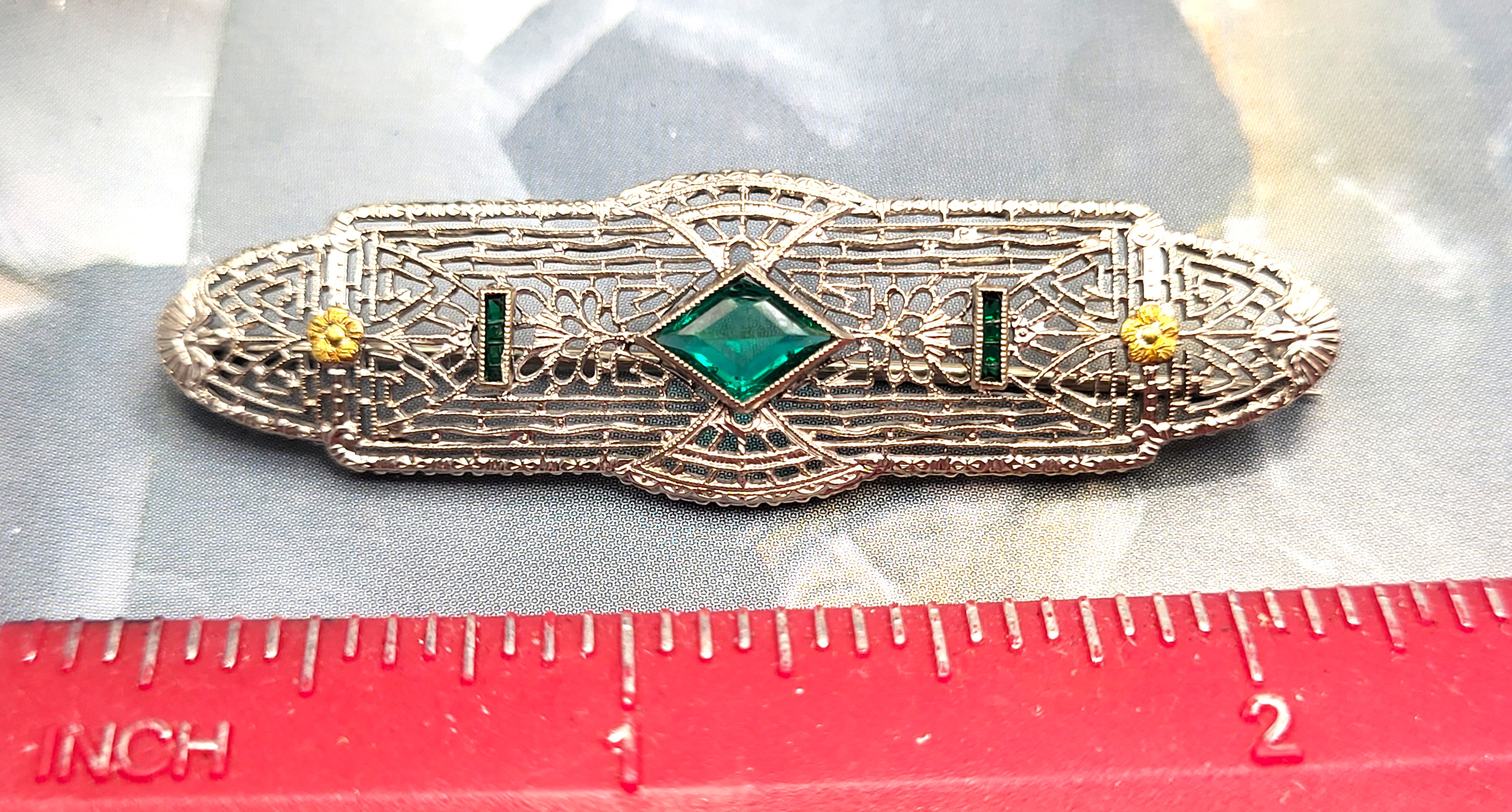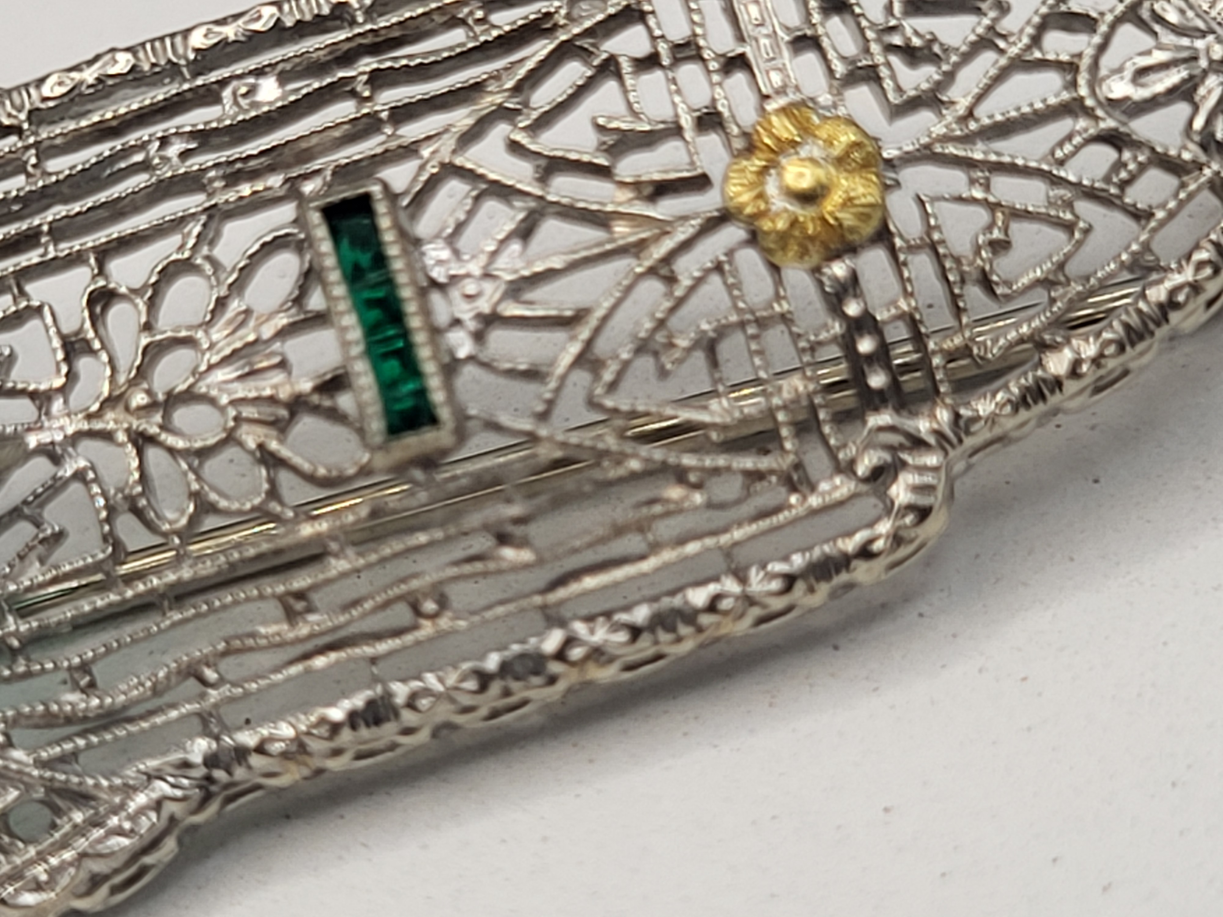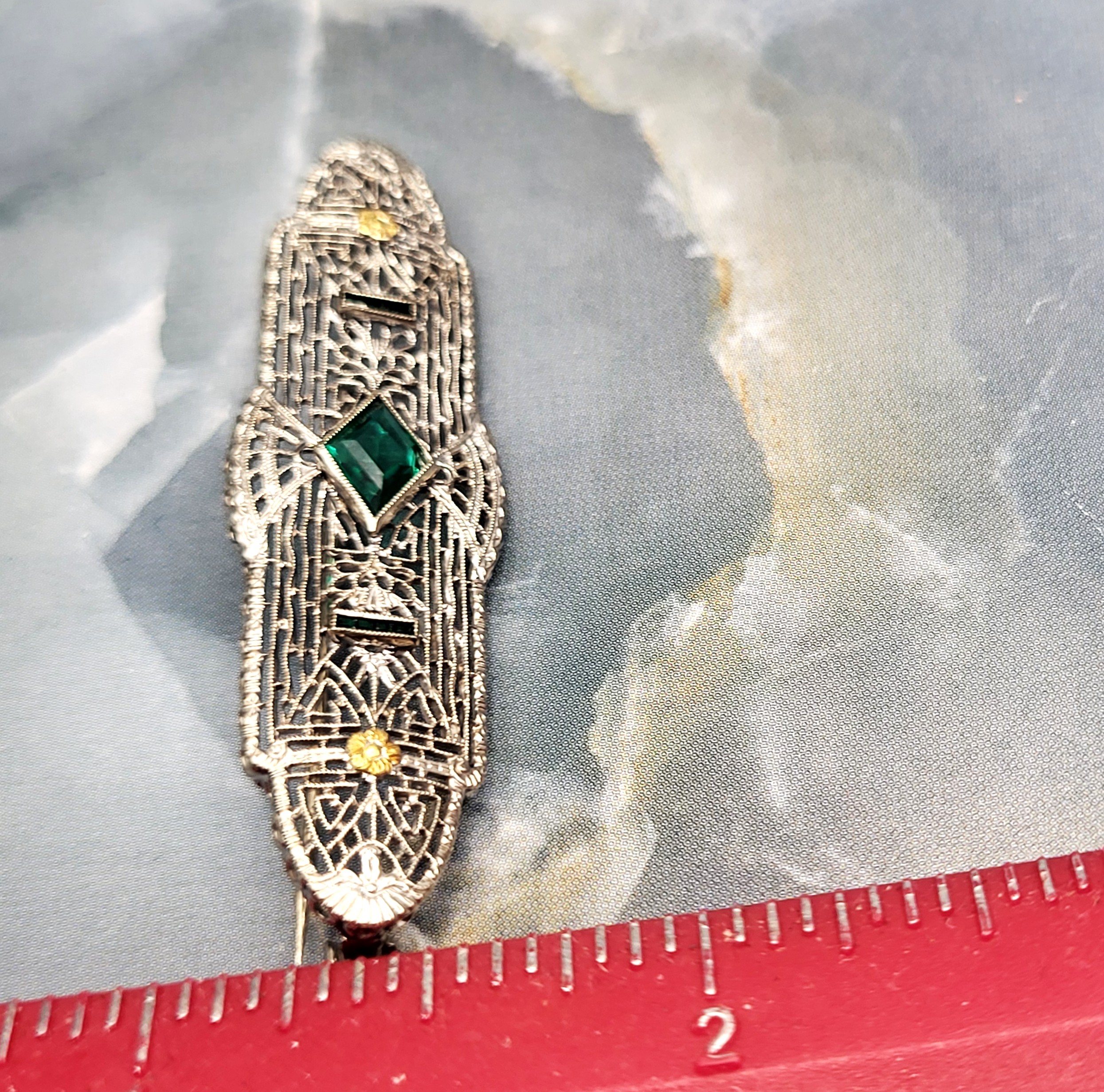 This antique bar brooch is a testament to the overlapping of the historical eras of jewelry making. It is believed to have been crafted in the middle of the Belle Epoque jewelry era, having characteristics of 4 different movements.  It is crafted in 10 karat white gold, which only became commercially available around 1910. The beautiful filigree design and use of flower designs is characteristic of late-Victorian era until  the Art-Deco era.  The brooch is set with emerald simulants that were wildly popular as cinema and movie stars began influencing fashion to the general public instead of kings, queens, princes, and princesses.  The centralized arches along the length of the brooch represents the Art Nouveau influence on this piece, as well as the use of yellow gold for the flowers, breaking away from the traditional ‘white on white’ look. The production of kite-shaped gemstones had just begun, although they became more popular about a decade later, in the Art Deco movement.  The attached C-clasp with a lever safety closure is further indication that this brooch was crafted around 1910. This brooch has passed through over 100 years of history.  It was probably worn daily for decades, stored for several more decades in a long-forgotten jewelry box, and is certainly ready to be worn again! It has minimal damage for its age, and is still in wearable condition.