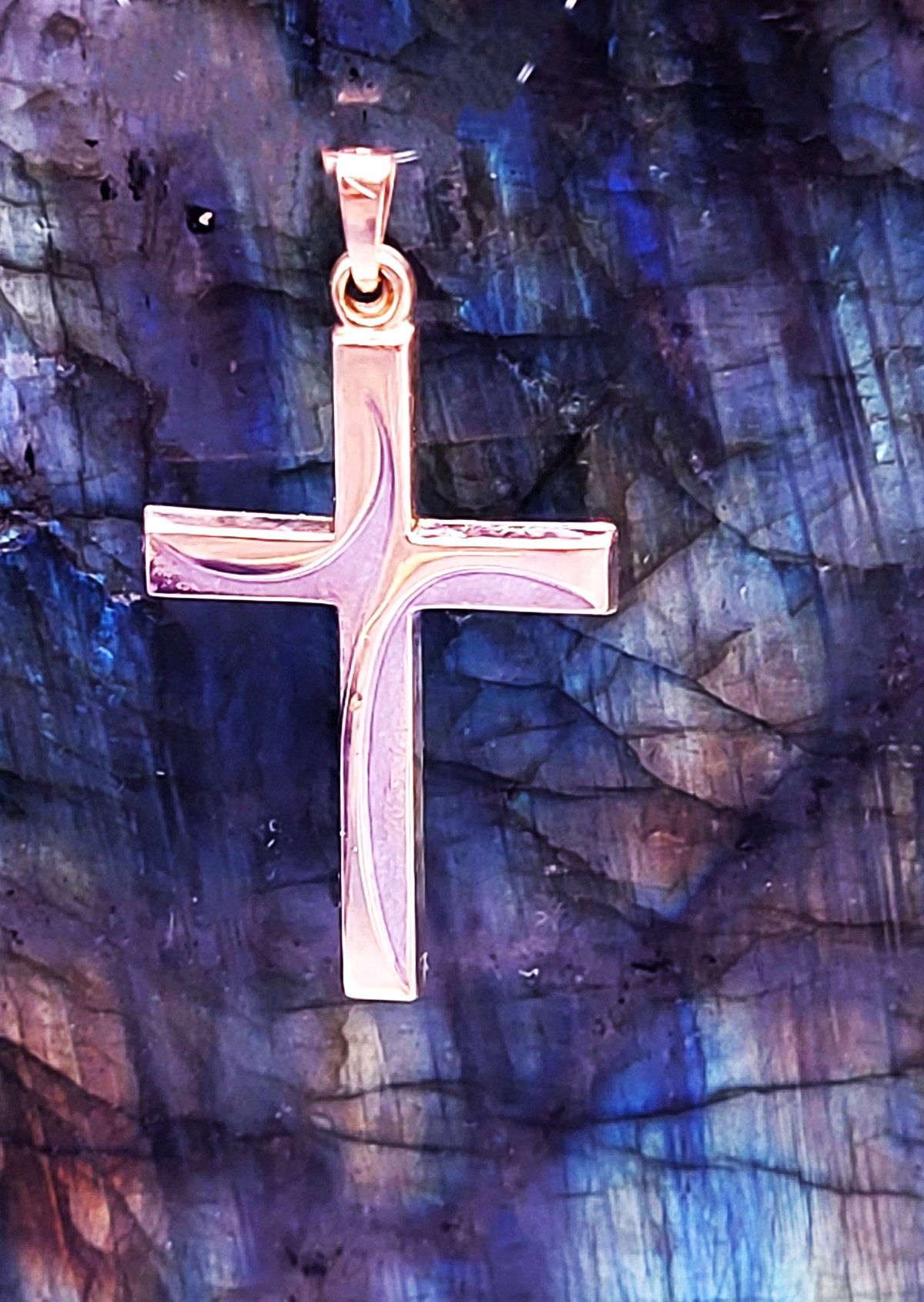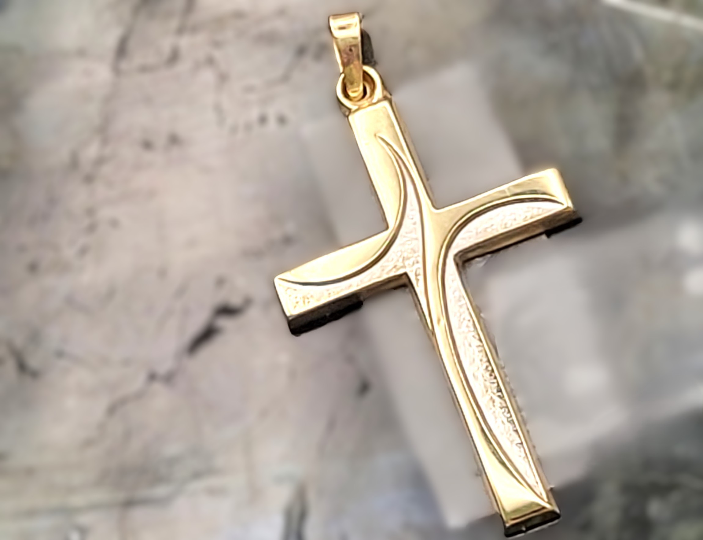 This 14 karat two-tone gold cross is modestly-sized, yet so attractive with the raised, swirled, bypass representation of the crucifix. The swirled design joins smooth, polished yellow gold with finely textured white gold. The cross is approximately 1.5" x .75" and has a solid bail that can accommodate an approximate 2.75mm chain. The pendant is stamped with the gold quality and hallmark on the back. 1.13g. Admin: TV4/og