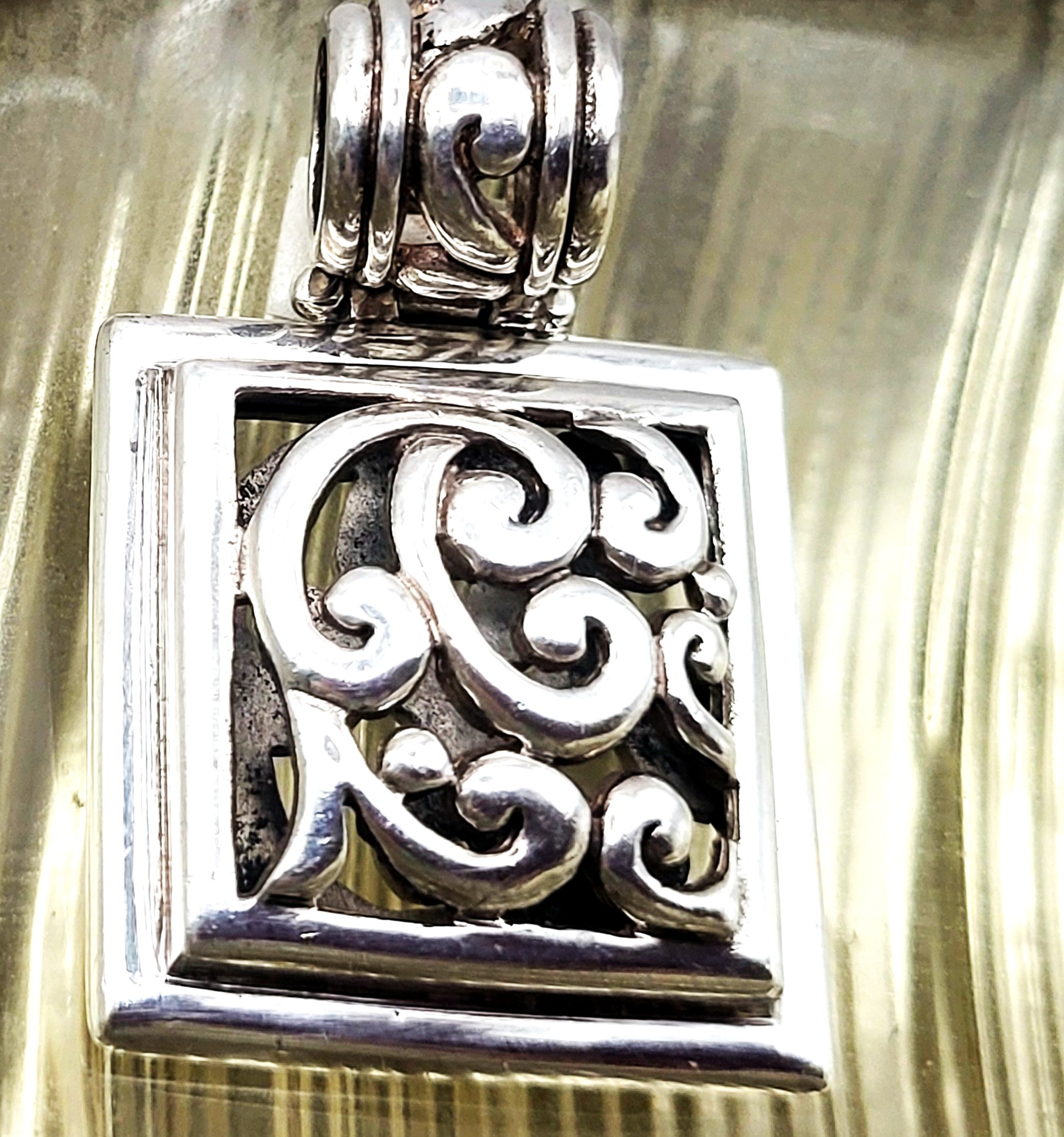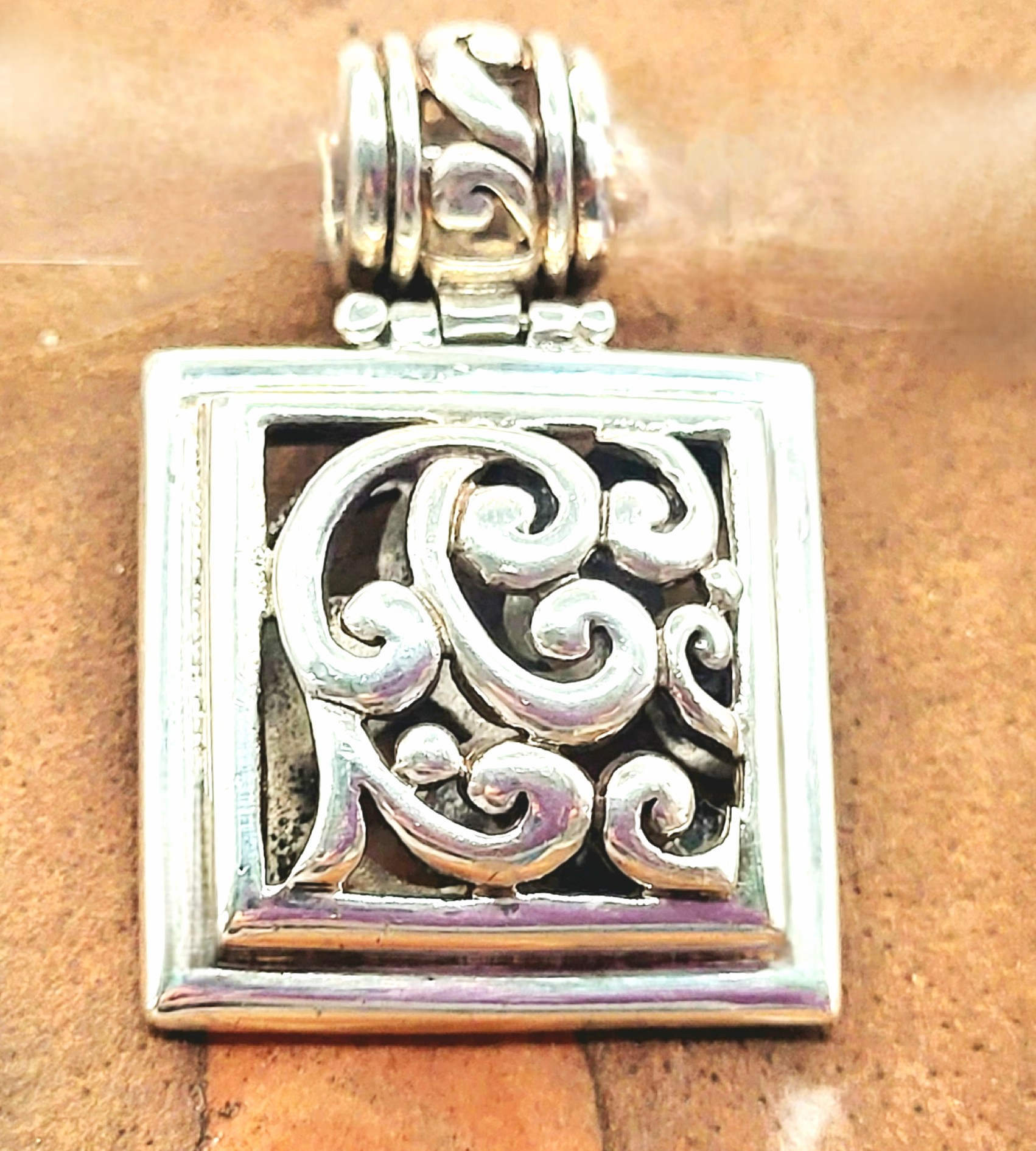A bold designer piece by Melanie Barse Gobril of Texas, USA, crafted in die-struck sterling silver (.925). This reticulated square pendant measures 1" x 1" and weighs an impressive 20.62 grams, offering both substance and style. The hinged bail allows the pendant to rock gently back and forth, accommodating chains up to 5.5 mm wide for versatile wear. With its textured artistry and distinctive hallmark, this Barse creation embodies modern craftsmanship and collectible appeal. See sizing details and other information below. AdminCode: 19310/