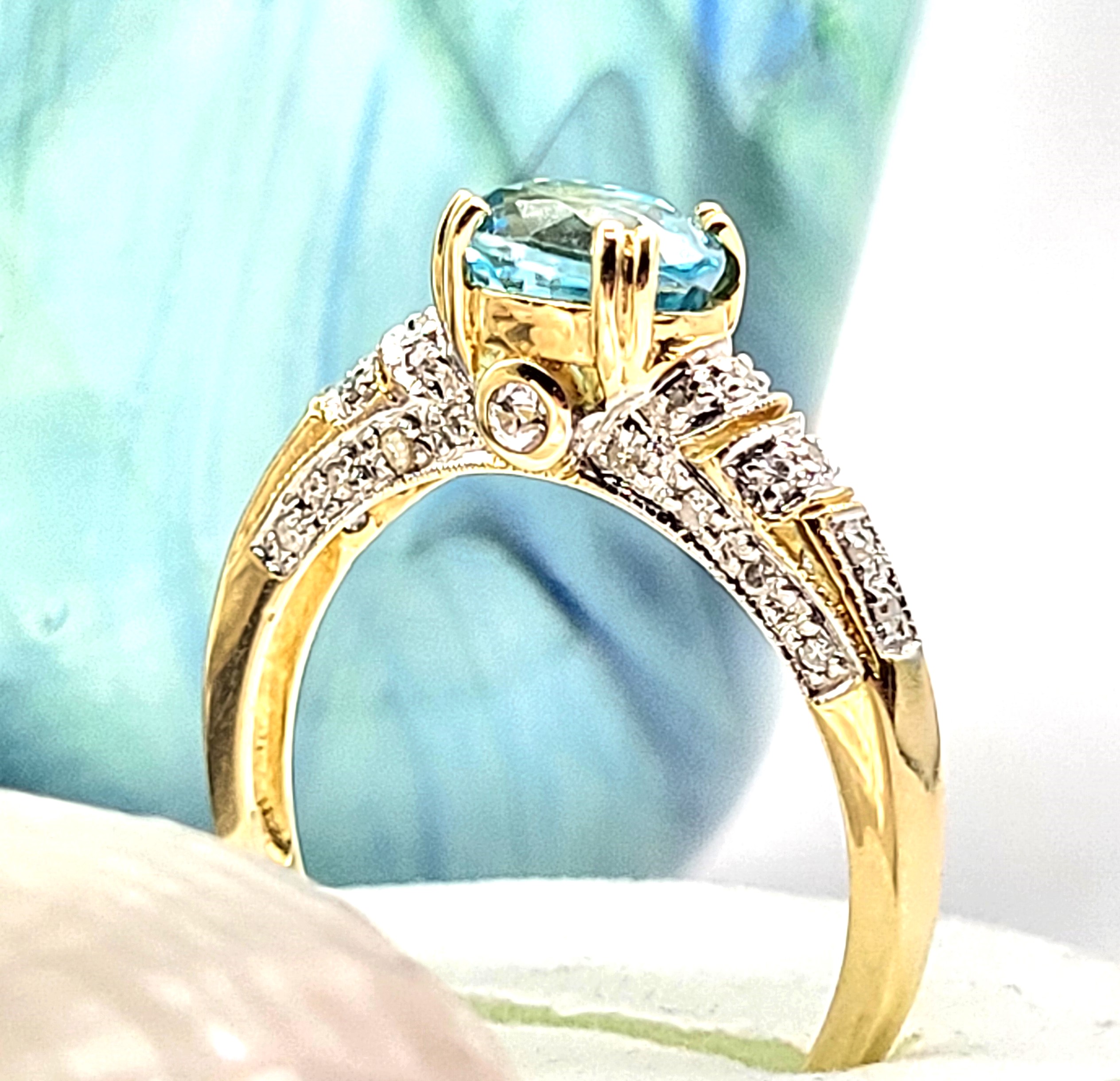 This is a 14 karat yellow gold ring that features a gorgeous oval-cut, East-West set with double prongs, genuine blue zircon, approximately 2.00 carats. There are .25 carats total weight of round, brilliant-cut diamonds in the bridge and along the shoulders. This ring is an approximate US size 10 and can be sized for an additional charge. Please contact Bidfair Fine Jewelry for sizing details.This is a brand new item that has been held in back stock. It is in excellent condition, but may have minor signs of storage, such as fine scratches or patina. 4.15 grams.  Admin: 33110/10lh