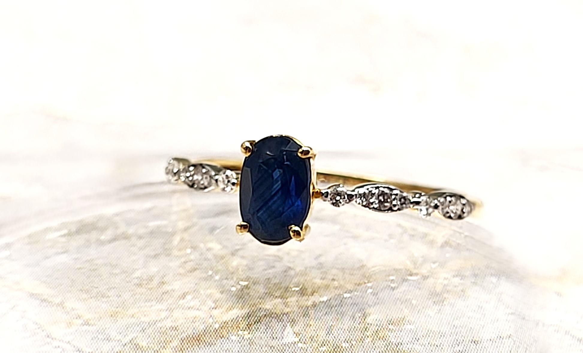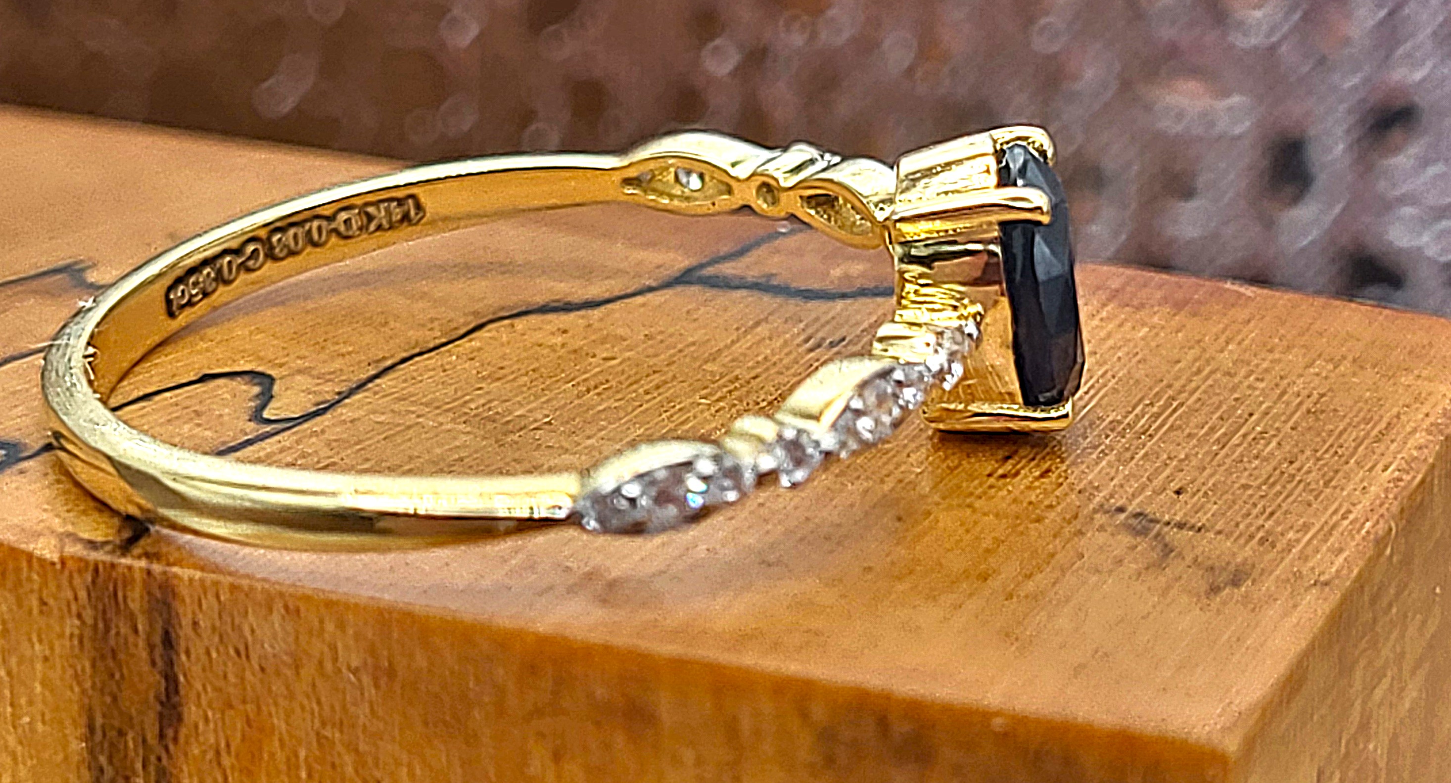 This 14 karat yellow gold ring features a .85 carat, oval-cut, genuine blue sapphire that is prong-set between .08 round, brilliant-cut, I color, SI2 clarity diamonds that are asymmetrical in size and in a wavy design on the shoulders. The ring is US size 7 with an approximate 1.7mm shank. See sizing options and other information below. 1.37g Admin: NAP994/3.85-nln