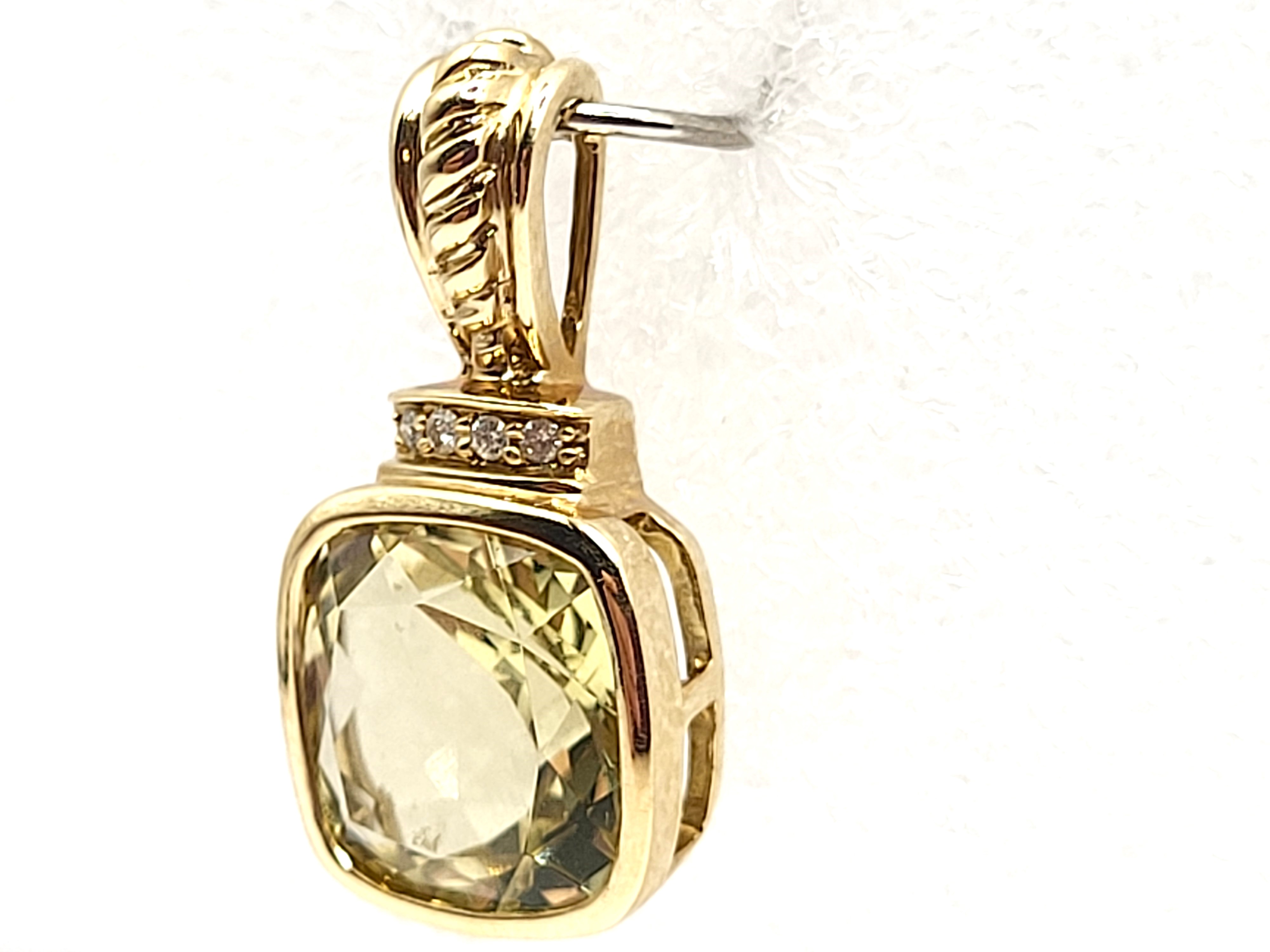 This is a 14 karat yellow gold pendant that features an illuminating 3.36 carat cushion-cut, bezel-set lemon quartz and .02 carats total weight of round, brilliant-cut, H color, SI2-I1 clarity diamonds for accent along the topl The pendant has a solid bail with a gold bead finish that can accommodate an approximate 2.5mm wide chain. 2.2 grams