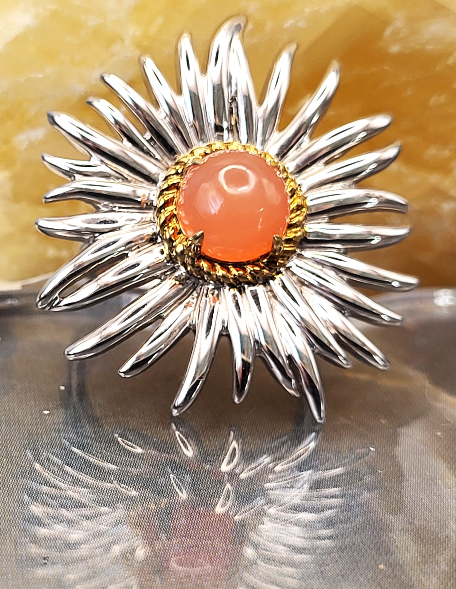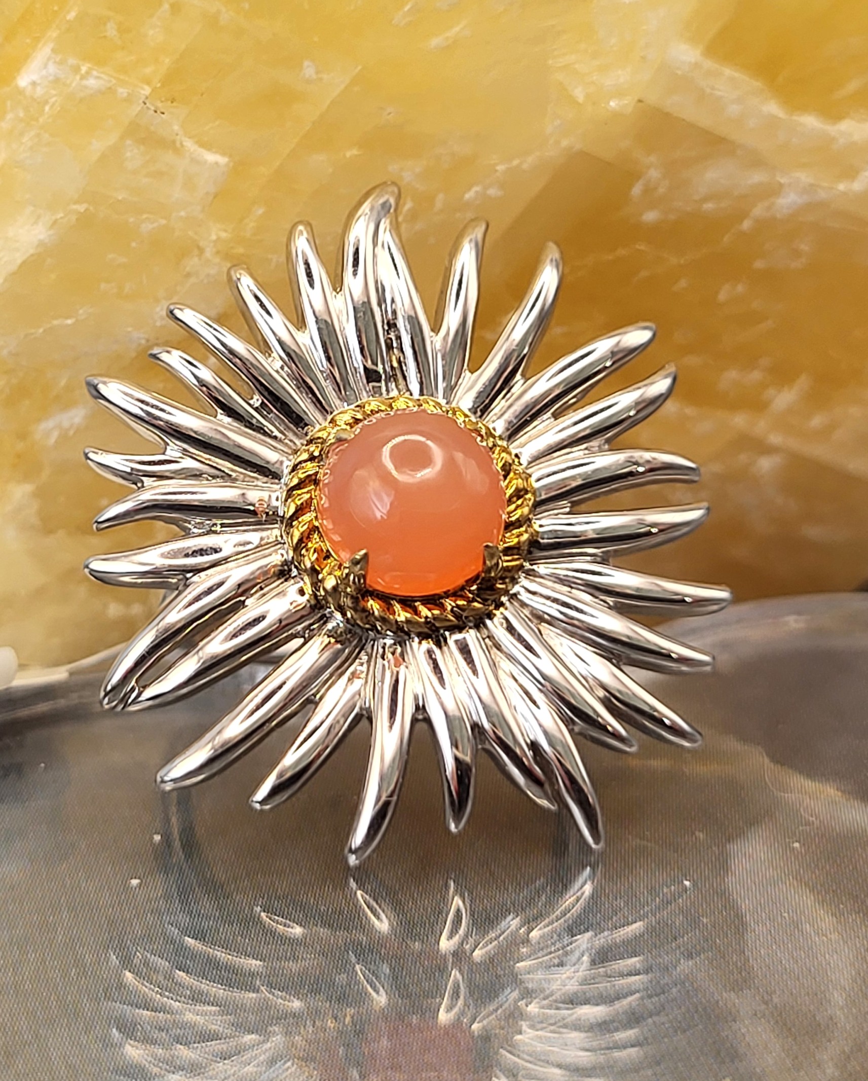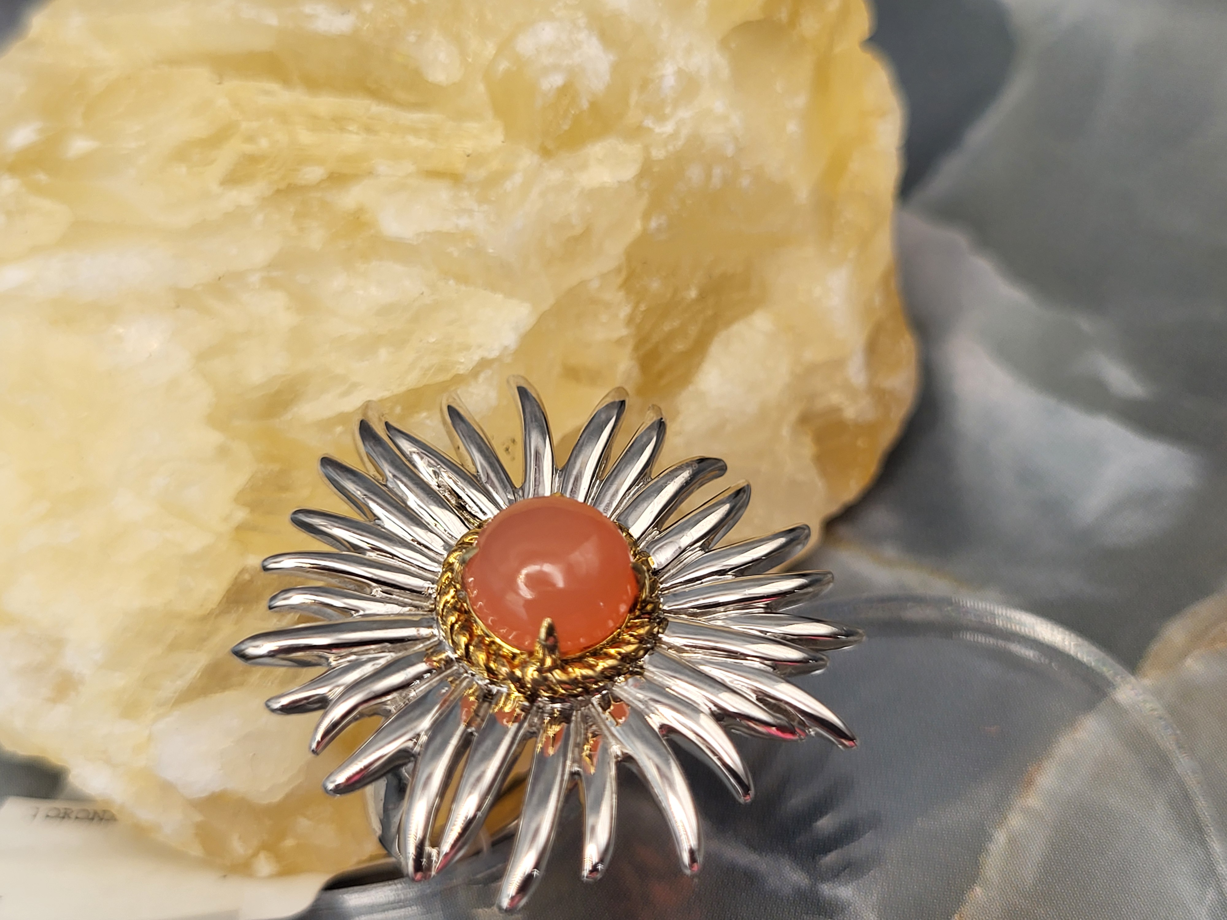 This cheerful flower ring features a radiant 1.64 carat half-cabochon orange onyx nestled at the center of silver-toned petals, accented with claw-set yellow gold details. The sterling silver band adds contrast and charm, while the floral design—reminiscent of an aster in full bloom—makes this piece feel both artistic and approachable. At size 7.25, it’s bold, bright, and delightfully wearable. AdminCode: KHR6282/