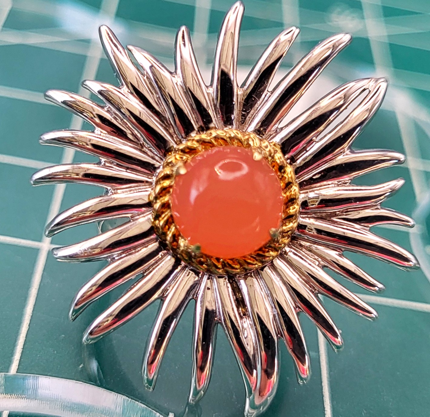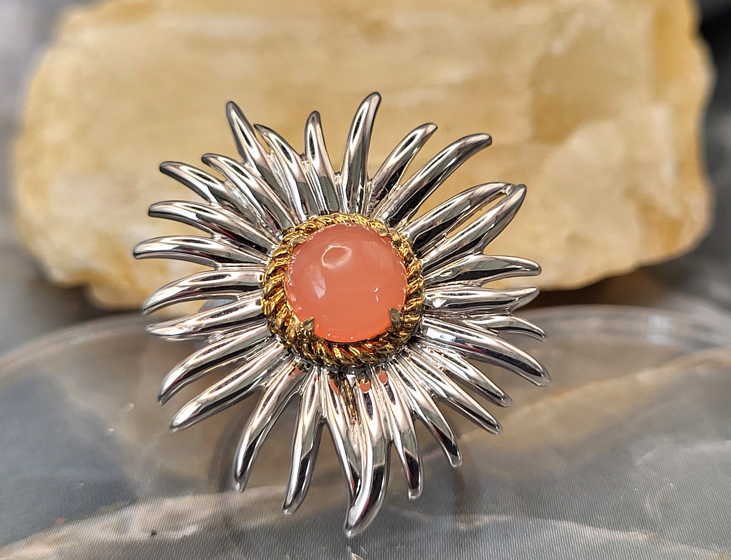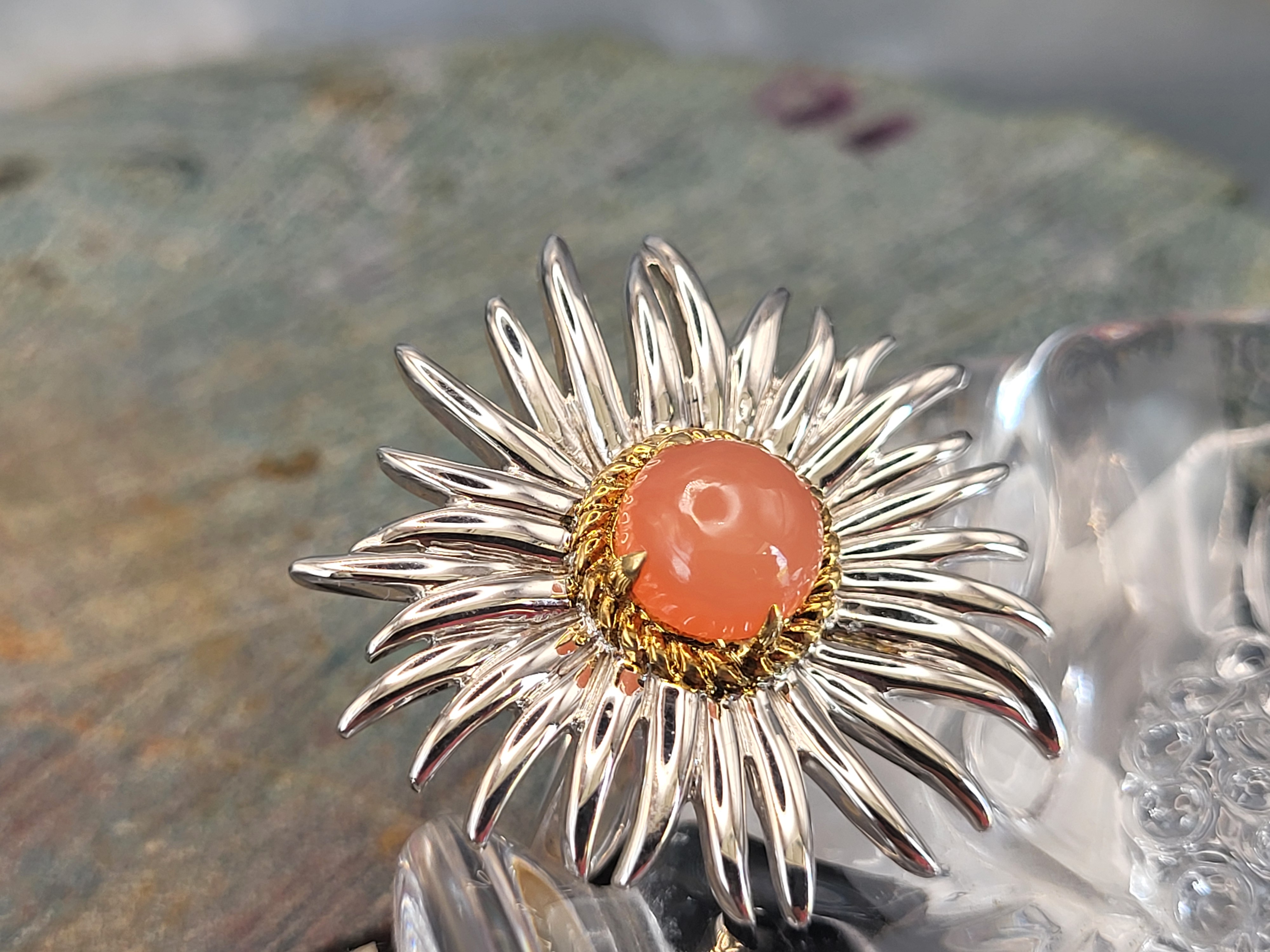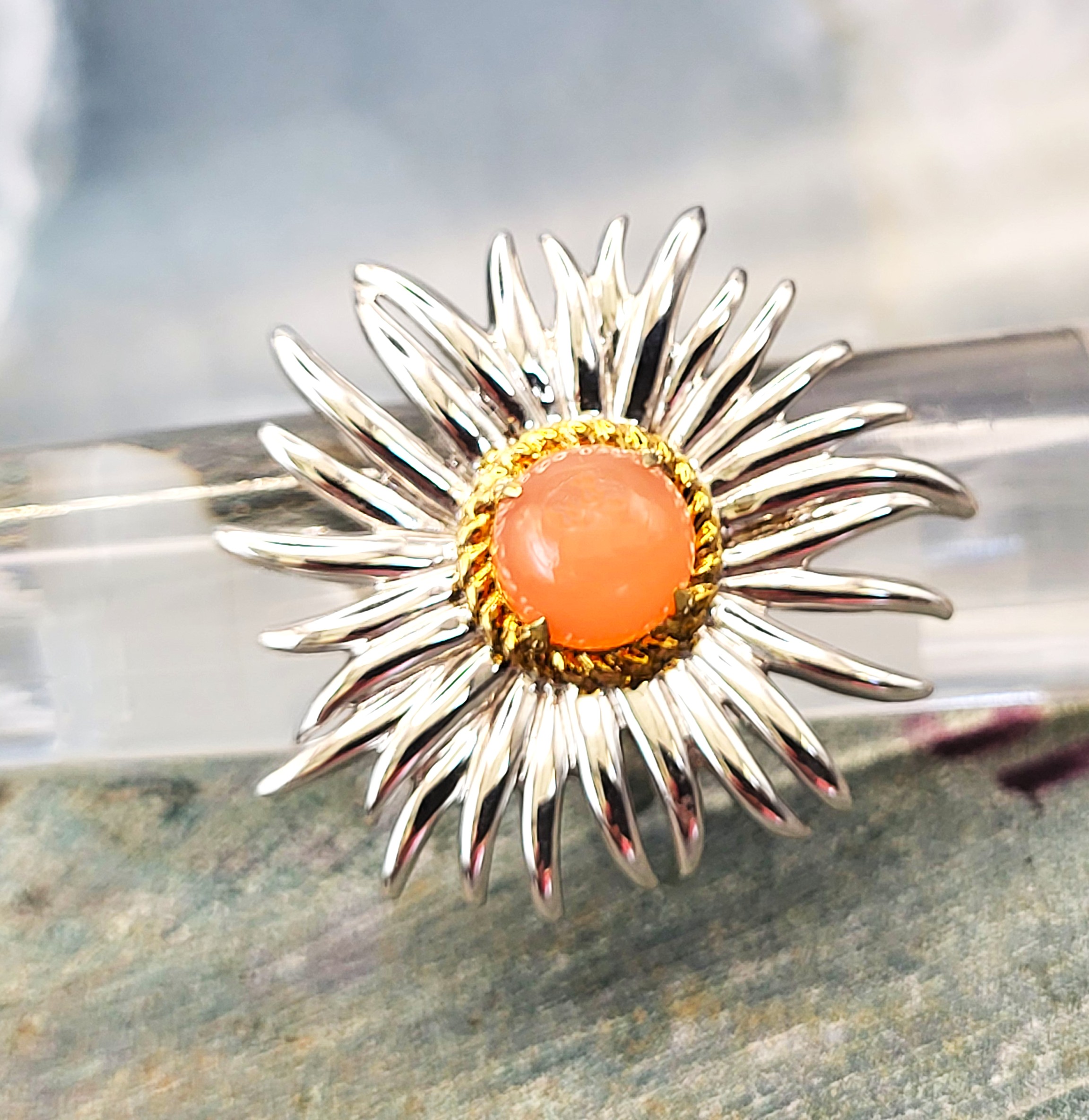 This cheerful flower ring features a radiant 1.64 carat half-cabochon orange onyx nestled at the center of silver-toned petals, accented with claw-set yellow gold details. The sterling silver band adds contrast and charm, while the floral design—reminiscent of an aster in full bloom—makes this piece feel both artistic and approachable. At size 7.25, it’s bold, bright, and delightfully wearable. AdminCode: KHR6282/