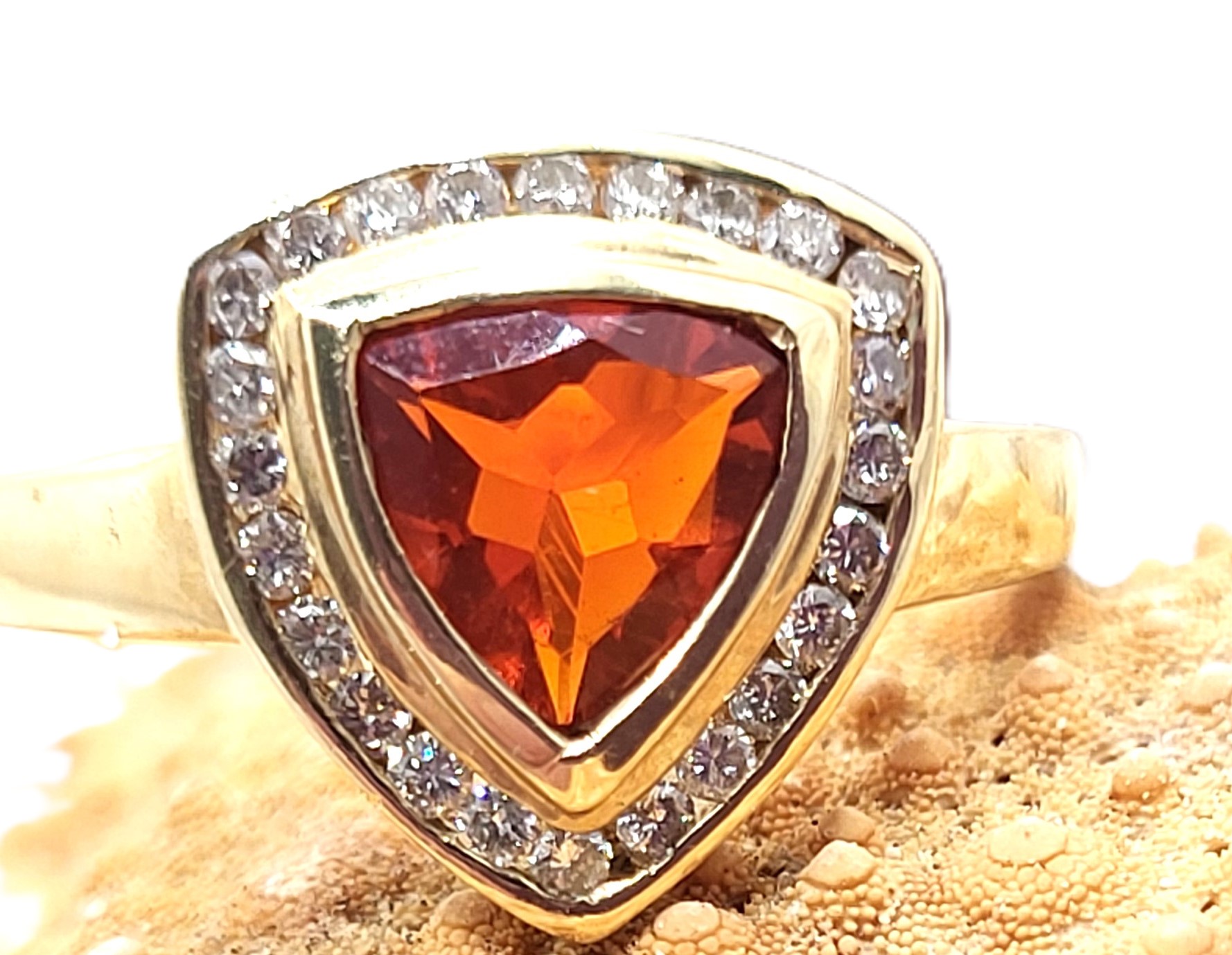 This 14 karat yellow gold ring presents an approximate .50 carat, trilliant-cut, bezel-set, bright orange Fire Opal with a frame of approximately .25 carats total weight, round-brilliant-cut, approximate H-I color, I1 clarity diamonds. This ring is US size 6.5 and can be sized. See below for sizing details and other information. Admin: 3110/12bnn