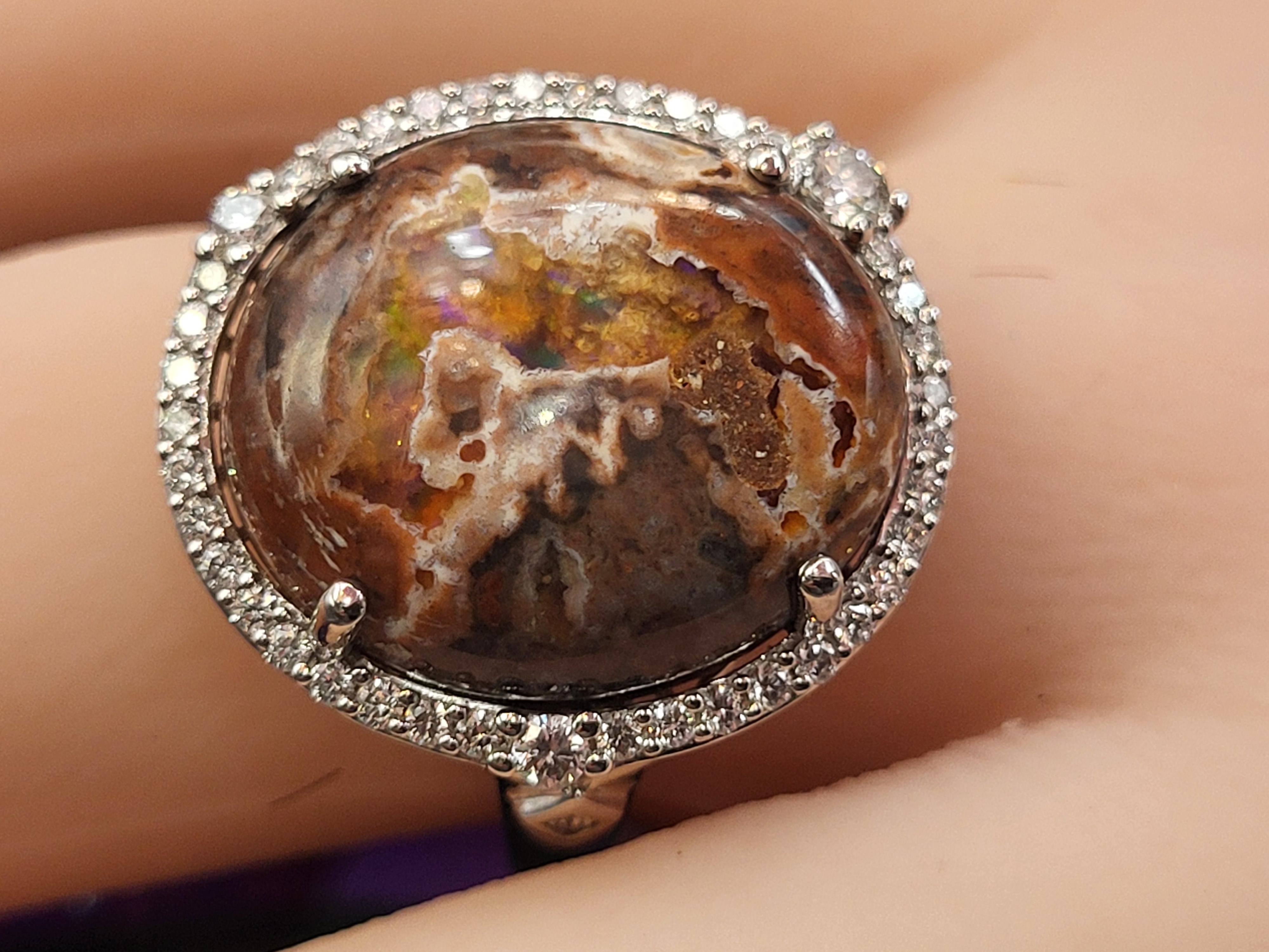 A mesmerizing 12.53 carat “Dragon Egg” gemstone anchors this sterling silver ring, radiating earthy tones and fiery patterning. Whether opal or pure legend, its swirling depths evoke ancient magic. Encircling the centerpiece is a halo of round, brilliant-cut diamonds (G-H color, SI1 clarity, Ideal Cut), adding shimmer and contrast to the stone’s organic fire. A bold statement piece for collectors who crave mystery and brilliance. This ring is US size 7 and an elaborate under gallery. See sizing options and other information below. AdminCode: 6282/18-brrr