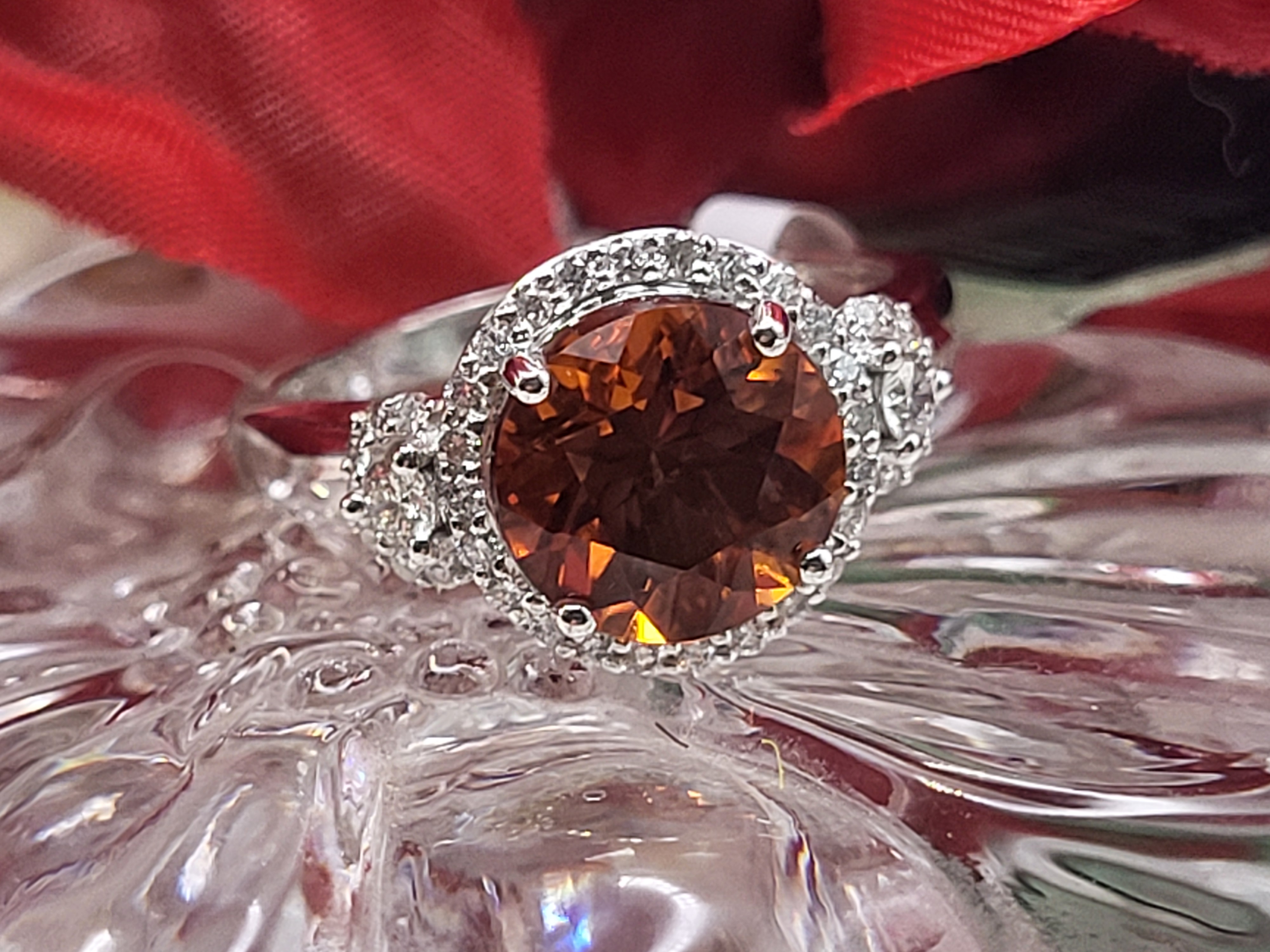 A sunlit ember in a winter setting. This 2.47 ct round Madeira citrine radiates warmth, encircled by a .33 ctw halo of round, brilliant-cut diamonds (G color, SI1 clarity). Set in 18K white gold (4.49g), size 7, with a swirled open gallery and supportive undergallery. See sizing details and other information below. AdminCode: 6282/3-rrr