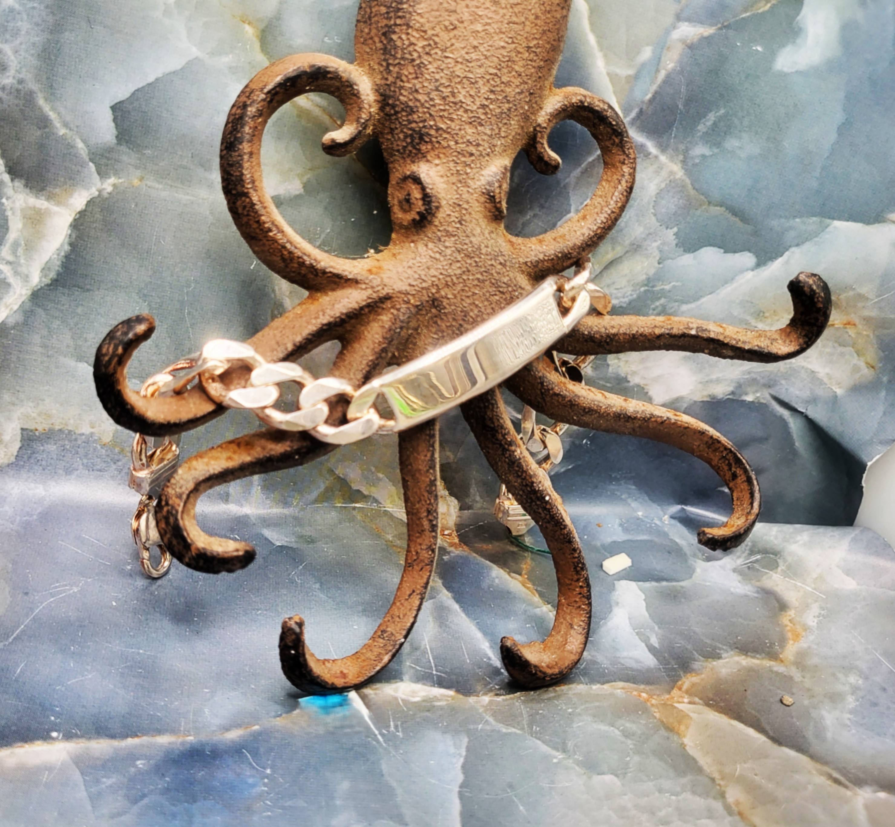 This is a sterling silver bracelet with intermittent curb links with an elongated link, as in a modified figaro design. Cast from Italian sterling silver with a curved, solid bar for engraving. The bracelet is 9" long with a lobster clasp.