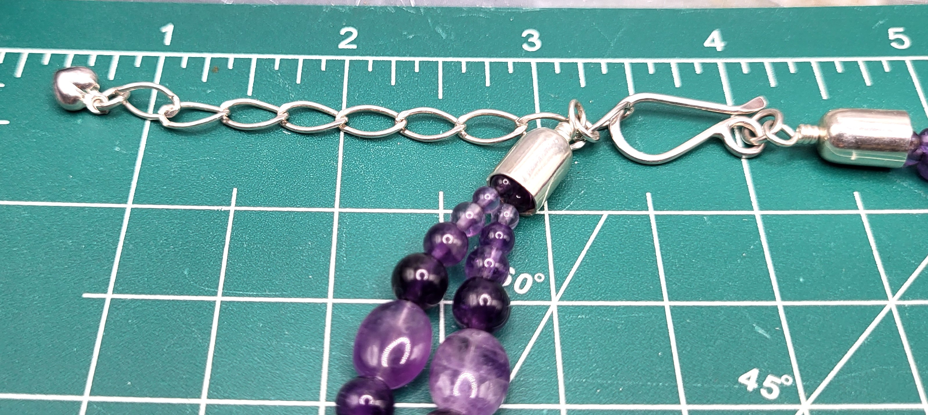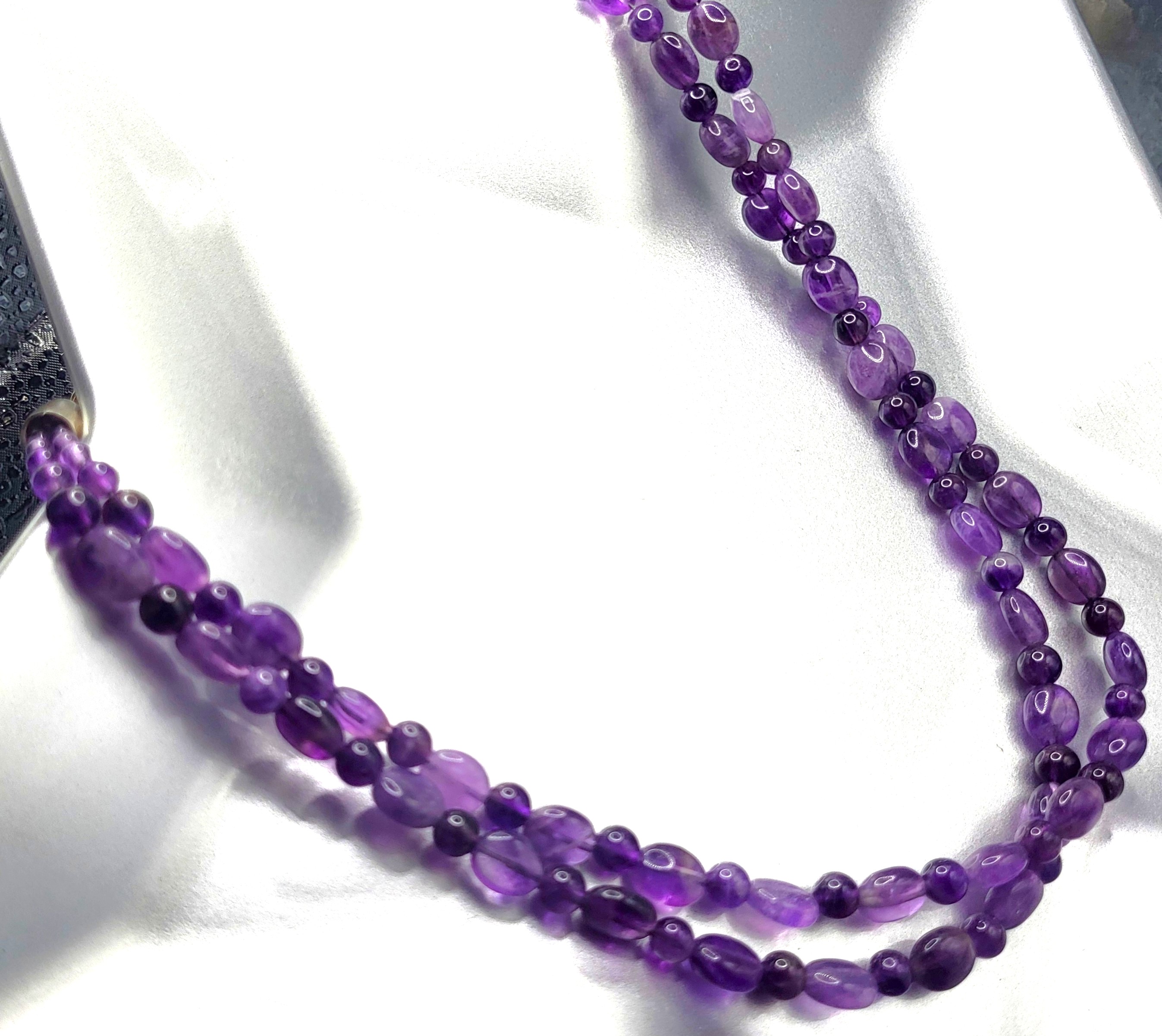 This necklace is strung with graduating sizes of round and oval, polished beads, strung on 2 strands that are approximately 18" with an additional 2" sterling silver link extender. The necklace latches with wire hook that attaches to the links, which are secured to the end caps. Admin: 33119/6lg