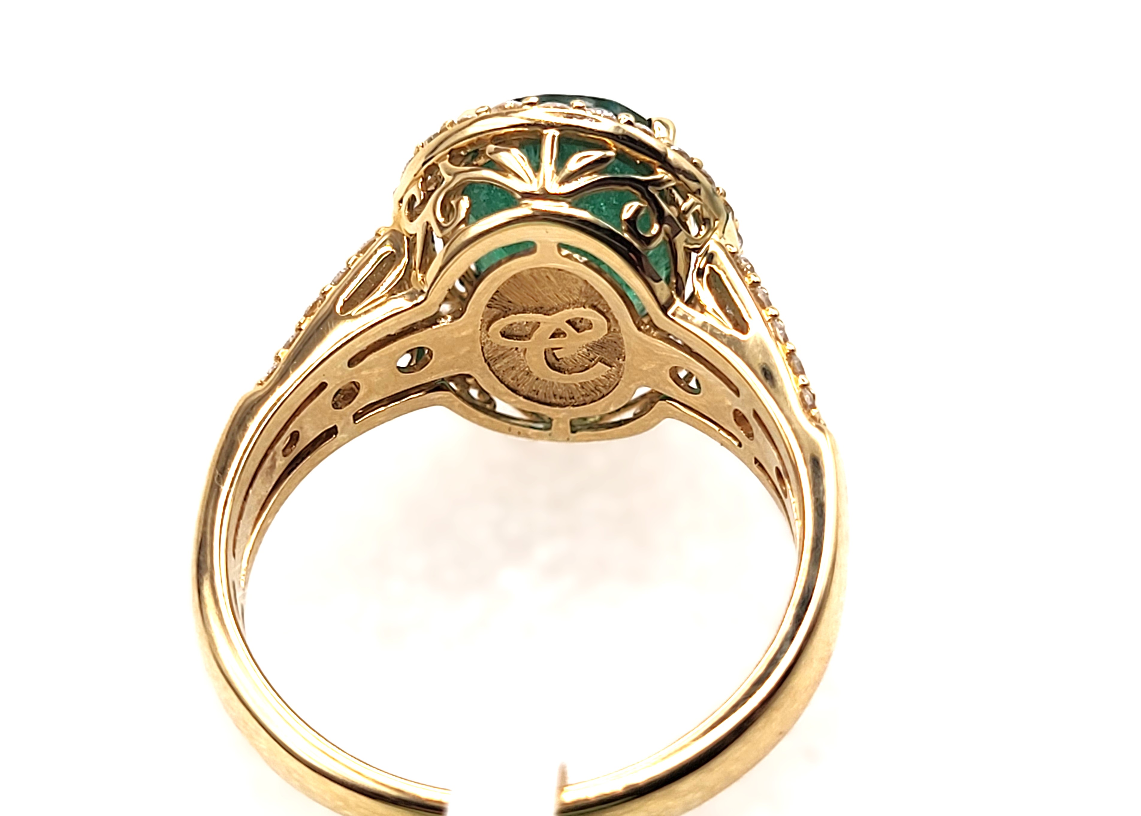 A regal masterpiece in 18K yellow gold, size 7, weighing 5.75 grams. The centerpiece is a vivid 3.7 ct oval-cut emerald, held in claw prongs and framed by a halo of .47 ctw round brilliant-cut diamonds (G color, SI1 clarity). Diamonds continue along the sculpted shoulders, adding brilliance and balance to the design. The supportive under gallery ensures comfort and durability, while the rich green hue of the emerald evokes timeless elegance. A crown jewel for collectors of refined taste. See sizing details and other information below. AdminCode: 6282/22