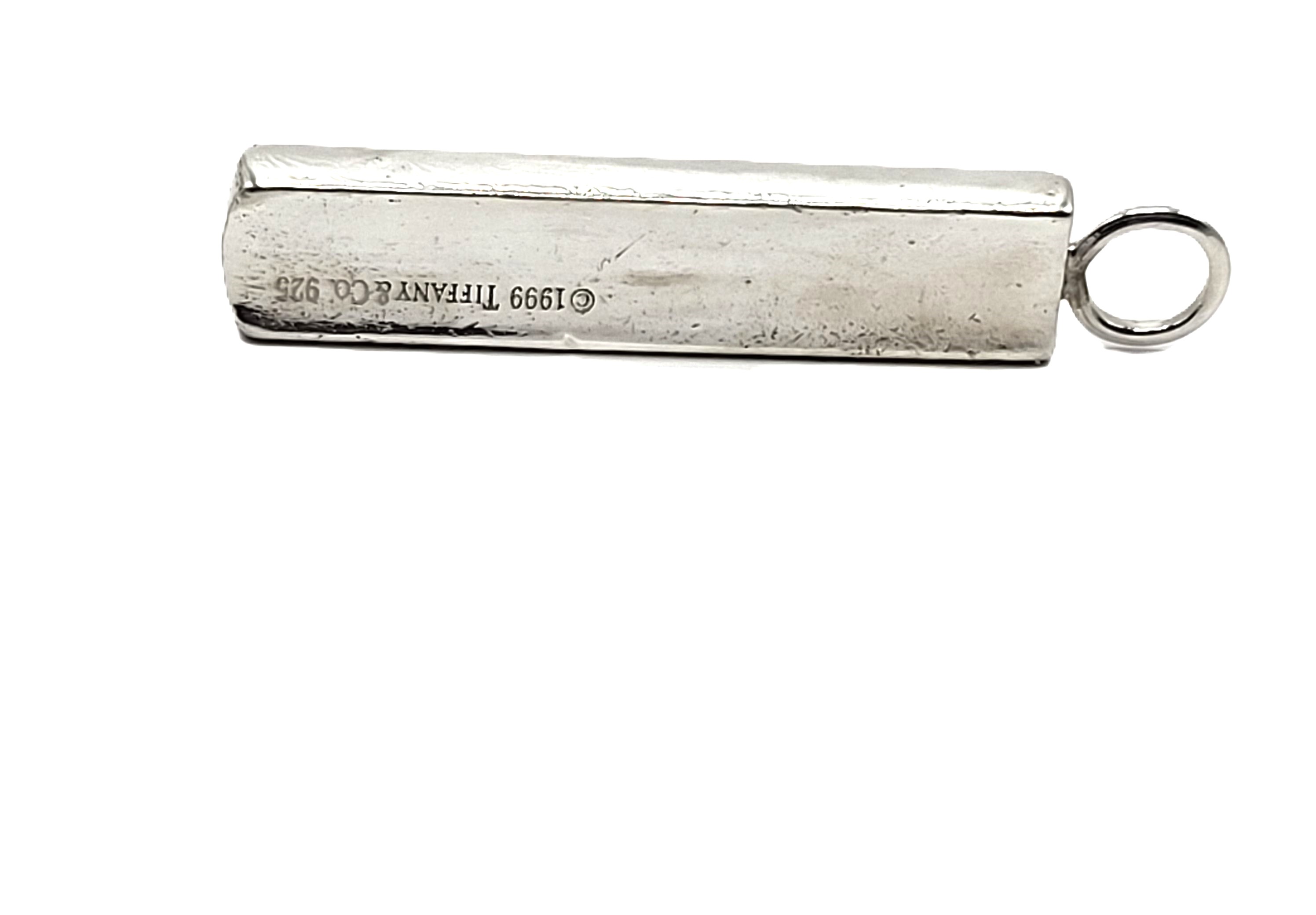 This is a vintage sterling silver Tiffany & Co. keychain fob that could also be worn as a pendant or used as a fob for a purse or tote. The bar is approximately 2.25" X 1/2" and engraved "T & CO 1837 with the .925 marking on a concave surface. It is approximately 5.25mm thick with a soldered ring at the top has an opening that is approximately 6.75mm. This is an estate item that has evidently been loved. It has noticeable dents and scratches that are to be expected on a metal as soft as sterling silver. However, it remains a remarkable item that can still be enjoyed for years to come! Admin:F1226/25hhh1