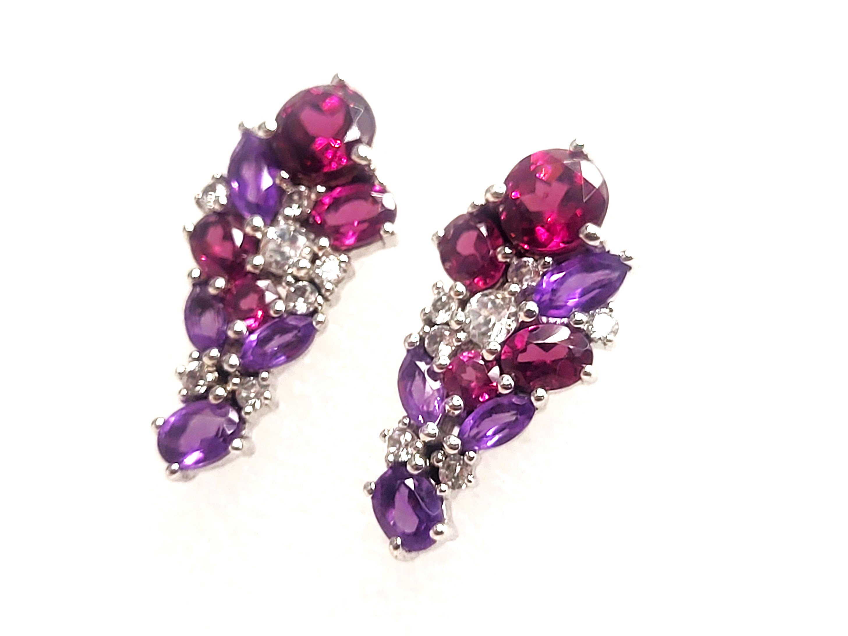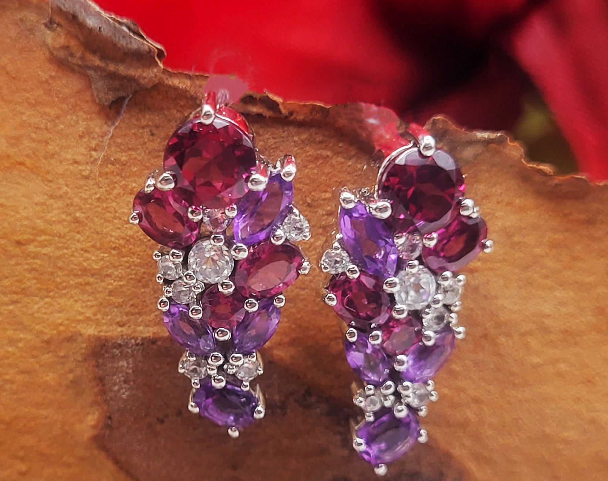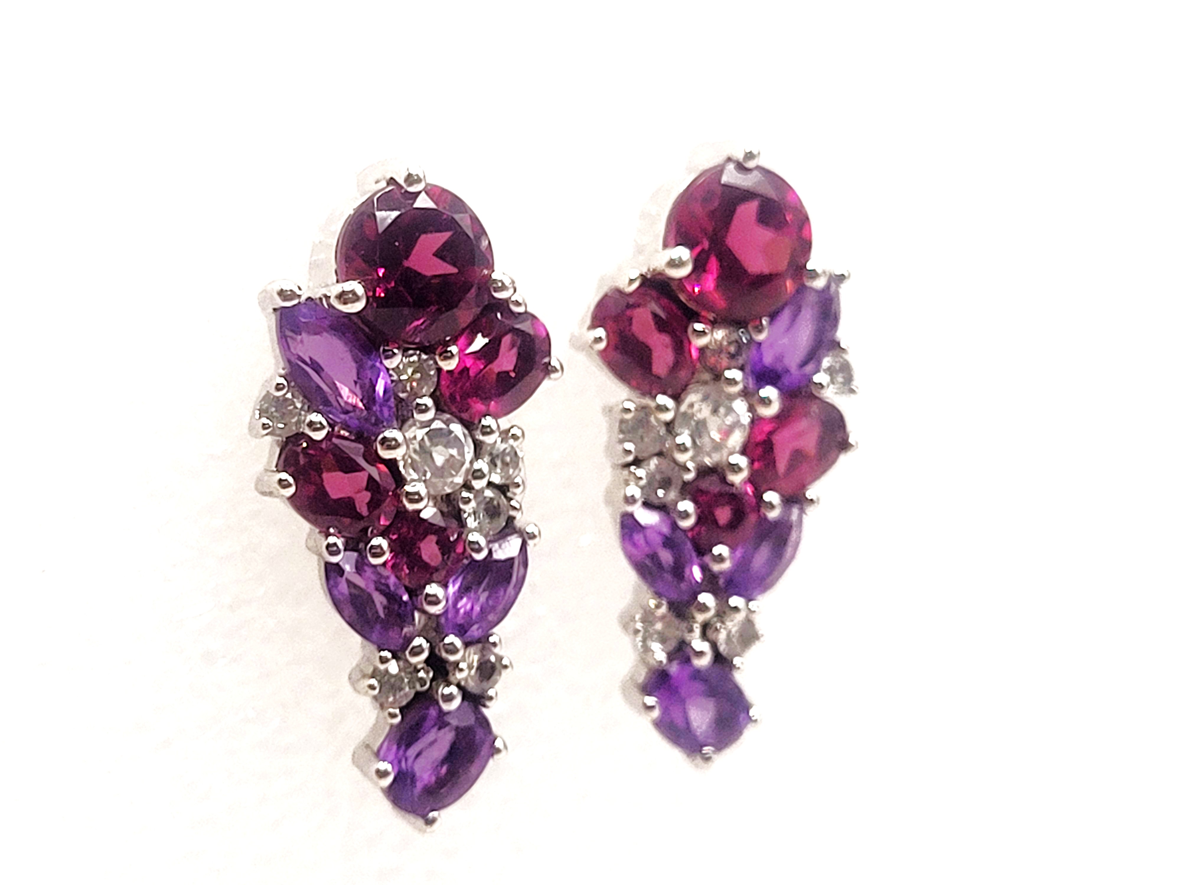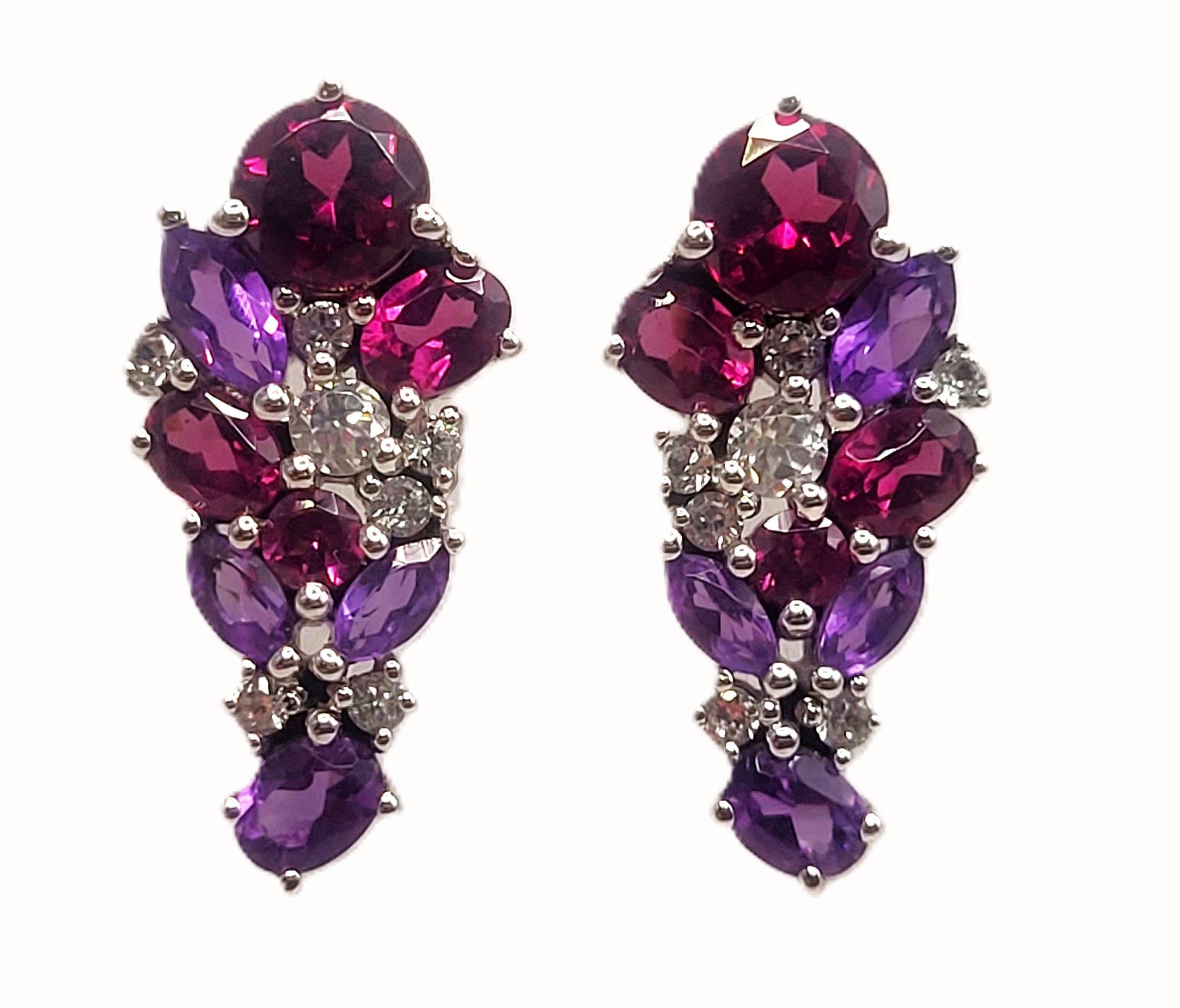 These sterling silver earrings are perfect for everyday wear. The rich shades of purple and burgundy shown in the 1.58 carats total weight oval- and marquise-cut genuine amethysts and 1.91 carats total weight of round- and oval-cut genuine rhodolite garnets say "wear me in any season". The contrasting gleaming sparkle provided by the .36 carats total weight round, faceted, genuine white zircon, give the earrings the look of dew-covered grapes hanging from the vine in the morning sun, calling "Wear me to the wine-tasting event this weekend"! Less than 1" long, they are easy for you to wear, but hard for everyone else to take their eye off of! These earrings attach to the earlobe with posts and friction backs. 4g. AdminCode: 6282/33-gr