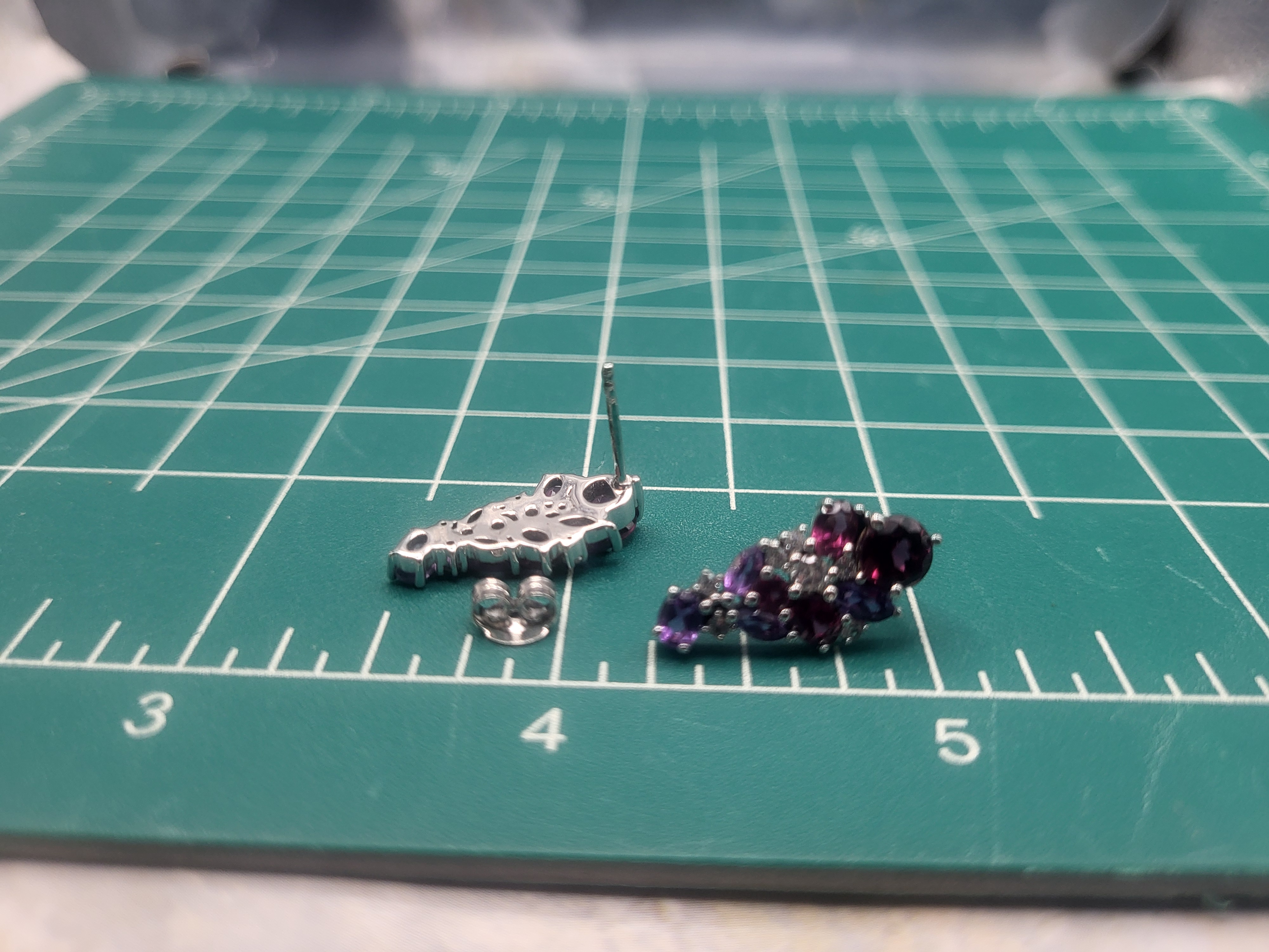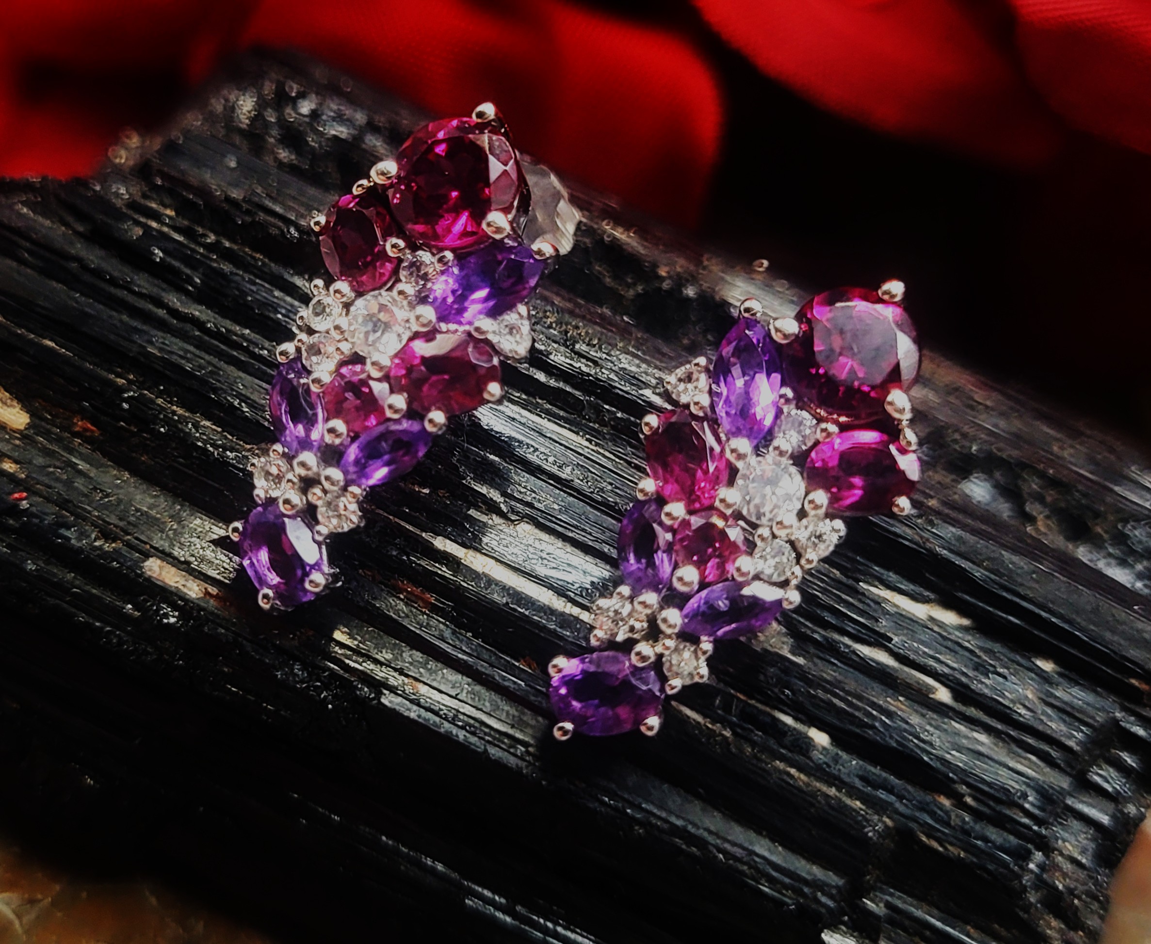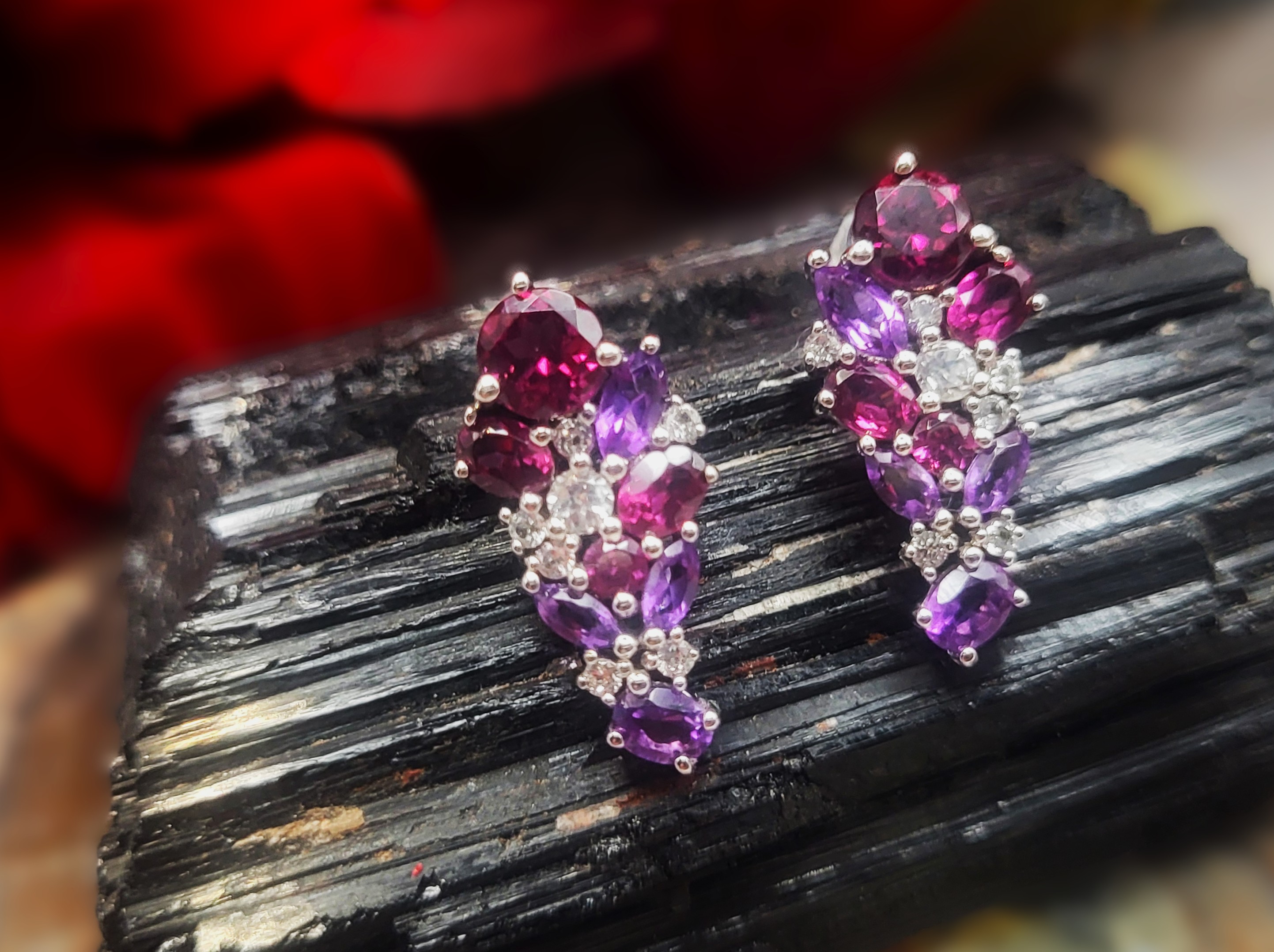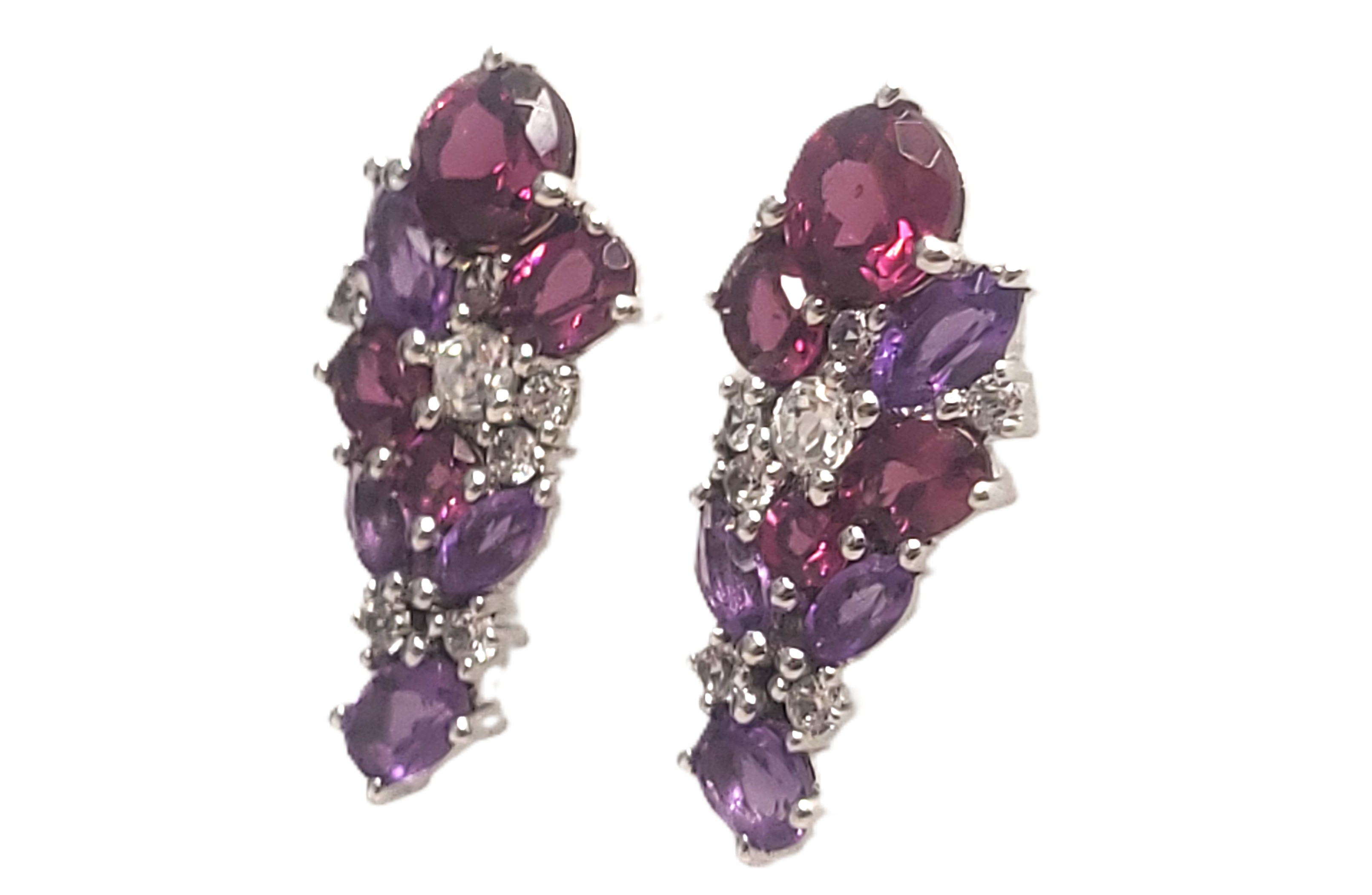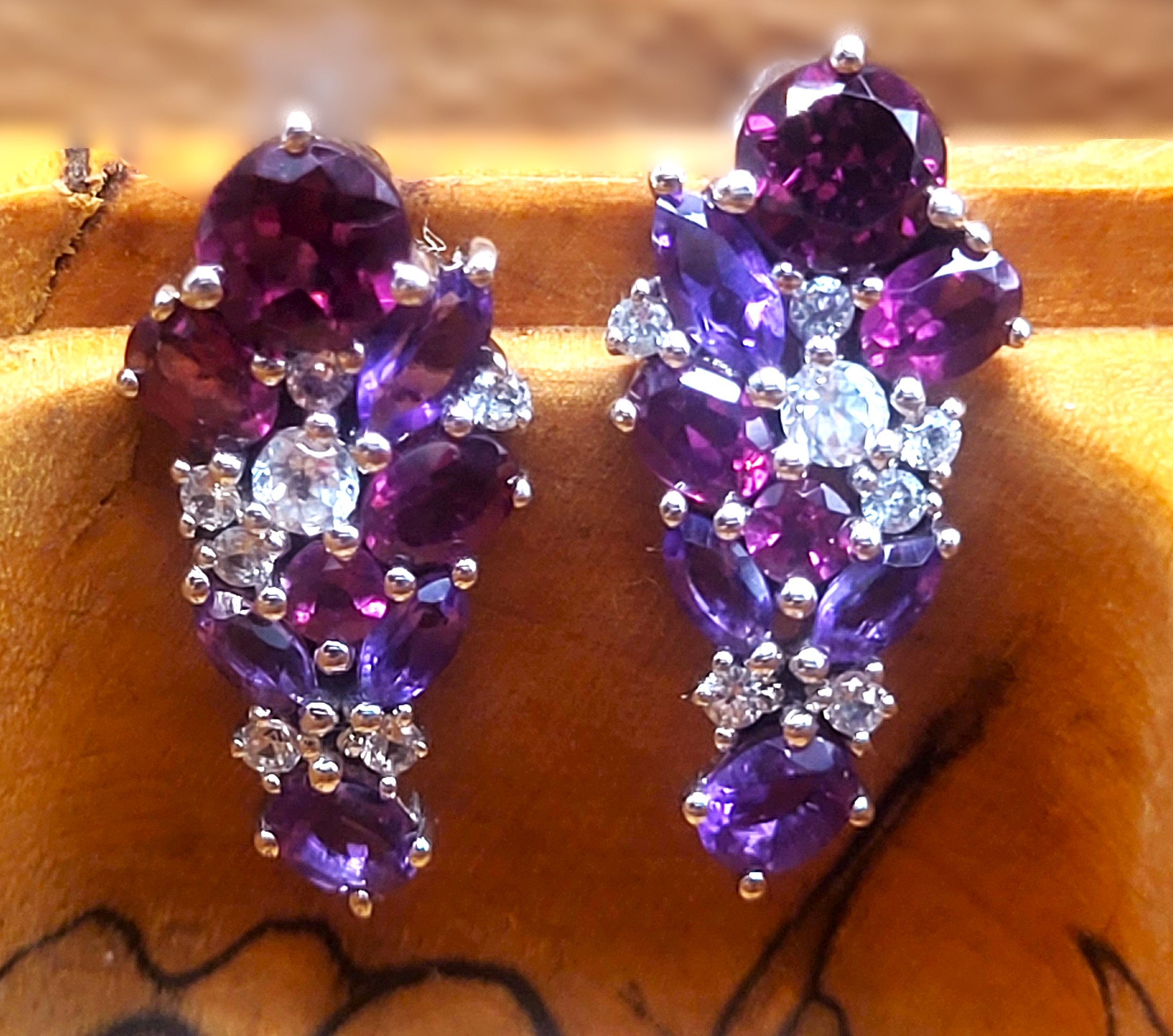 These sterling silver earrings are perfect for everyday wear. The rich shades of purple and burgundy shown in the 1.58 carats total weight oval- and marquise-cut genuine amethysts and 1.91 carats total weight of round- and oval-cut genuine rhodolite garnets say "wear me in any season". The contrasting gleaming sparkle provided by the .36 carats total weight round, faceted, genuine white zircon, give the earrings the look of dew-covered grapes hanging from the vine in the morning sun, calling "Wear me to the wine-tasting event this weekend"! Less than 1" long, they are easy for you to wear, but hard for everyone else to take their eye off of! These earrings attach to the earlobe with posts and friction backs. 4g. AdminCode: 6282/33-gr