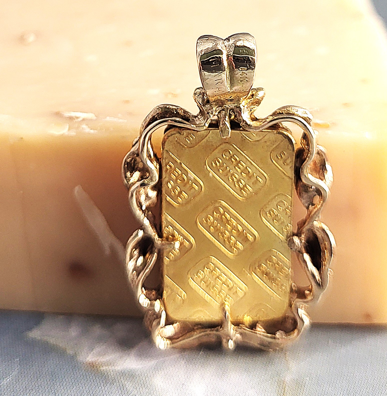 ((Pendant is likely post-1979, when Valcambi began refining the gold. The frame appears to be hand-crafted in a leaf design and a rabbit ears bail. The bail can accommodate an approximate 3mm chain. The serial number of the bar is present on the front of the bar. Although not very noticeable, close inspection shows the bar has bent a bit over the years, due to wear.)) AdminCode: AZM4/6.63-322