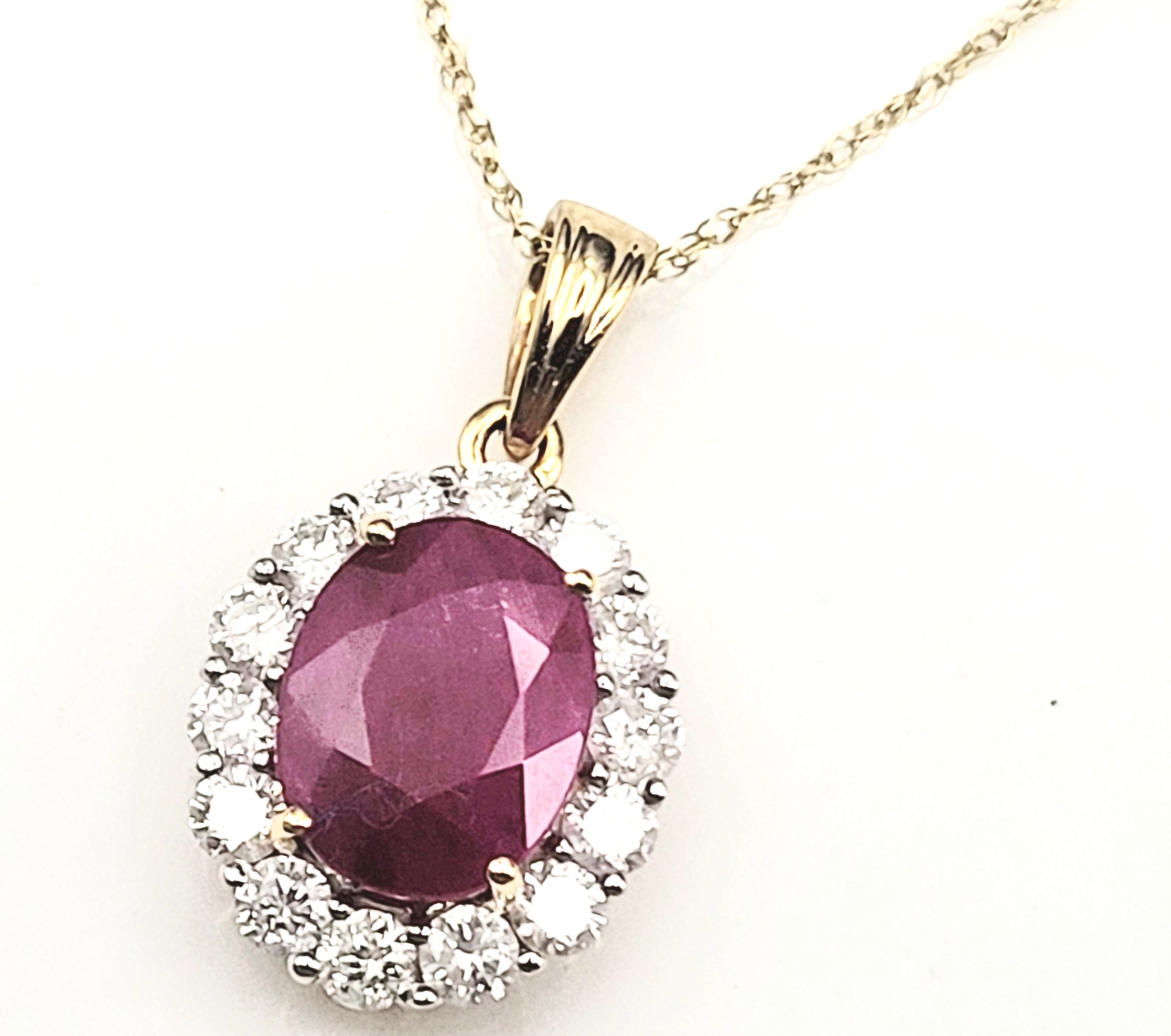 Burma rubies have long been considered one of the most treasured gemstones. So, perhaps you can treasure this 18 karat yellow gold necklace that features a semi-translucent, 2.00 carat oval-cut, genuine Burma ruby* that is prong-set in a halo of .56 carats round, brilliant-cut, H-I color, I1 color, natural diamonds. The pendant has an open back, and a raised rib gallery for support. The solid bail is attached to a fixed ring at the top of the pendant and can accommodate up to an approximate 2.75 mm chain. The pendant currently hangs from an 18 karat yellow gold, ultra-fine rope chain that is 18" long with a lobster clasp.Admin: Q5743/19-brrr – *This ruby is assumed to be heat-treated, the most common method of treating over 95% of marketable rubies.