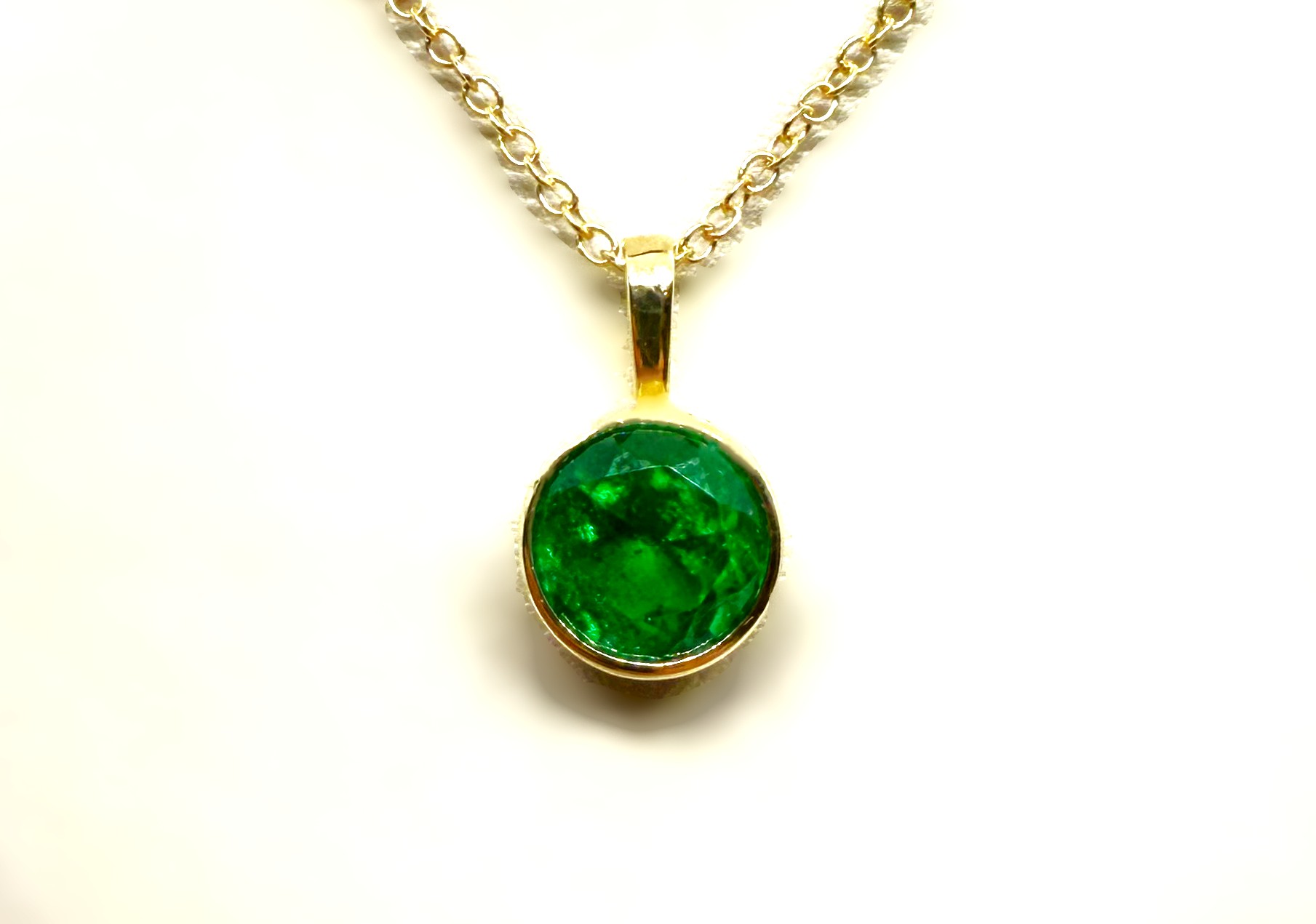 A rare breath of green from the heart of Colombia. This 2.00 ct round, faceted emerald—certified from the legendary Muzo mine—glows with vivid intensity and timeless mystique. Bezel-set in solid 14K yellow gold, the pendant features an open back to invite light through its crystalline depths. Suspended from an 18" lightweight link chain with a lobster clasp, the design is both delicate and enduring. The bail accommodates up to a 4mm chain, offering versatility without compromising elegance. See sizing details and other information below.