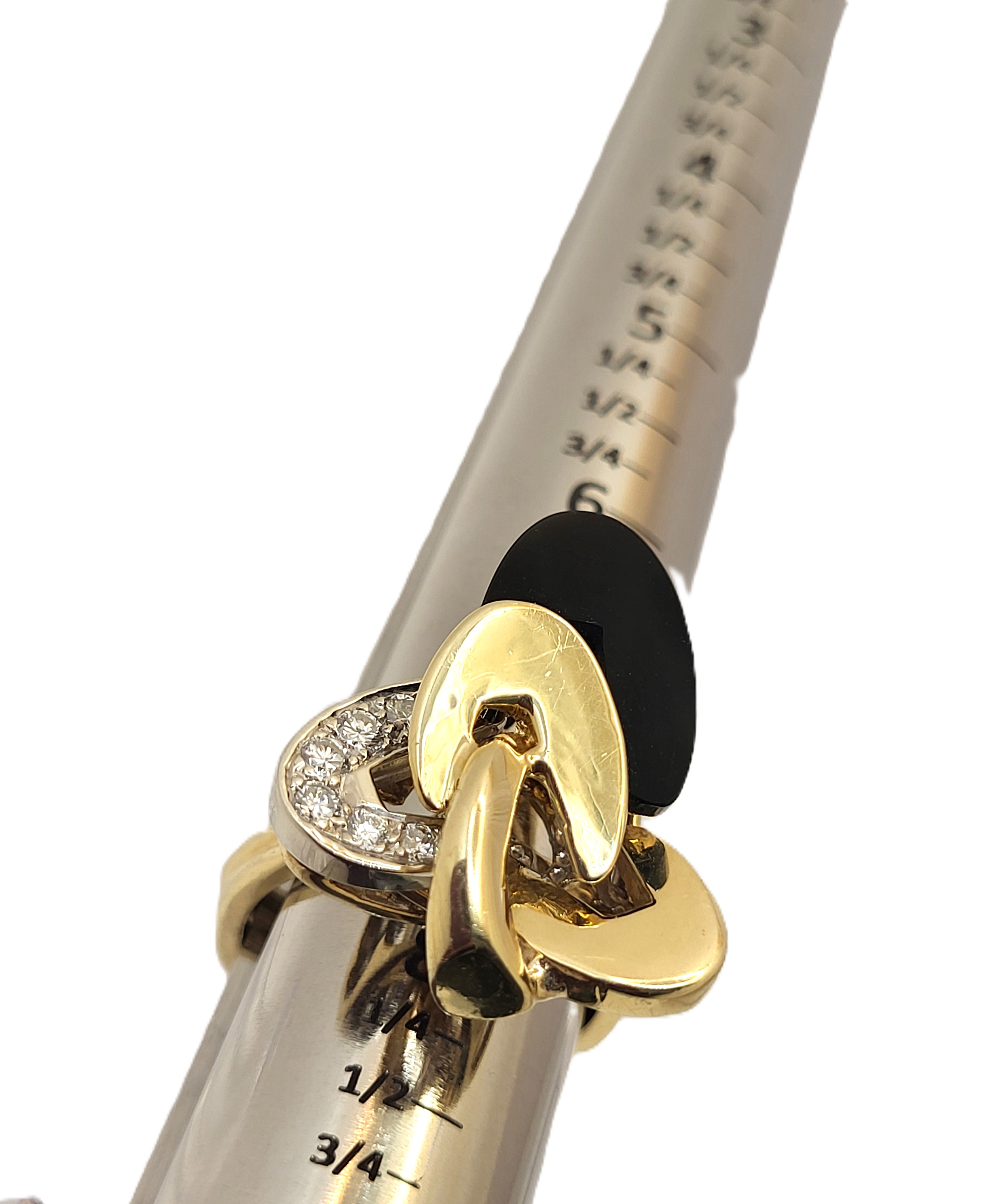 It really appears to always be moving like some superfast electrons around an atom! This 18 karat yellow and white gold ring features an ellipse carved from polished, black onyx and approximately .33 carats of round, brilliant-cut, H color, VS-SI clarity diamonds on the white gold ellipse. The top of this ring is approximately 1 1/8" in diameter between the knuckles of the finger and it has a uniquely carved gallery for support that is attached to the doubled ring shank that tapers from pinched at the top to approximately 5.25mm at the bottom. This ring is US size 9. See below for sizing detail and other information. There is a hallmark that has been obscured. The hallmark is either "R" or ends with "R".  See Provenance Information Below. Admin:33110/9tli