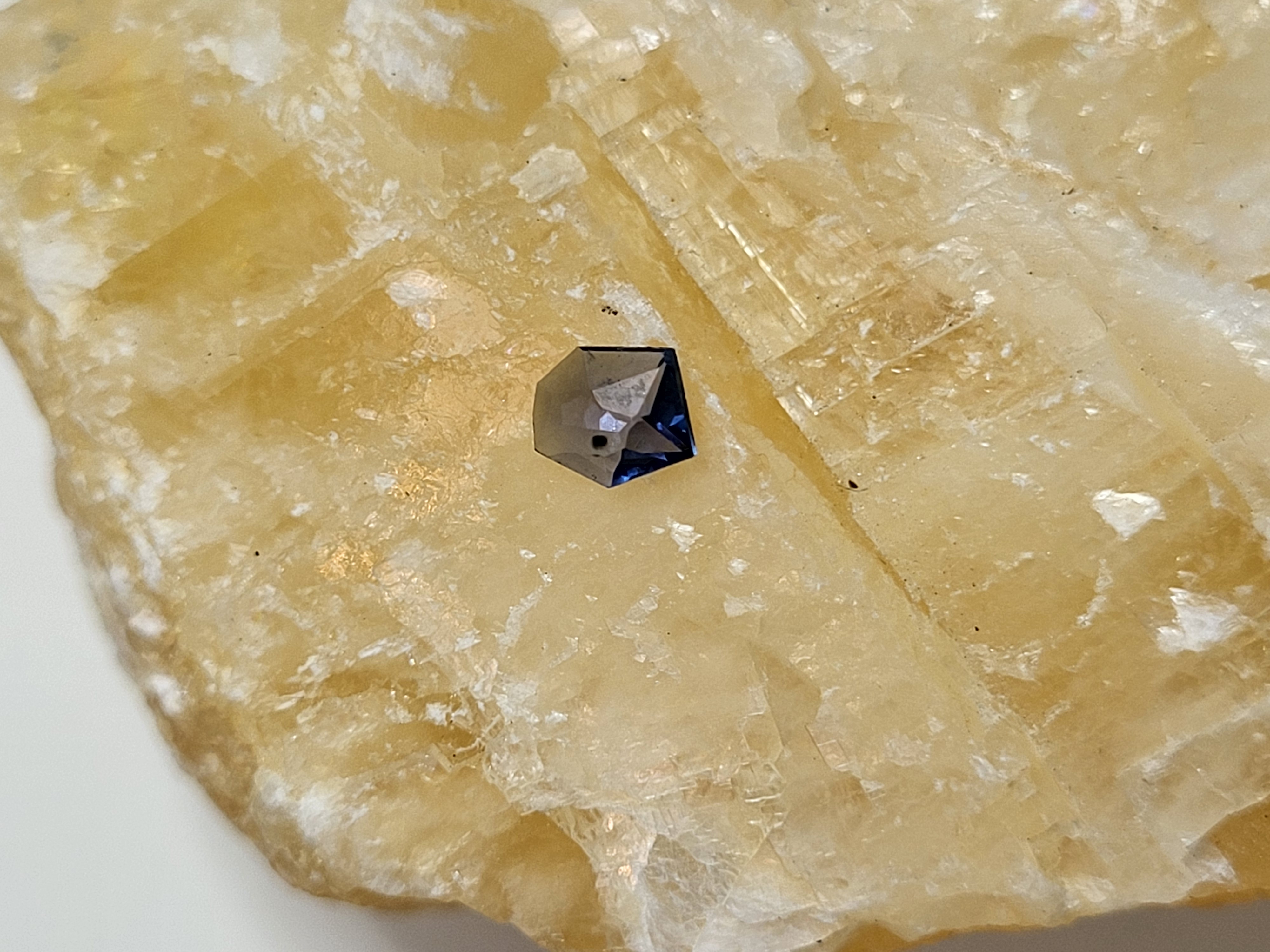 A rare .41 carat Montana Sapphire, mined from the famed Yogo Gulch and cut into a slender pentagonal silhouette. This unheated gem displays a natural gradient from pale to royal blue, with a distinctive dot-like inclusion that adds intrigue without compromising its clarity. Responsibly sourced and expertly cut and polished in Washington State, it measures approximately 6 × 4 × 2.5mm. Offered loose, ideal for minimalist settings or collectors seeking American-mined rarity. AdminCode: BKYG1/bpn