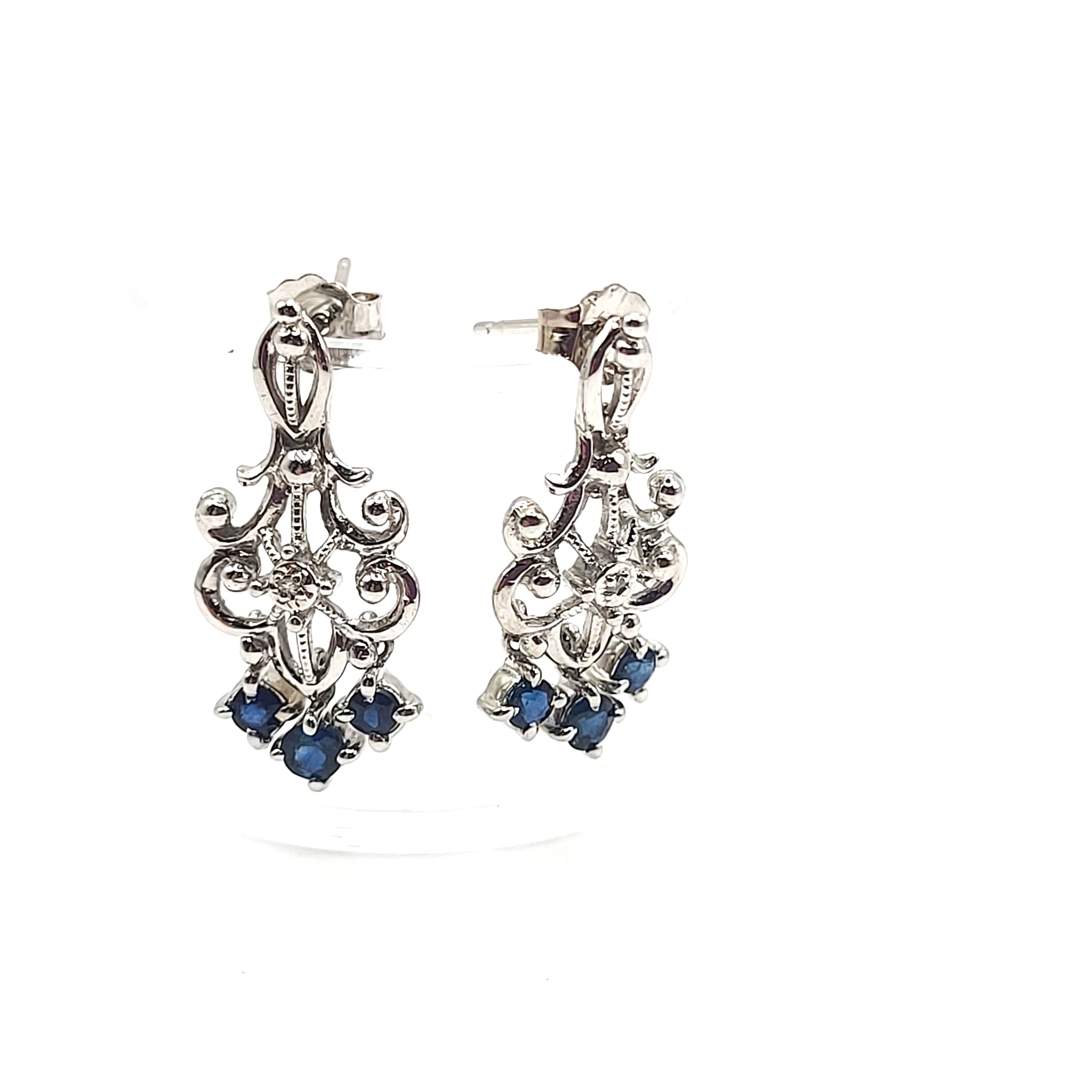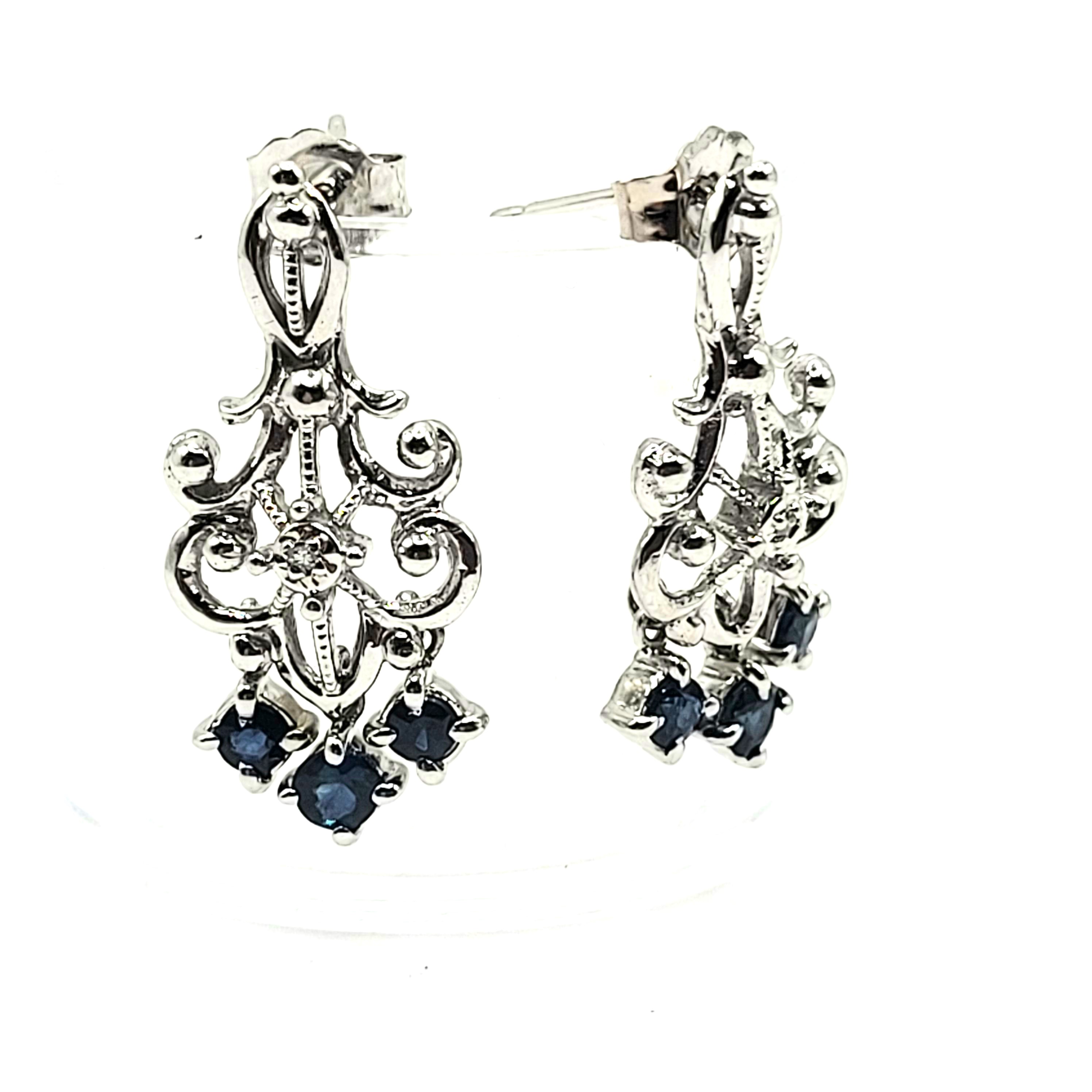 This pair of 14 karat white gold chandelier earrings dangle long enough to be flirty, but are short enough for more serious activities, like business meetings or parent-teacher day! They are adorned with .50 carats total weight of round, faceted genuine blue sapphires and accented with .01 carats total weight of round, faceted diamonds. They are approximately 7/8" long, 3/8" wide and attach to the earlobe with posts and friction backs. Admin: G11241/38lrt