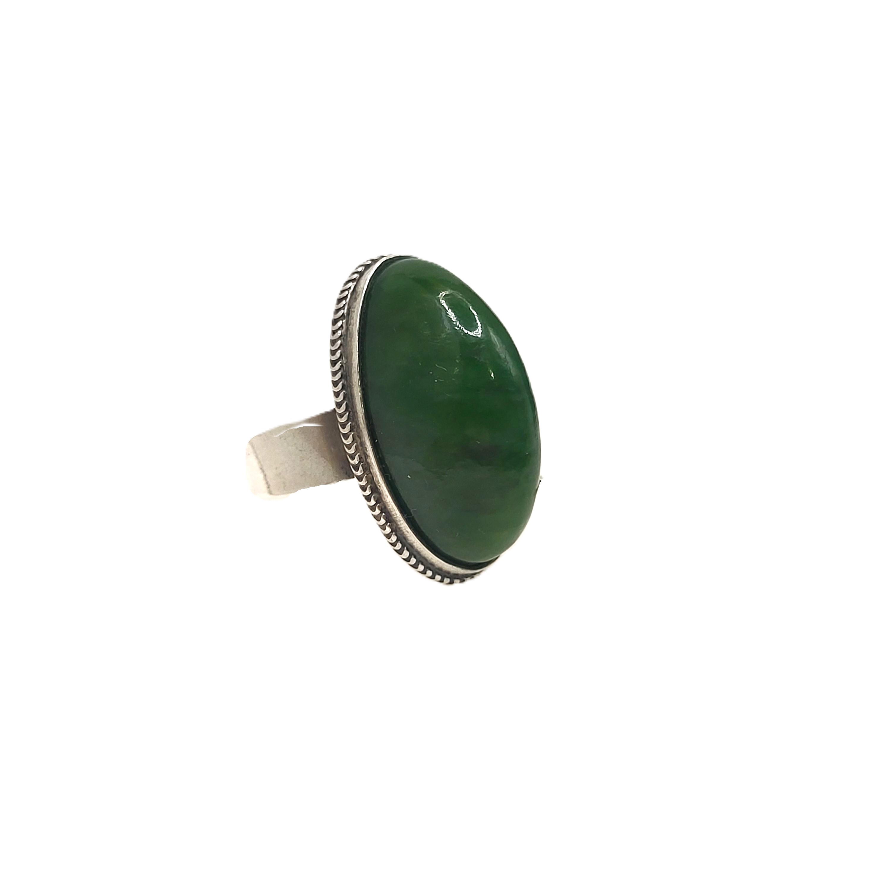 This ring is fashioned from .875 silver, the purity used by many the former Soviet Union, and other current nations). The seating and bezel may have been made especially for this unusually shaped gemstone that tests as Nephrite on the Presidium II gem tester. The nephrite is approximately 1" long, 3/8" wide and 3/8" tall. The bezel is formed around the base of the gemstone and recently had a cleaning and maintenence by a professional jeweler. The base of the bezel is decorated with a braided border. The shank is a simple sterling silver band that tapers from 5.5mm to 3 3/4mm. This ring is US size 8.5. Read sizing options and other important information below.