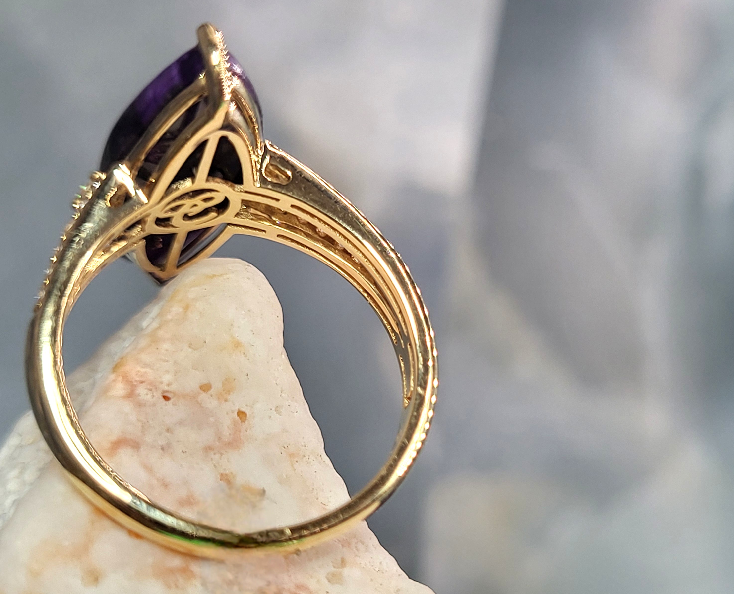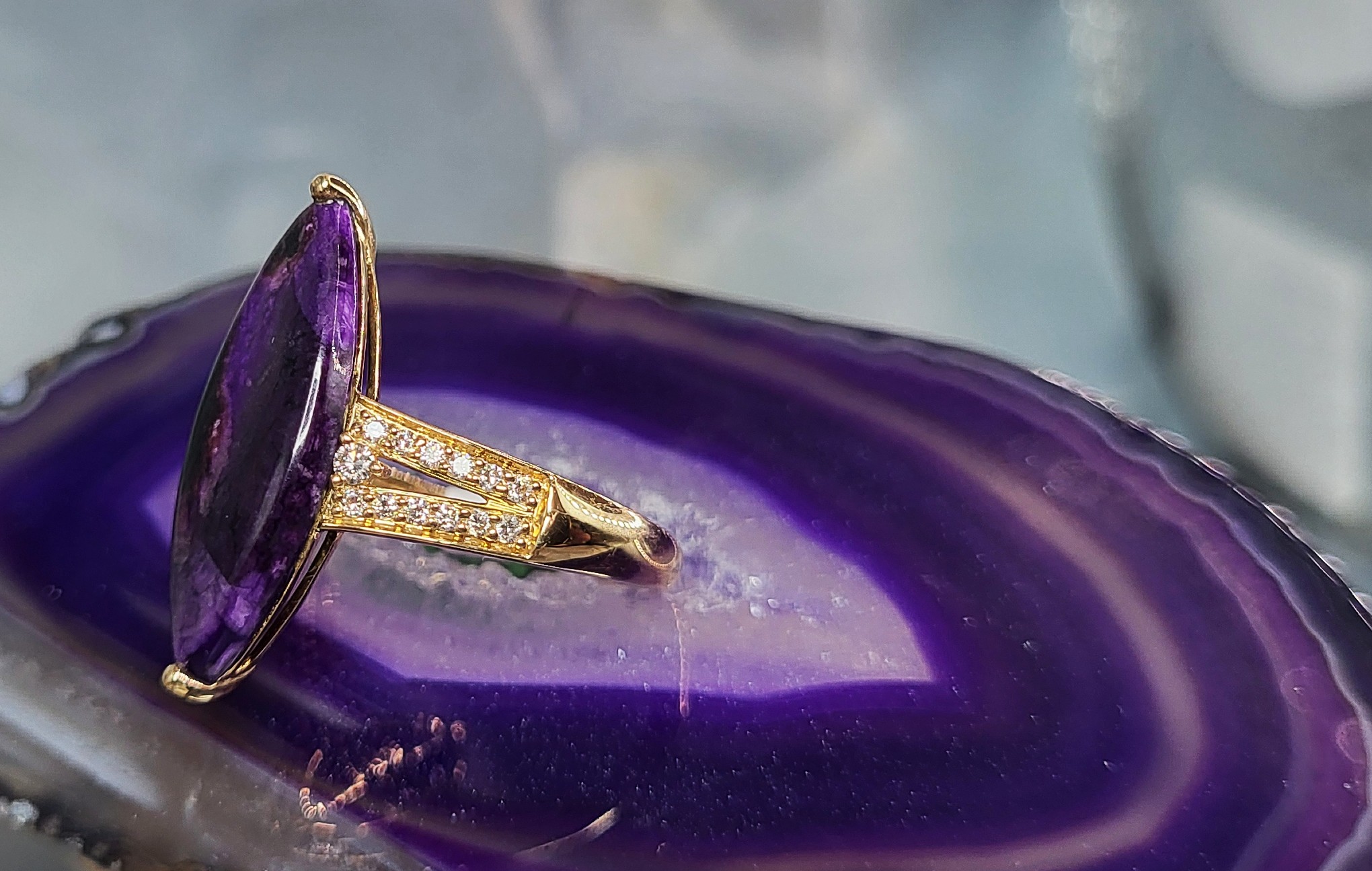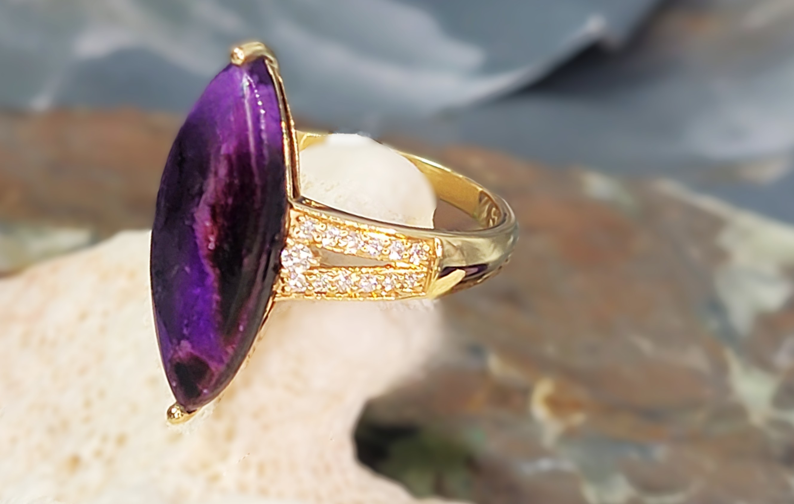 #Auction13 #SugiliteGem #NavetteRing #DiamondAccent #FineJewelry #LuxuryRing #18KGold #BidFairTreasures #CollectorGem #PurpleElegance