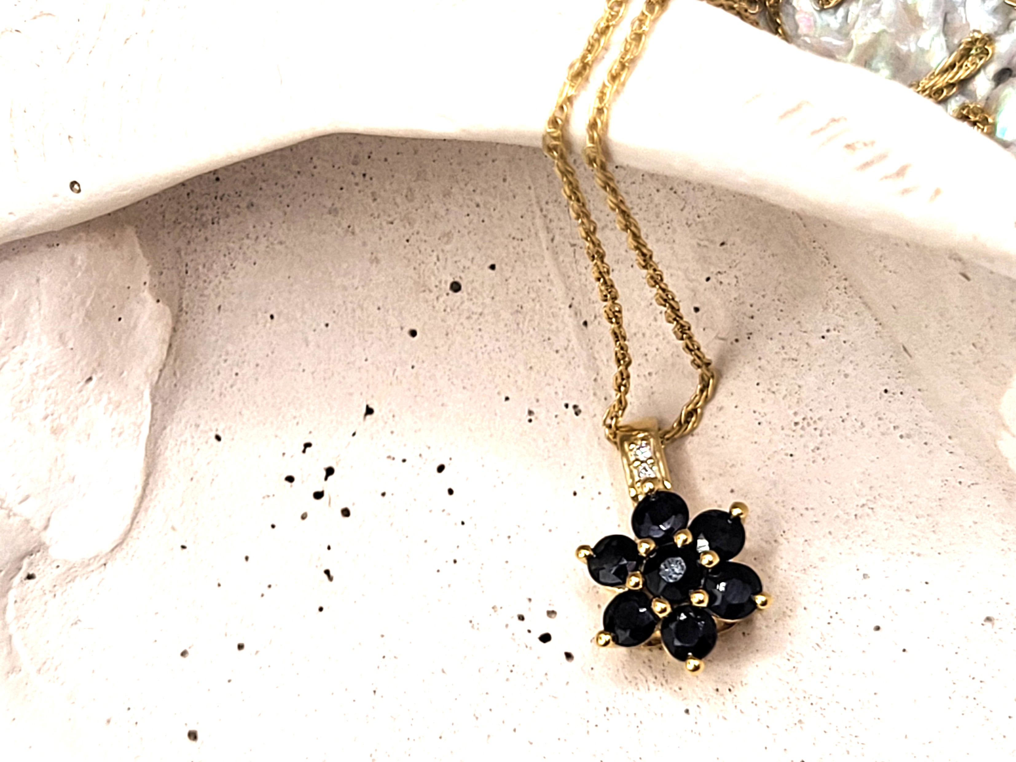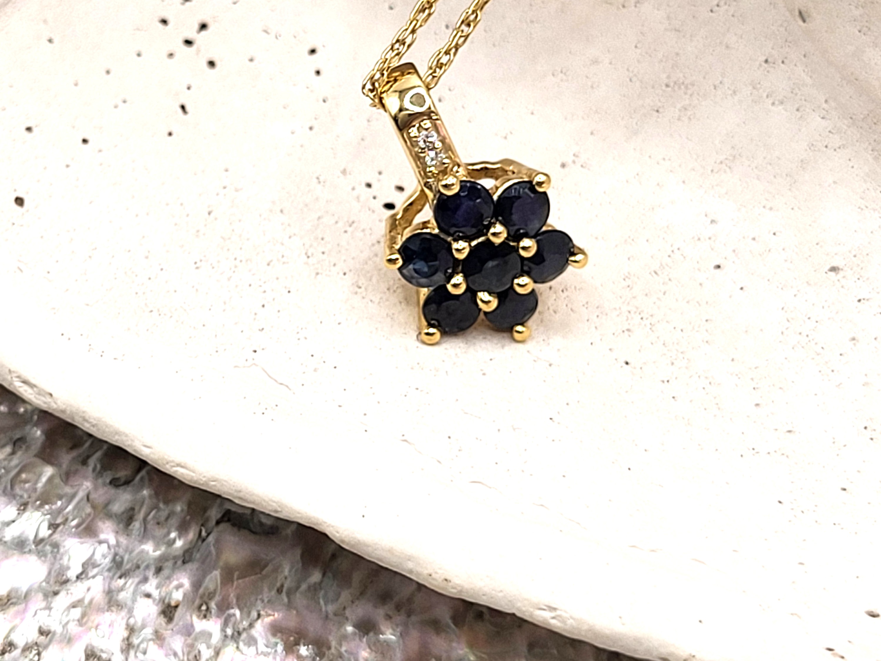 This 10 karat yellow gold necklace is adorned with a precious pinwheel-like circle of approximately .42 carats total weight faceted, dark blue, genuine sapphires and a diamond-accented solid bail. The chain is an 18" fine rope with a lobster clasp. The pendant is approximately 3/8" diameter. Admin: KQ12671blt