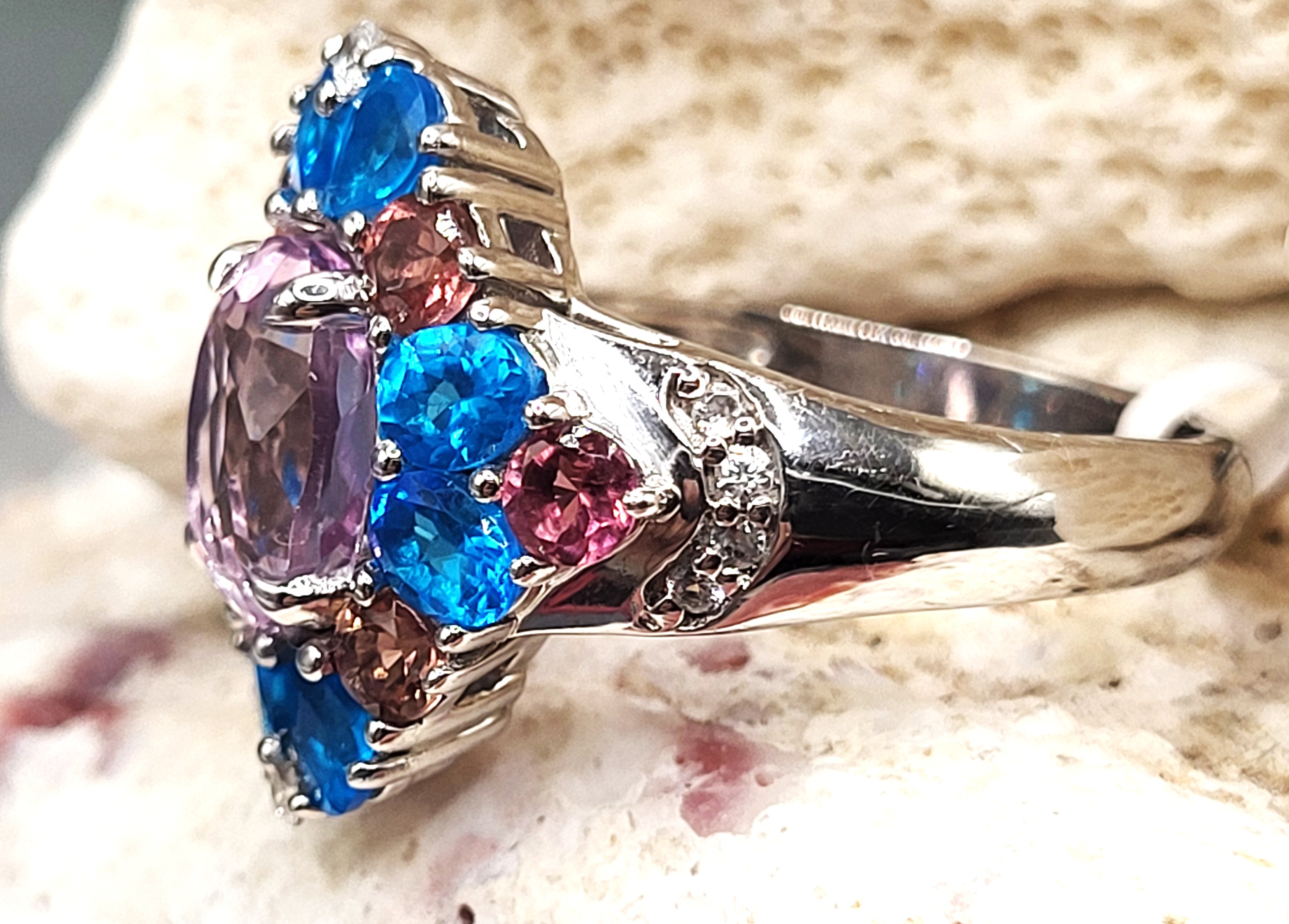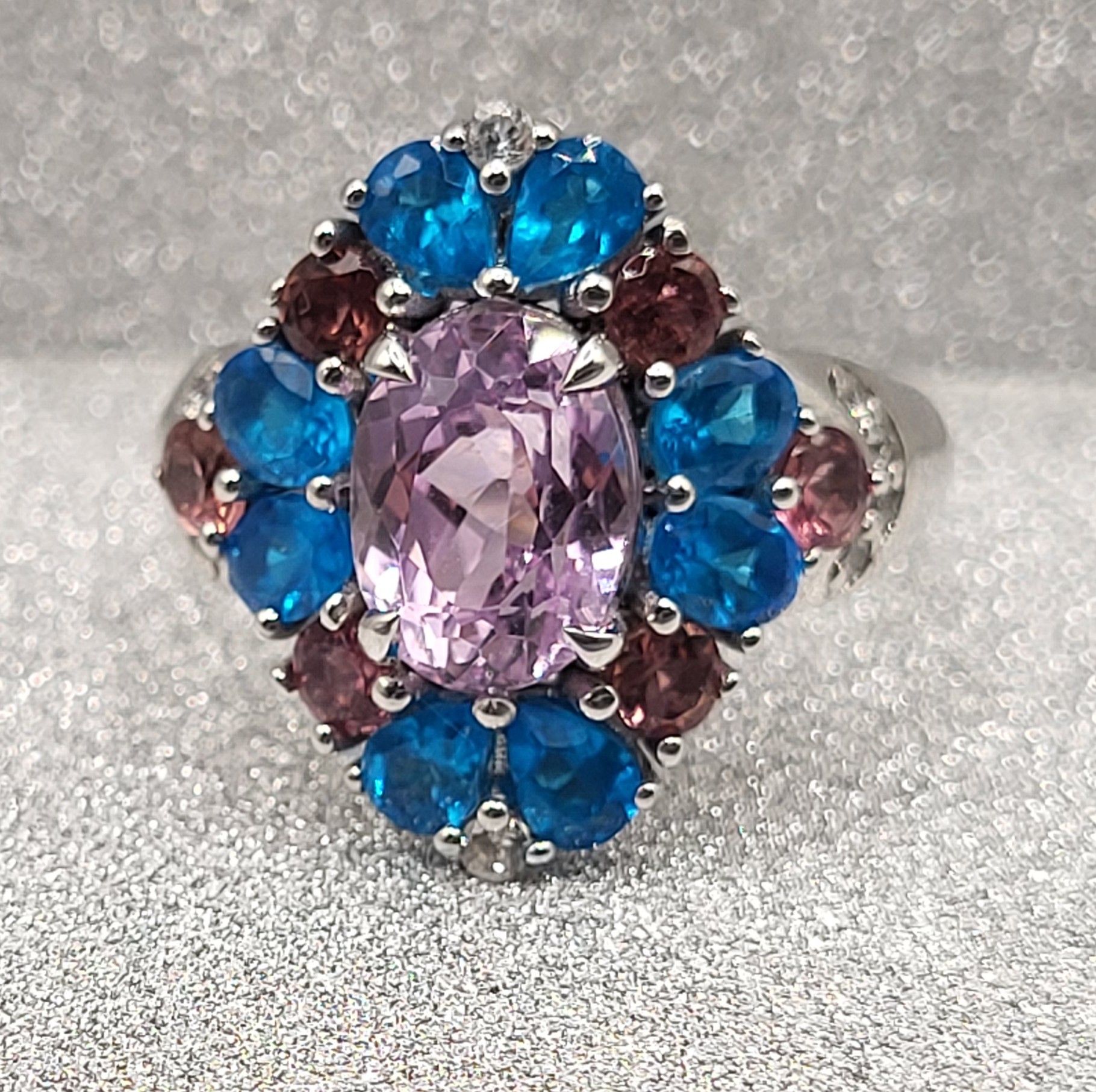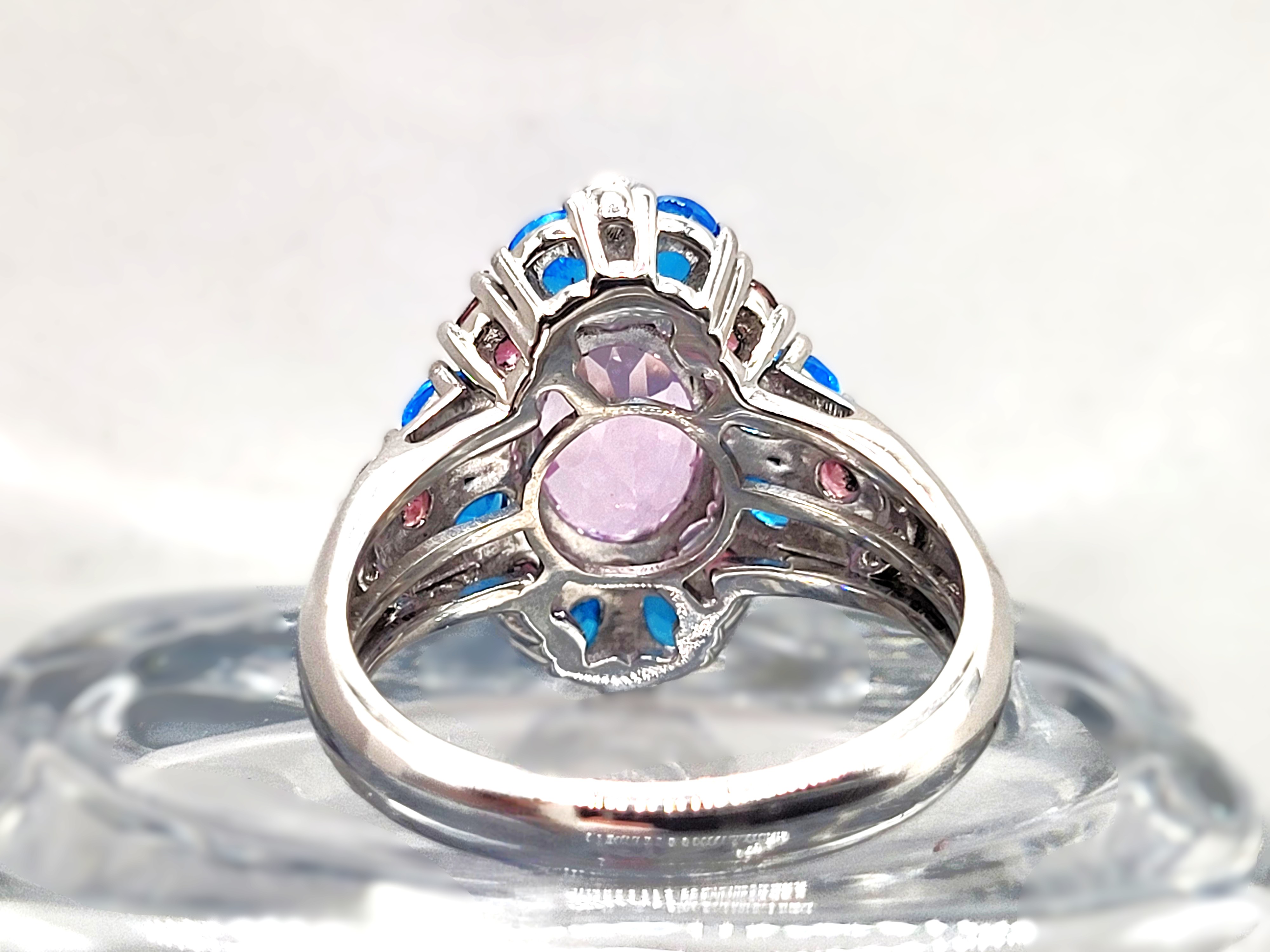 Sterling silver (.925) ring featuring a 12.10 carat oval kunzite in soft lavender-pink hues, accented by 1.16ctw neon apatite, .58ctw pink tourmaline, and .25ctw natural white zircon. Round, faceted stones create a vivid halo of color and sparkle. Ring size: US 7. A joyful, high-impact piece for gemstone lovers and collectors.This ring is US size 7 and weighs 5 grams. See sizing options and other important information below. AdminCode: 6282/28-gr