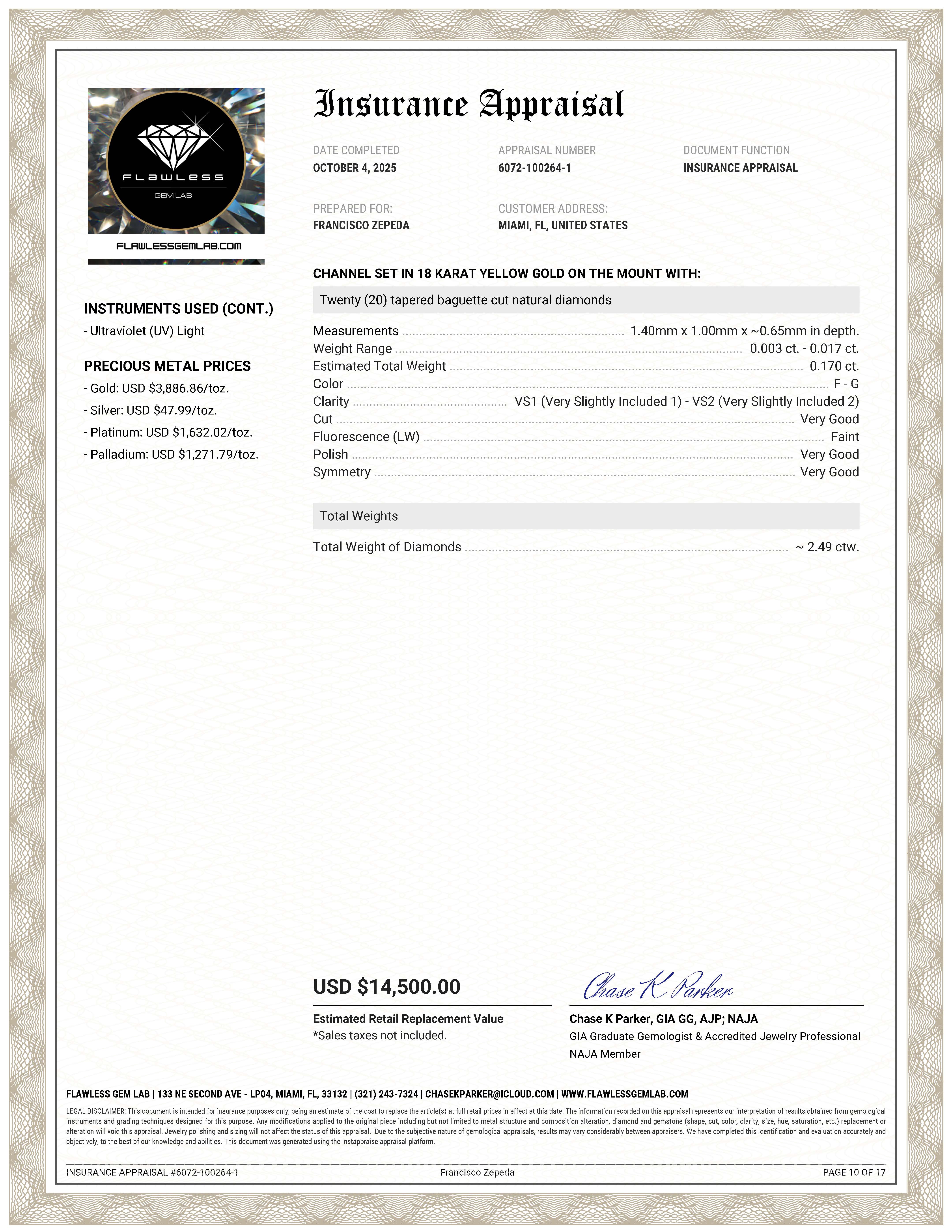 Certicate of Appraisal prepared by Flawless Gem Lab (11/2025) states appraised value of $14,500.00