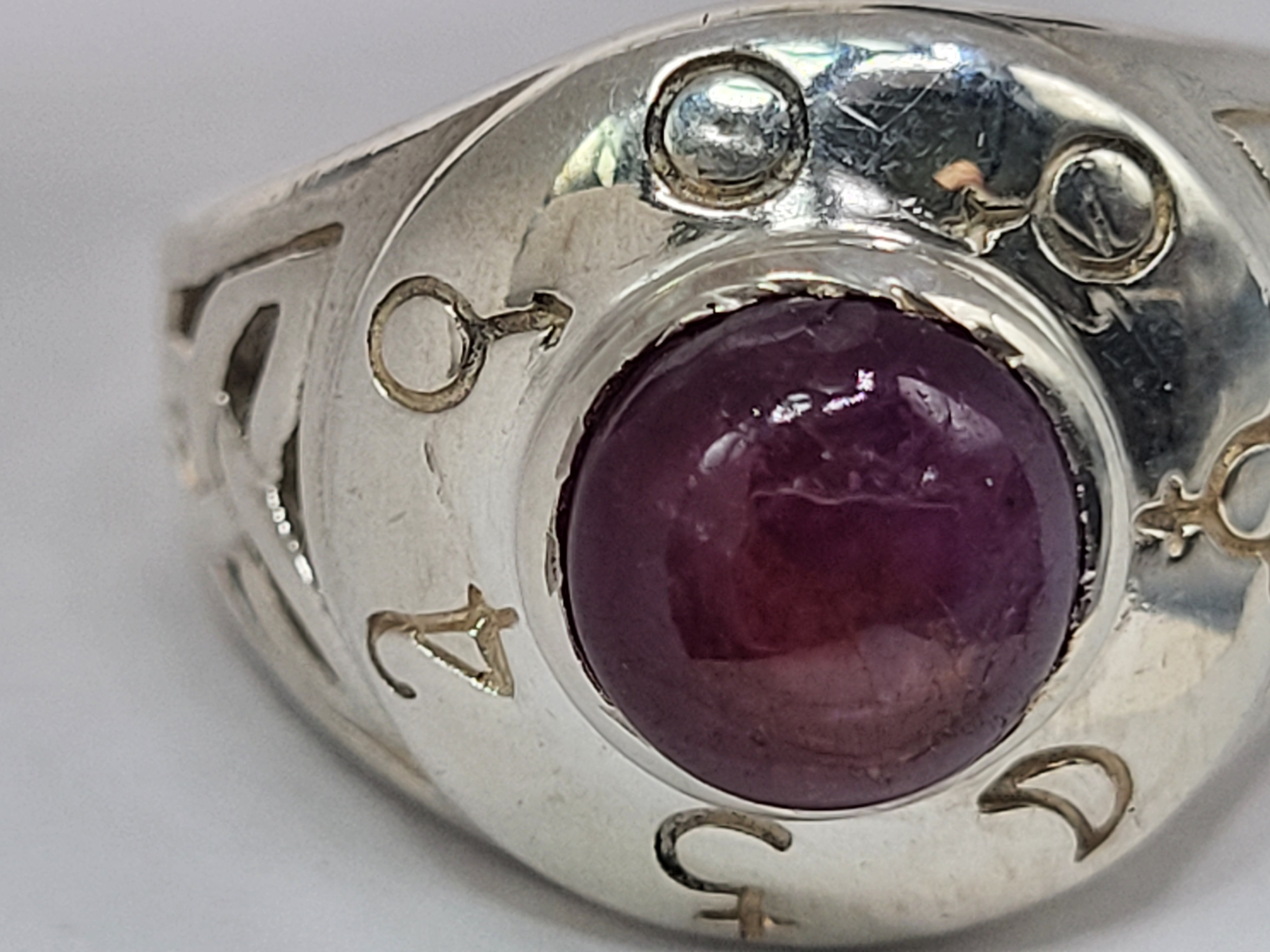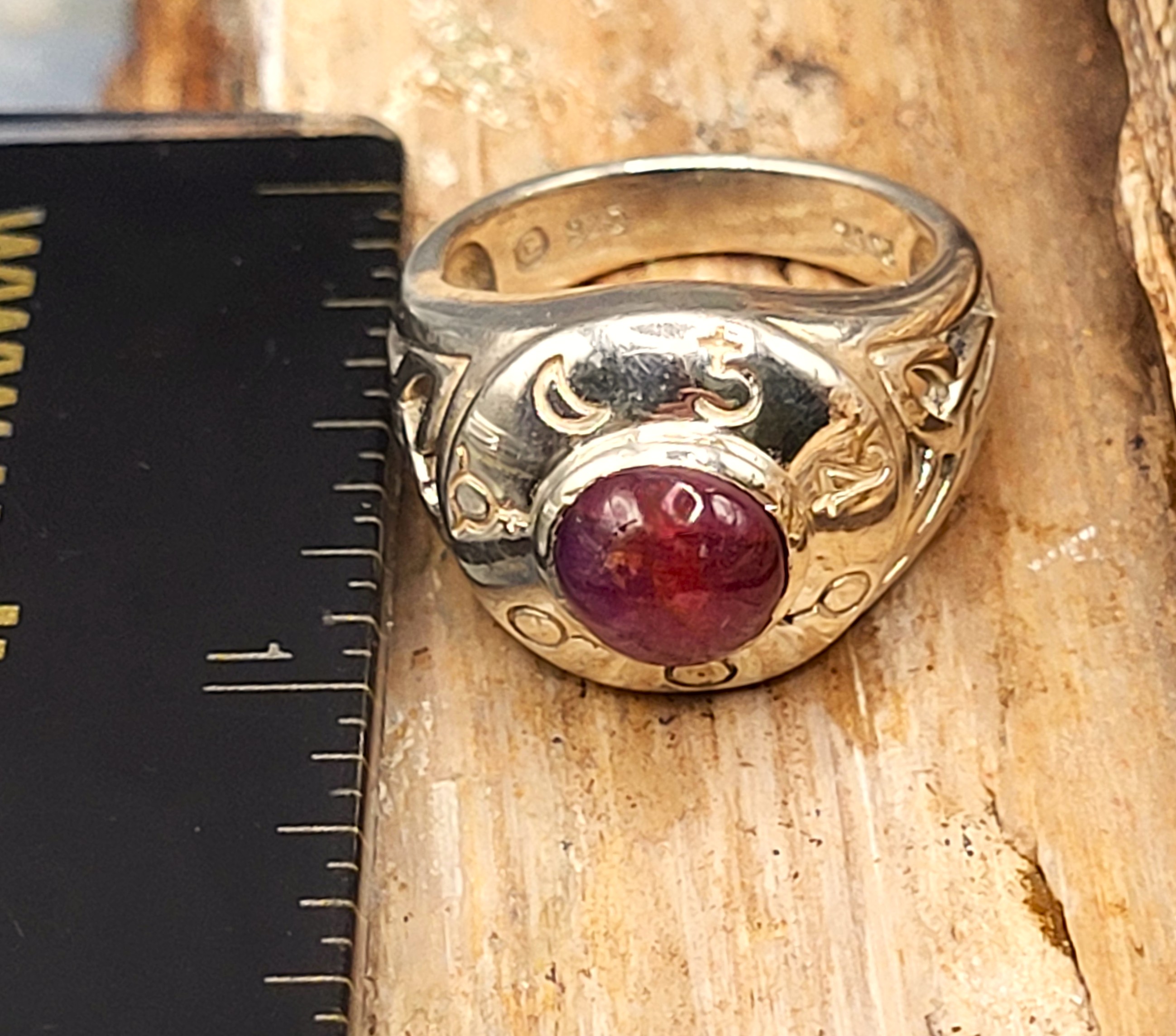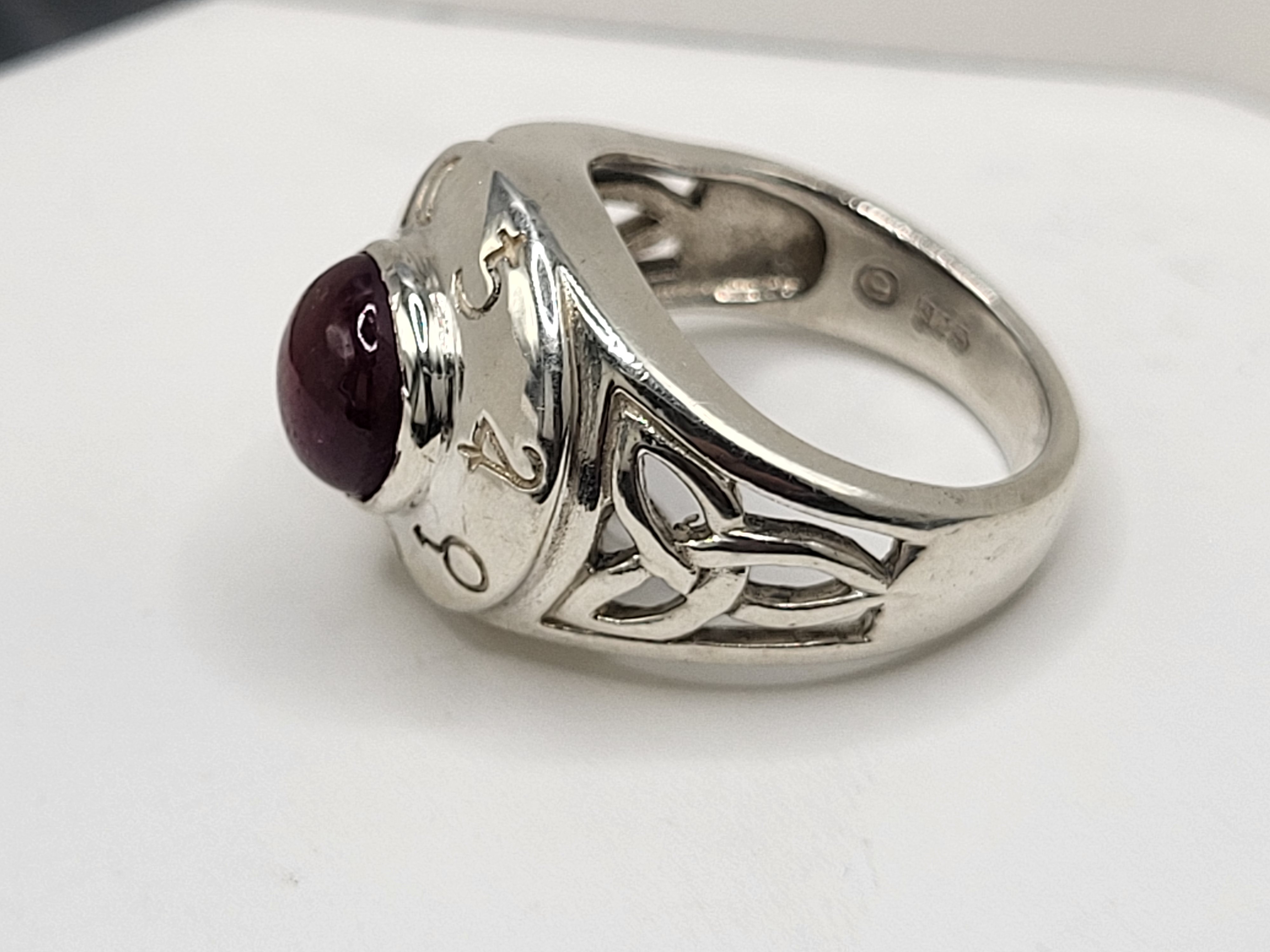 This 6g .925 sterlingsilver ring features a bezel-set round cabochon star ruby (6–6.5mm) glowing with deep red mystery. The Celtic-inspired openwork domed ring is engraved with celestial and symbolic motifs, creating a piece that blends heritage, mysticism, and modern intention. A one-of-a-kind creation, reimagined to shine anew. See sizing details and other information below. AdminCode:K1821225/brr