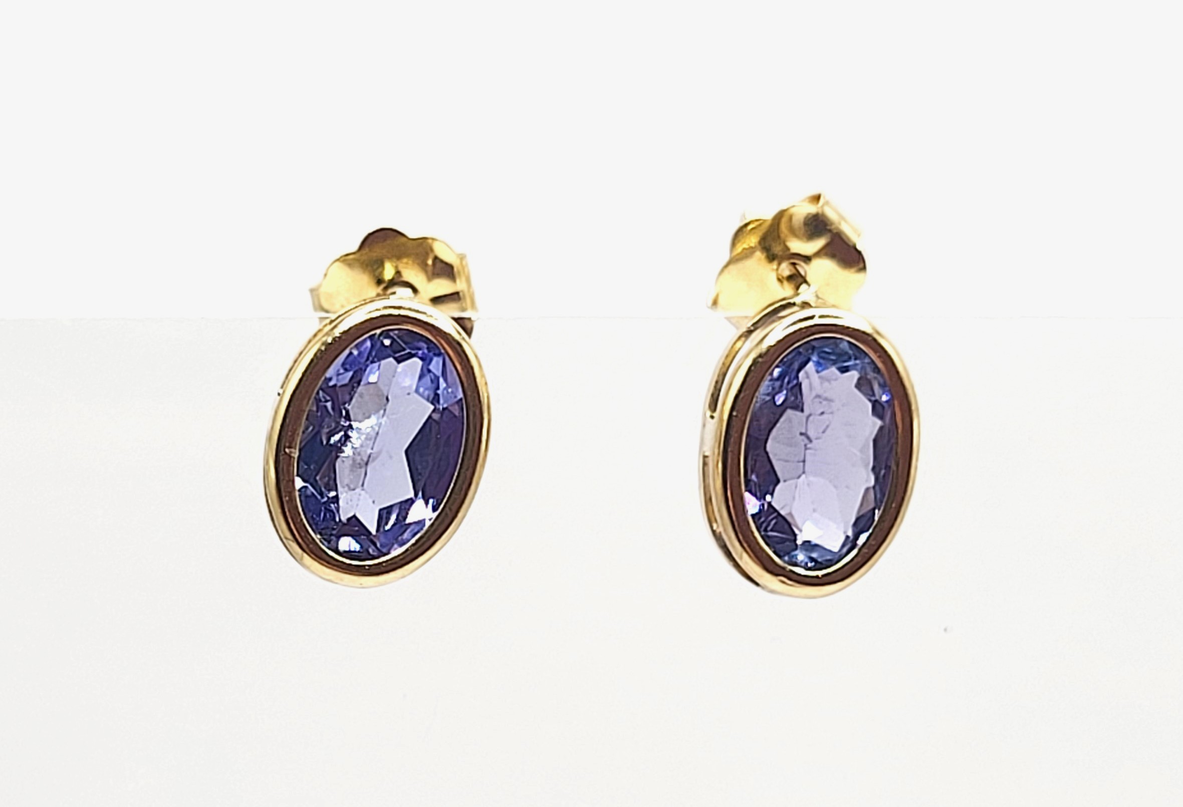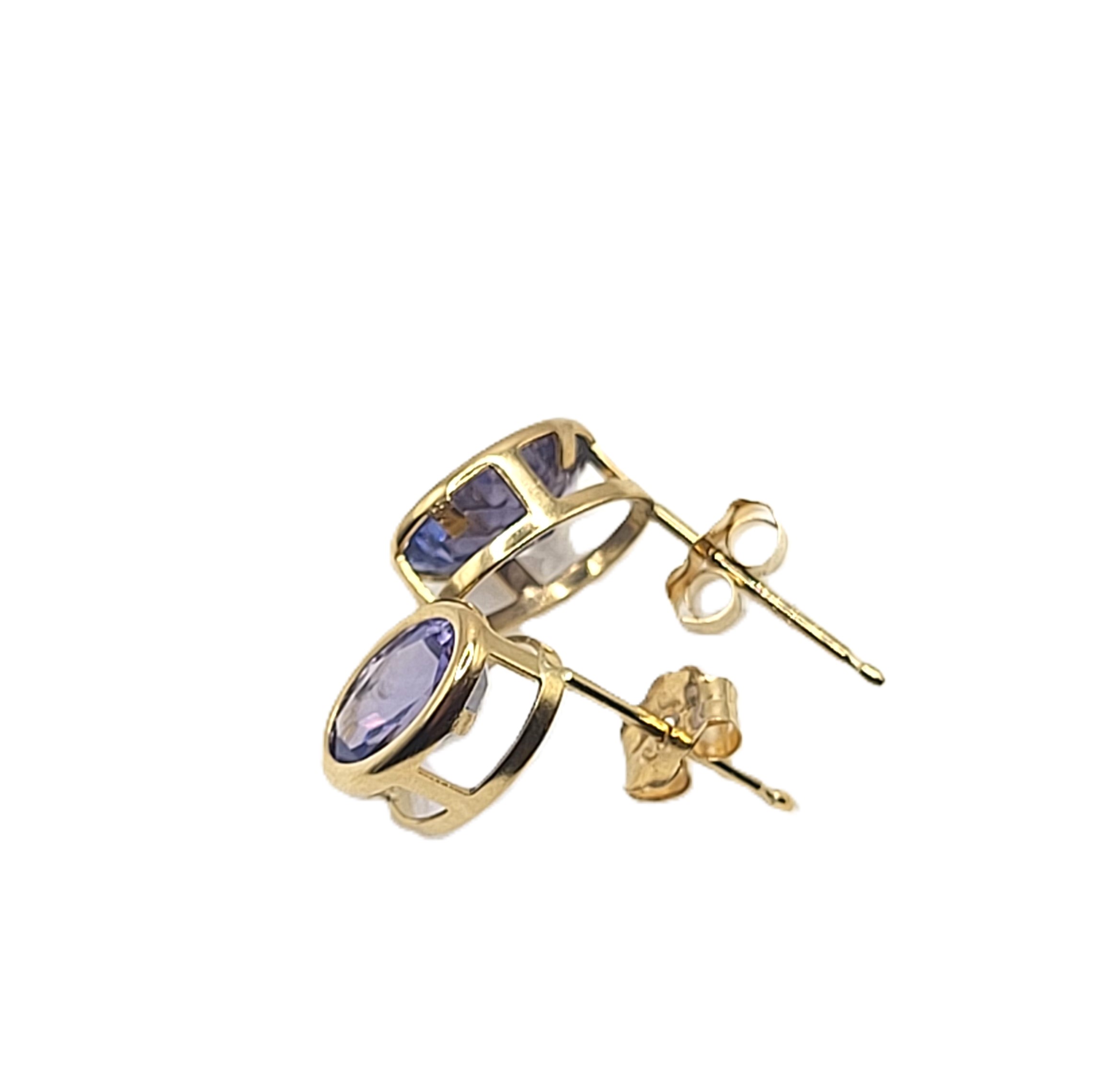 This is a pair of 14 karat yellow gold earrings that feature 1.60 carats total weight of oval-cut, bezel-set, genuine tanzanites. The tanzanites are approximately 6x4mm. The earrings attach to the earlobe with posts and friction backs. Admin: G11241/30ltt