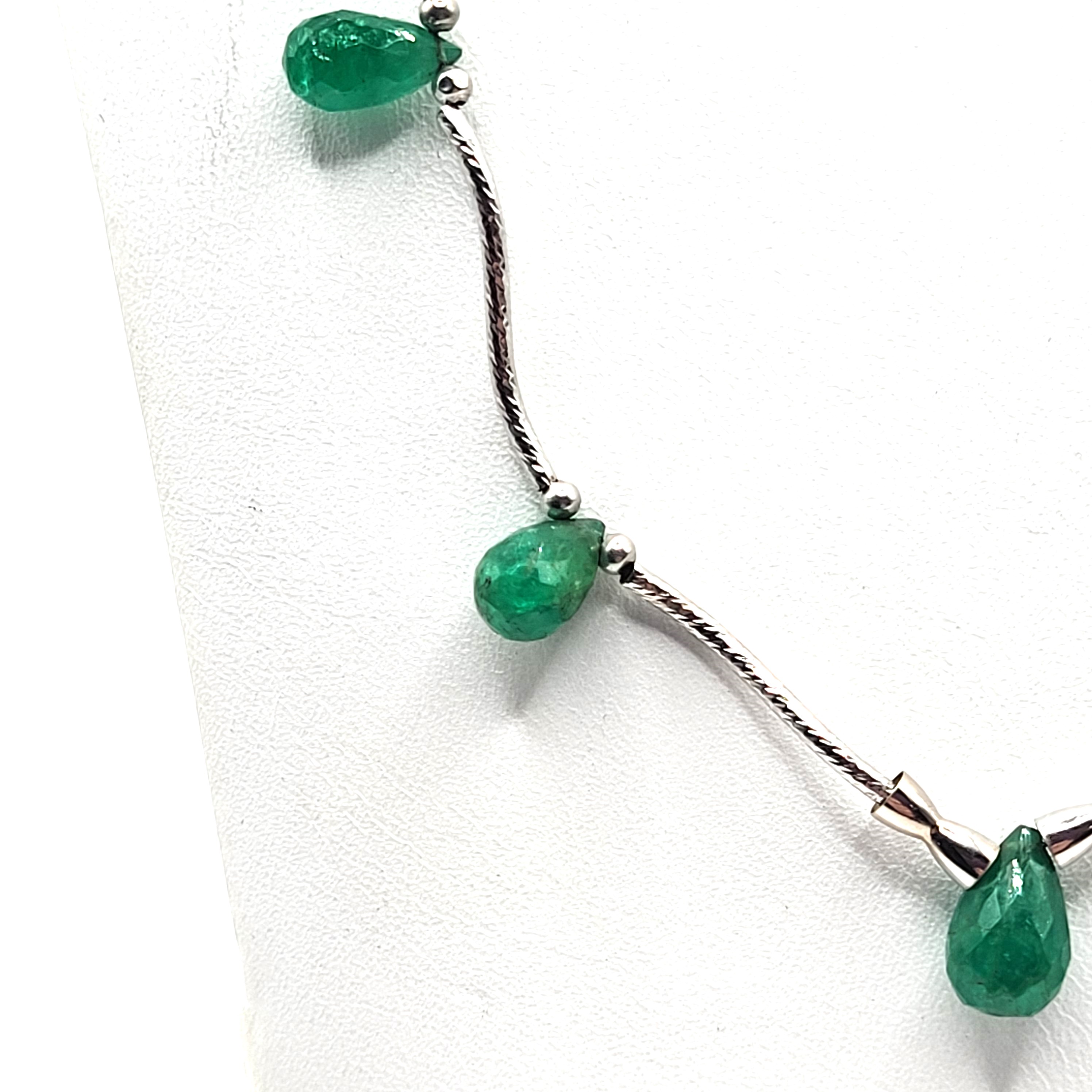 This necklace is constructed with beautifully etched, 14 karat white gold, curved, hollow tubes that are strung onto a silver-colored cable (unknown metal, may be white gold).  Each segment is separated by 14 karat white gold beads and briolette-cut, teardrop-shaped, genuine emeralds for an approximate total of 5.00 carats. The necklace is 18" with a "bean" shaped plunger clasp.