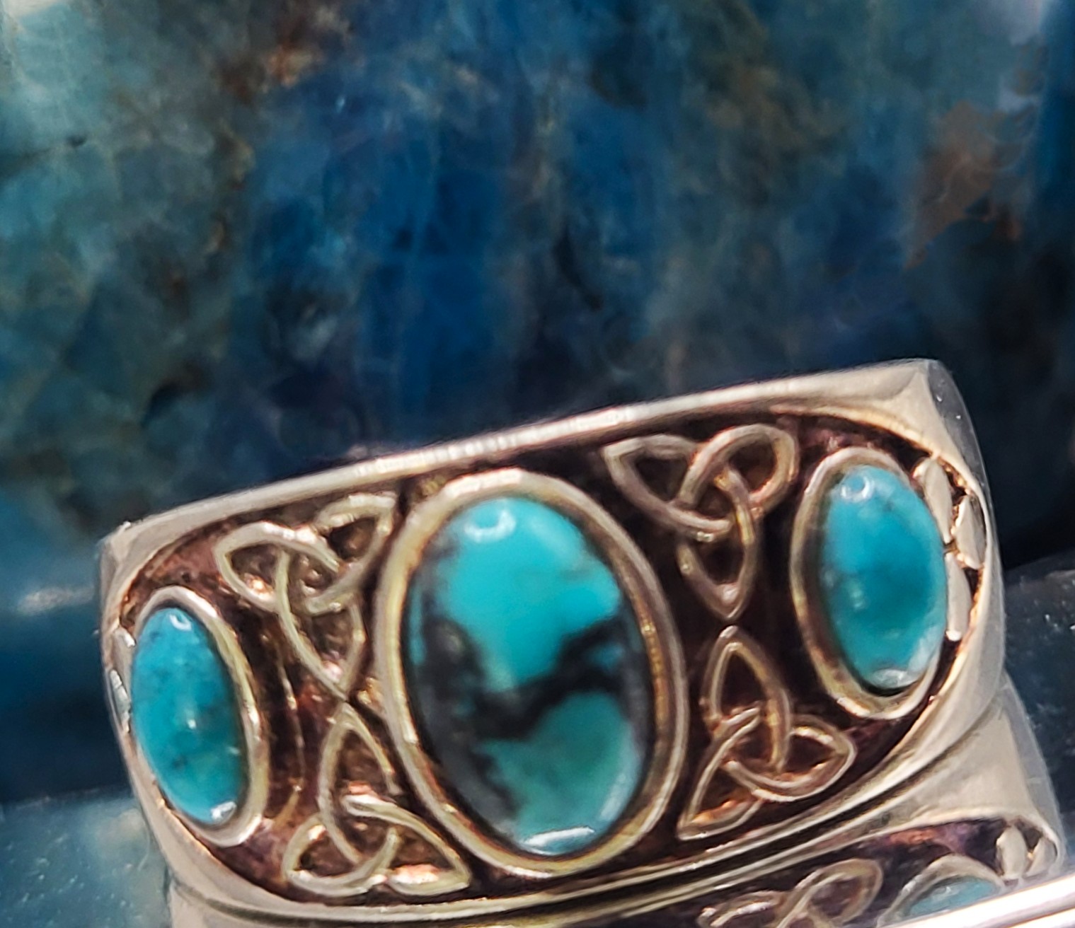 This sterling silver ring looks like it is something right out of the Southwest…the South West of Ireland, maybe! Set with 3 cabochon turquoise-like gemstone (may be turquoise, or could be chrysocolla) the ring tapers from the wider center to the narrower shank. Celtic knots in bas relief decorate the the top of the ring for the Irish appeal. This ring is US size 8. See sizing options and other details below. AdminCode: K14/l