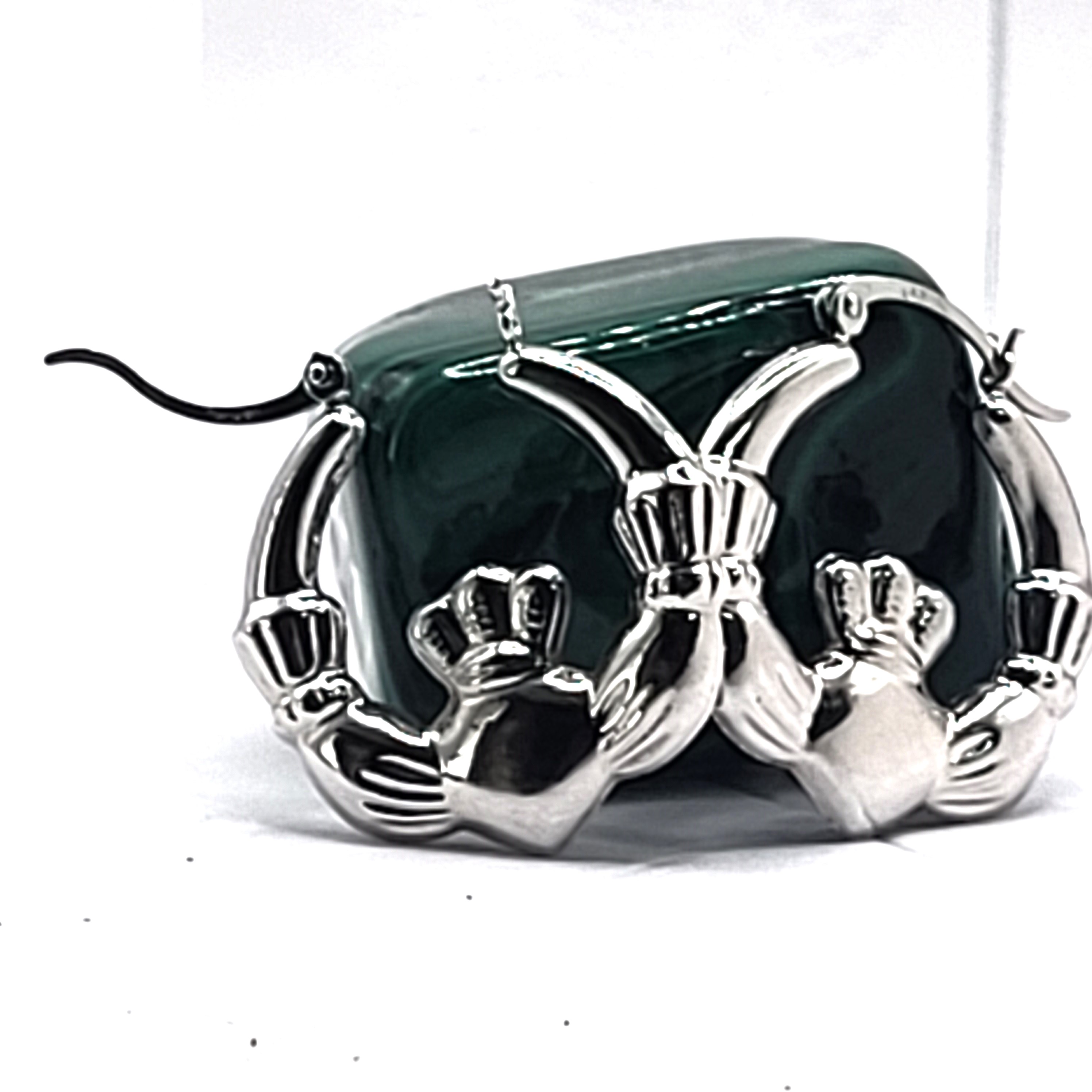 The claddagh is worldwide recognized symbol of love that originated in Ireland nearly 500 years ago! (Read more about the claddagh below.) These 14 karat white gold hoop earrings are designed as "Claddagh" symbol and have hinged bar closures. They are approximately 1" diameter and weigh 2.87 grams total (about 1 1/2 grams each) for a light, comfortable wear. They attach to the earlobe with a hinged posts and a built-in snap lock back Admin: 33110/27ea