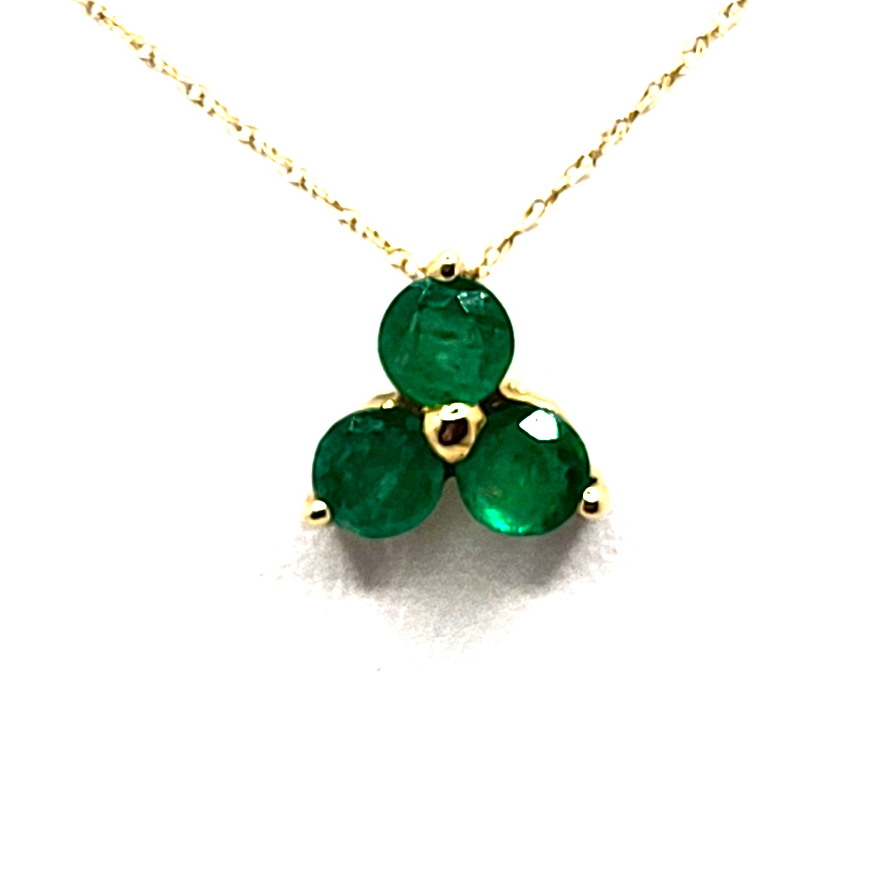This 14 karat yellow gold necklace features .75 carats of round, faceted, genuine emeralds that are prong-set into the shape of a three-leaf clover, or trefoil, with a built-in bail that is formed by the back gallery. The approximate 3/8" pendant hangs from a 14 karat yellow gold fine link chain that is 18" long with a spring ring. The pendant bears the hallmark (CID) for Clyde Duneier of New York, who founded the "Jewelers For Children" charity in 1983, helping mostly with Juvenile Diabetes. Admin: 33110/17a