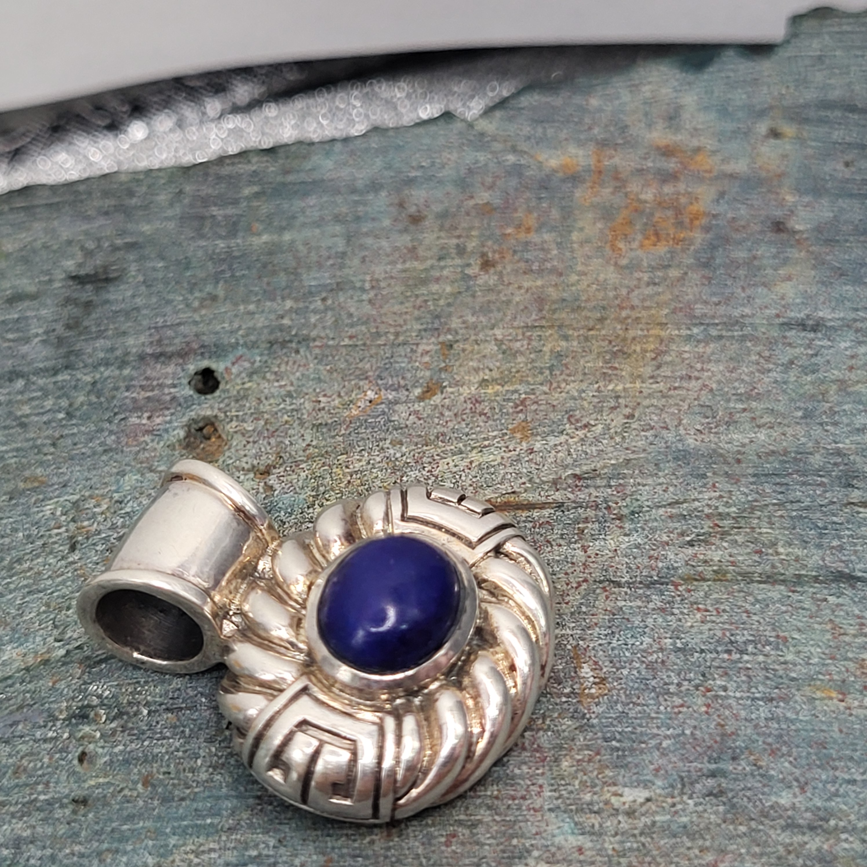 This sterling silver slide style pendant is bold, but not overpowering. It features an approximate 1.50 carat, oval, cabochon genuine lapis lazuli that is bezel-set inside a wide, oval-shaped frame with a 2 dimensional spiral design and geometric designs on the left and right edges. The extra-wide, solid tube bail has a smooth surface and can accommodate up to a 4.7mm wide chain. AdminCode: K04B/1-nr