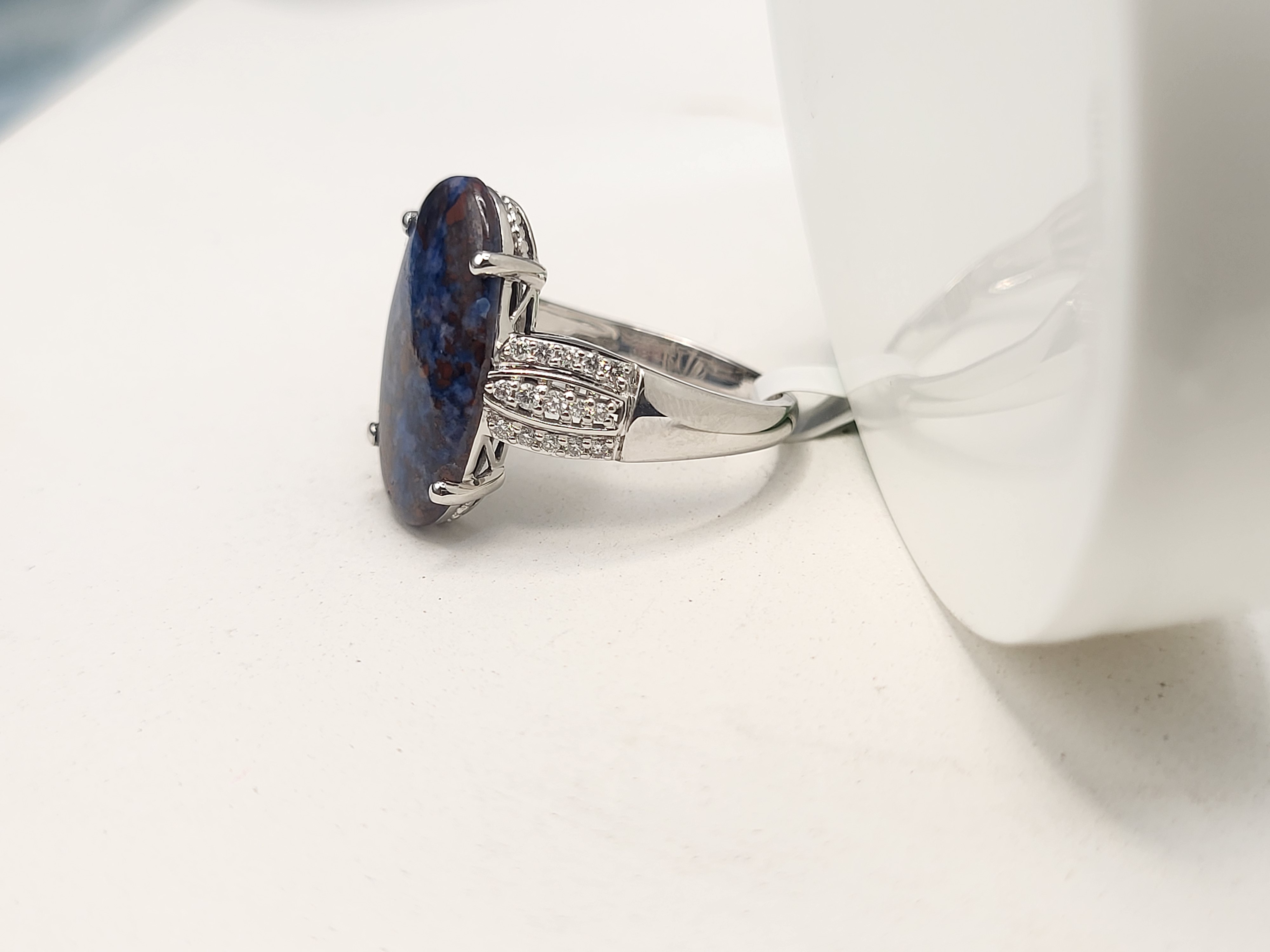 An extraordinary ring in 18K white gold, size 7, weighing 3.59 grams. At its center rests a 4.8 ct oval sugilite cabochon, low-set yet commanding, with a mesmerizing play of color—grape-purple tones enriched by subtle hints of blues and reds. The triple ribbon shoulders sparkle with .18 ctw of round brilliant-cut diamonds (G–H color, SI1 clarity), adding refined brilliance to the bold centerpiece. Finished with an ornate yet supportive under gallery, this ring is both striking and comfortable, a rare jewel for the collector of distinctive gemstones. See sizing details and other information below. AdminCode: 6282/13-err