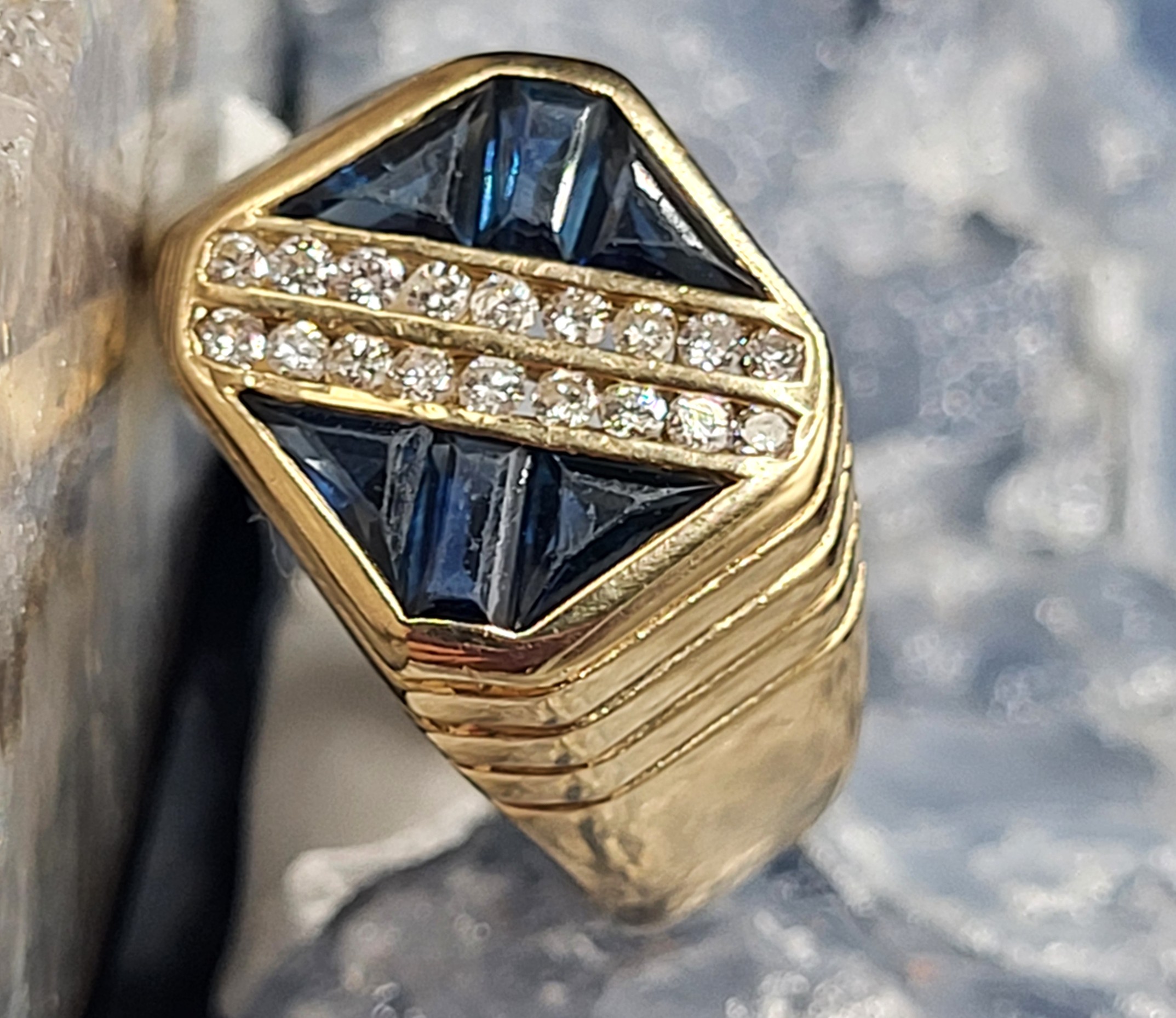 This is a 14 karat yellow gold  approximately 1.00 carat total weight of trilliant- and baguette-cut invisible-set genuine blue sapphires and approximately .25 carats total weight round, brilliant-cut, approximate H color, SI2 clarity channel-set diamonds arranged diagonally across the center of the ring.  It has a supportive lattice under gallery.  The top of the ring is approximately 12mm  and the ribbed shoulders taper to an approximate 4mm shank.  The ring is US size 8 and can be sized for an additional charge. This item is eligible for appraisal at a discounted rate, from an independent appraiser (with qualifying credentials from GIA) with no affiliation to Bidfair Fine Jewelry. Please contact Bidfair Fine Jewelry for more information on appraisals and sizing. 8 grams.  Admin: 33109/25irh