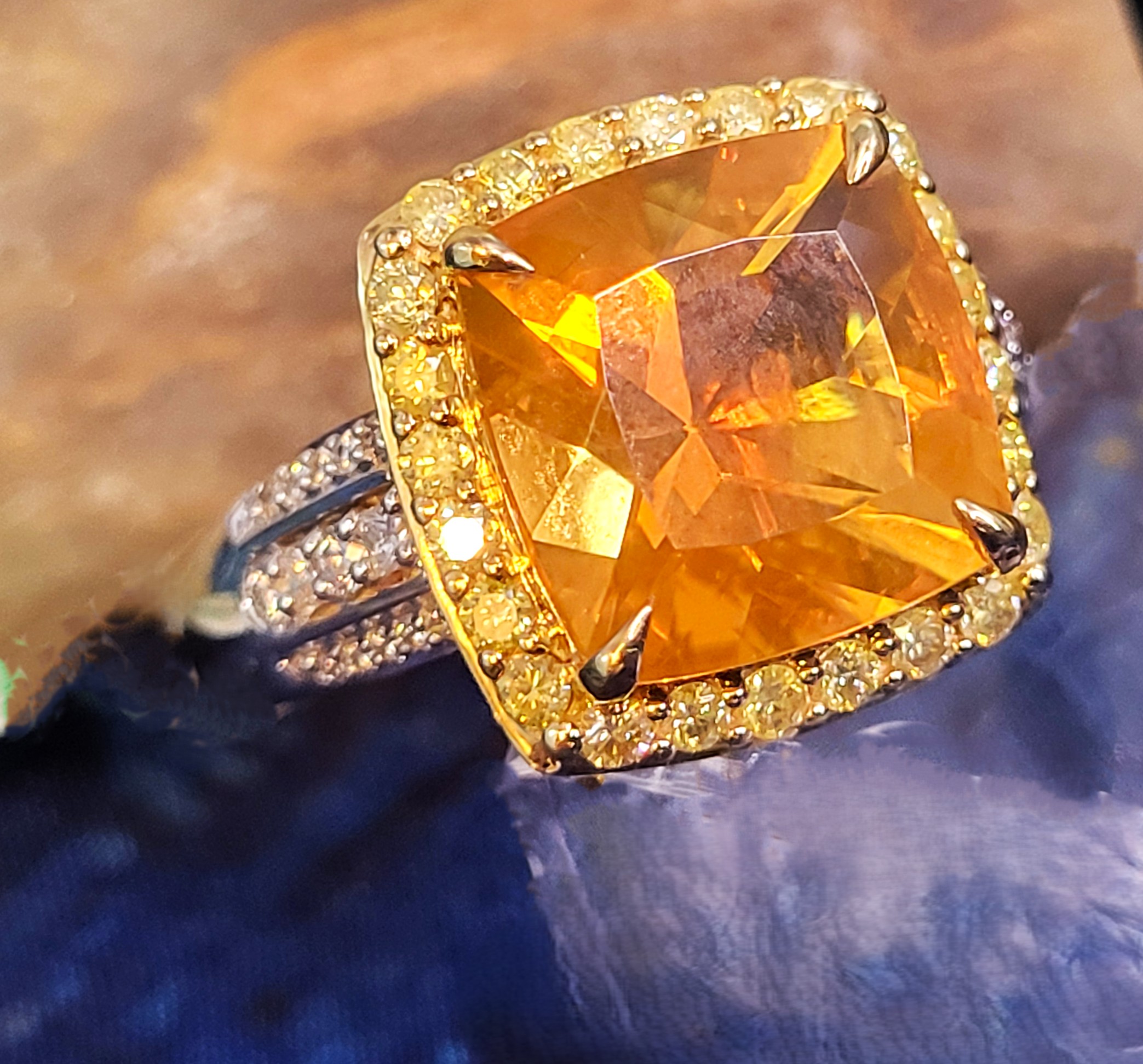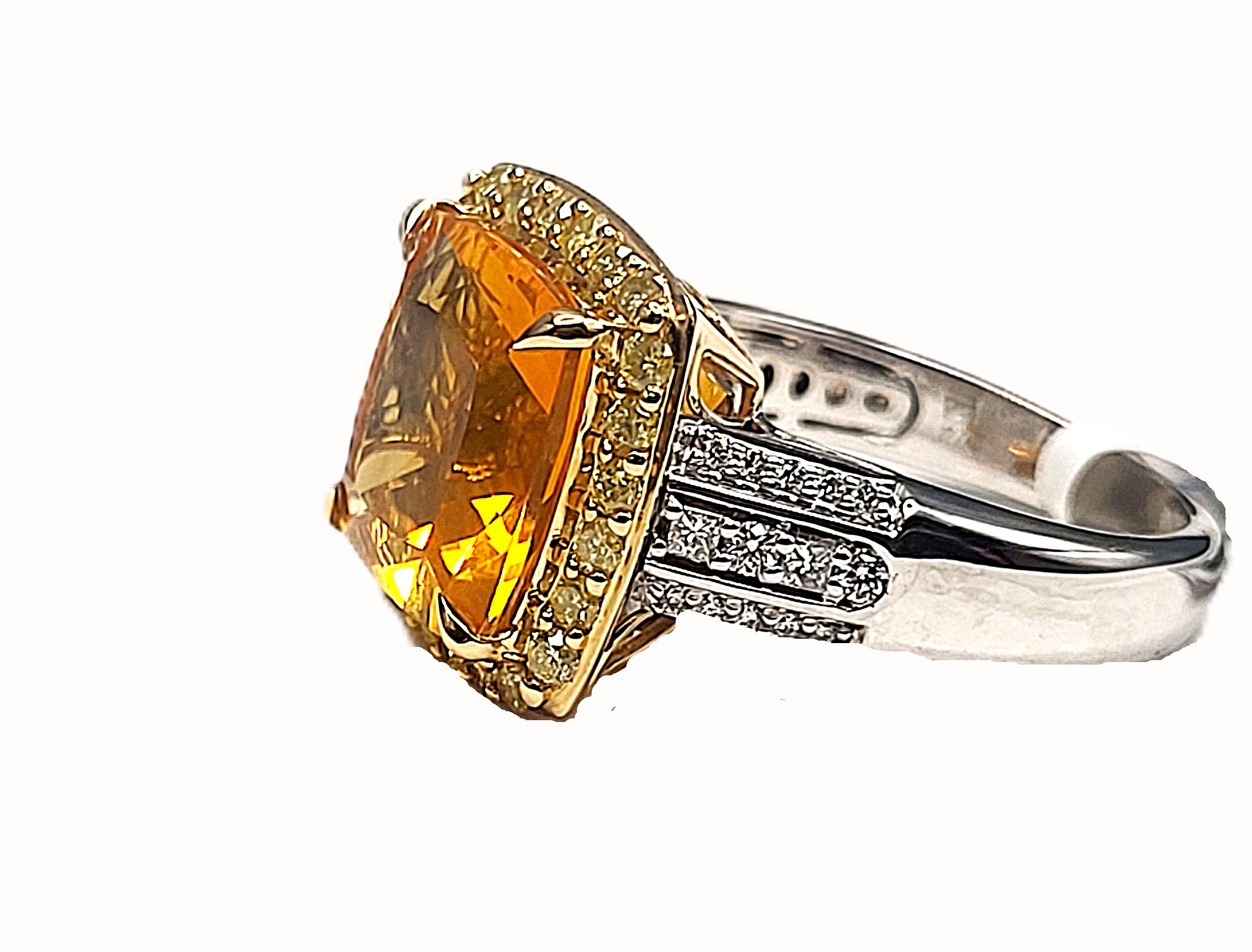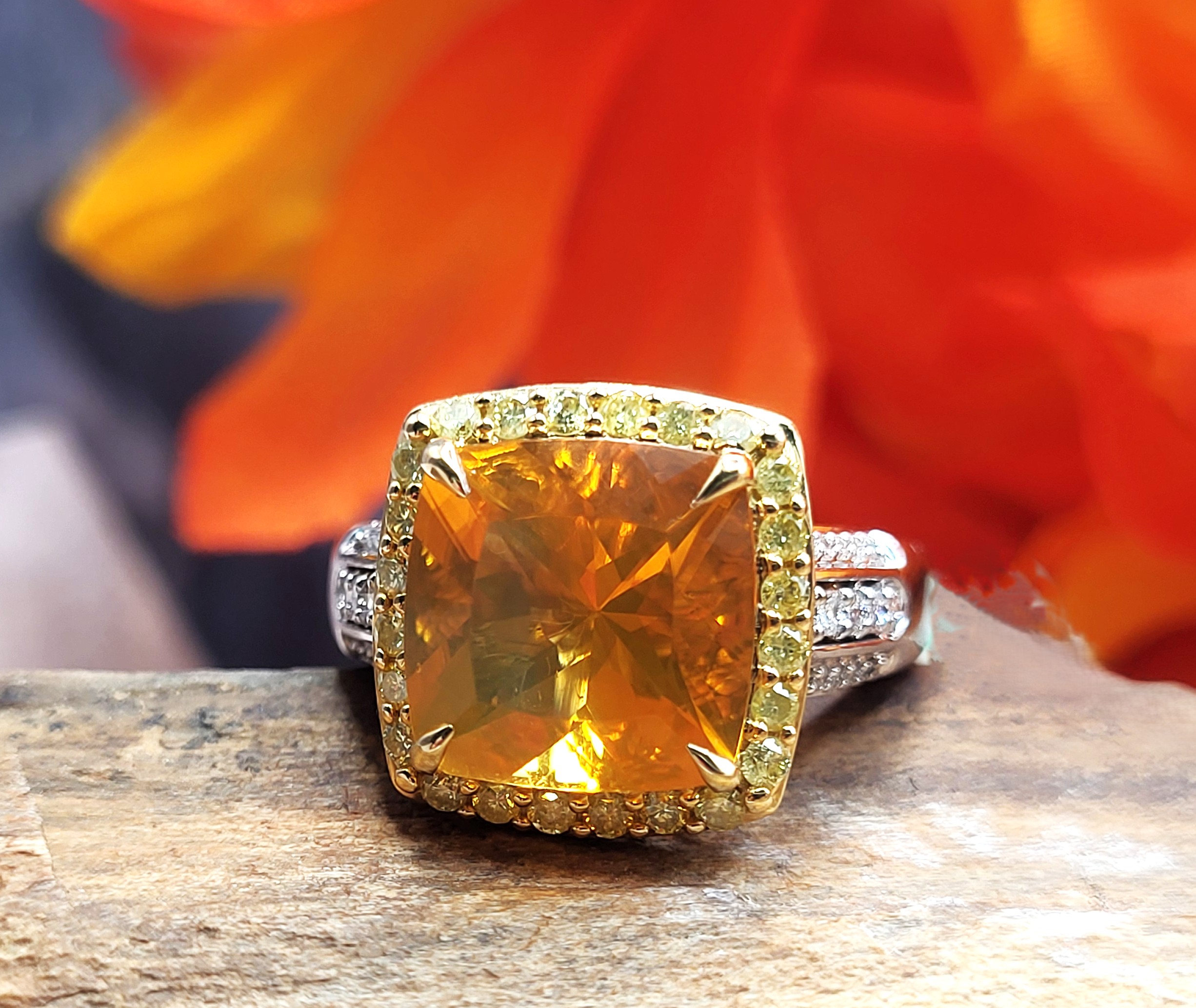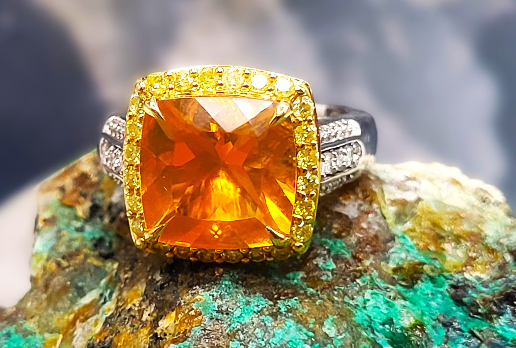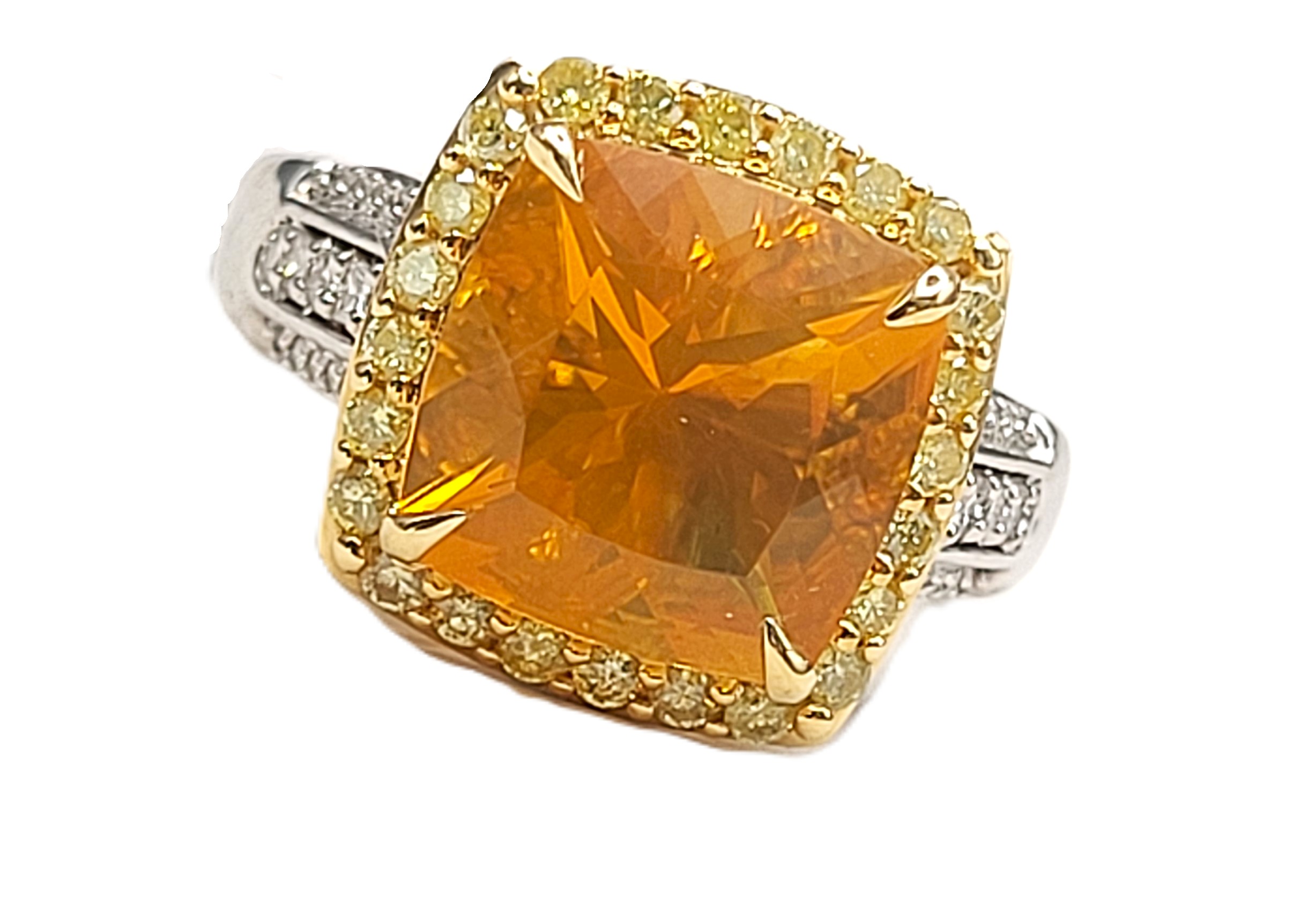It is easy to see how this gemstone came to be called "Fuego del Mar", meaning "fire of the sea". It is literally aflame with color! Set in luxurious 18 karat yellow and white gold, the 3.71 carat cushion-shaped fire opal is claw prong set into a devinely reticulated basket of yellow gold. The gemstones are supported with a solid under gallery. And, with fire, there must be ice. In the halo and along the shoulders are .64 carats total weight of superior quality diamonds. The halo features round, brilliant-cut, natural yellow diamonds, with near colorless round, brilliant-cut and square-cut diamonds adding muscle to the staggered white gold shoulders that taper to an approximate 2.8 mm shank. This ring is US size 7. See sizing details and other important information below. Admin/Code 6282/16-bwrr (7.3g)