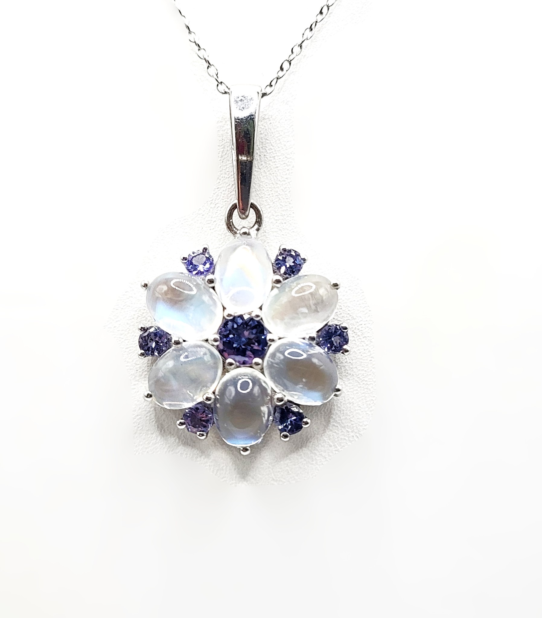 This sterling silver necklace features 8.75 carats total weight of oval, cabochon, natural rainbow moonstones in a radiant floral design and .99 carats total weight of round, faceted, genuine tanzanite. The pendant hangs from an 18" fine open link chain with a spring ring closure. A solid bail accommodates chains up to approx. 3.5mm. The pendnant is approximately 1" in diameter. Total weight: 6.39g. AdminCode: 6282/34-gr