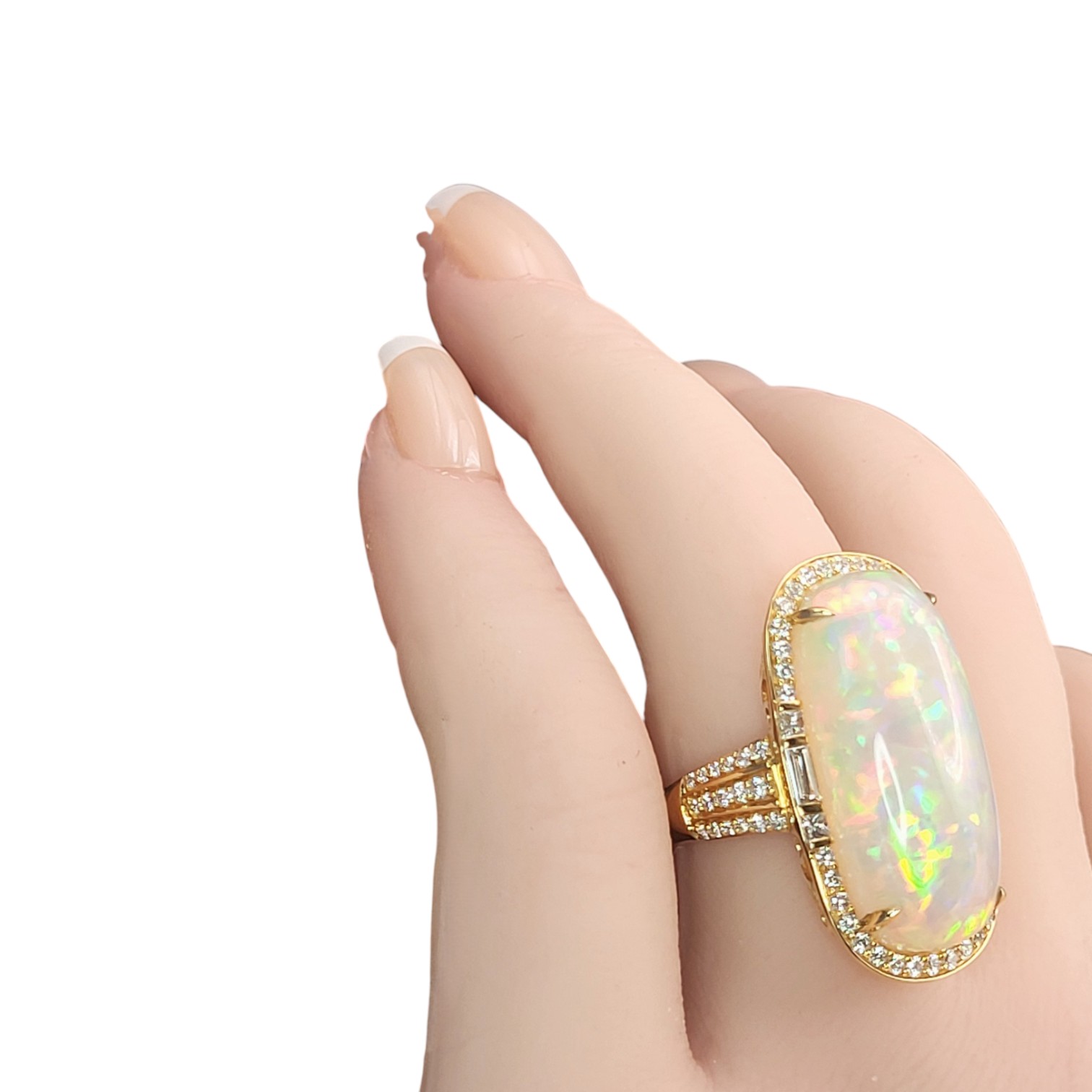 A breathtaking 19.57 carat cushion cabochon Orion Opal anchors this celestial masterpiece, glowing with shifting hues of green, purple, and orange. Framed by 1.06 carats of SI1 clarity, G color diamonds—round, brilliant-cut, square-cut, and straight baguette—this ring dazzles from every angle. The ornate gallery and claw prongs elevate the opal like a crown, while the 18K yellow gold shoulders shimmer with three rows of diamonds. Measuring 1.25" long and 0.50" wide on the finger, this size 6.5 ring is a radiant statement of elegance and cosmic beauty. Find sizing options and other important information below.