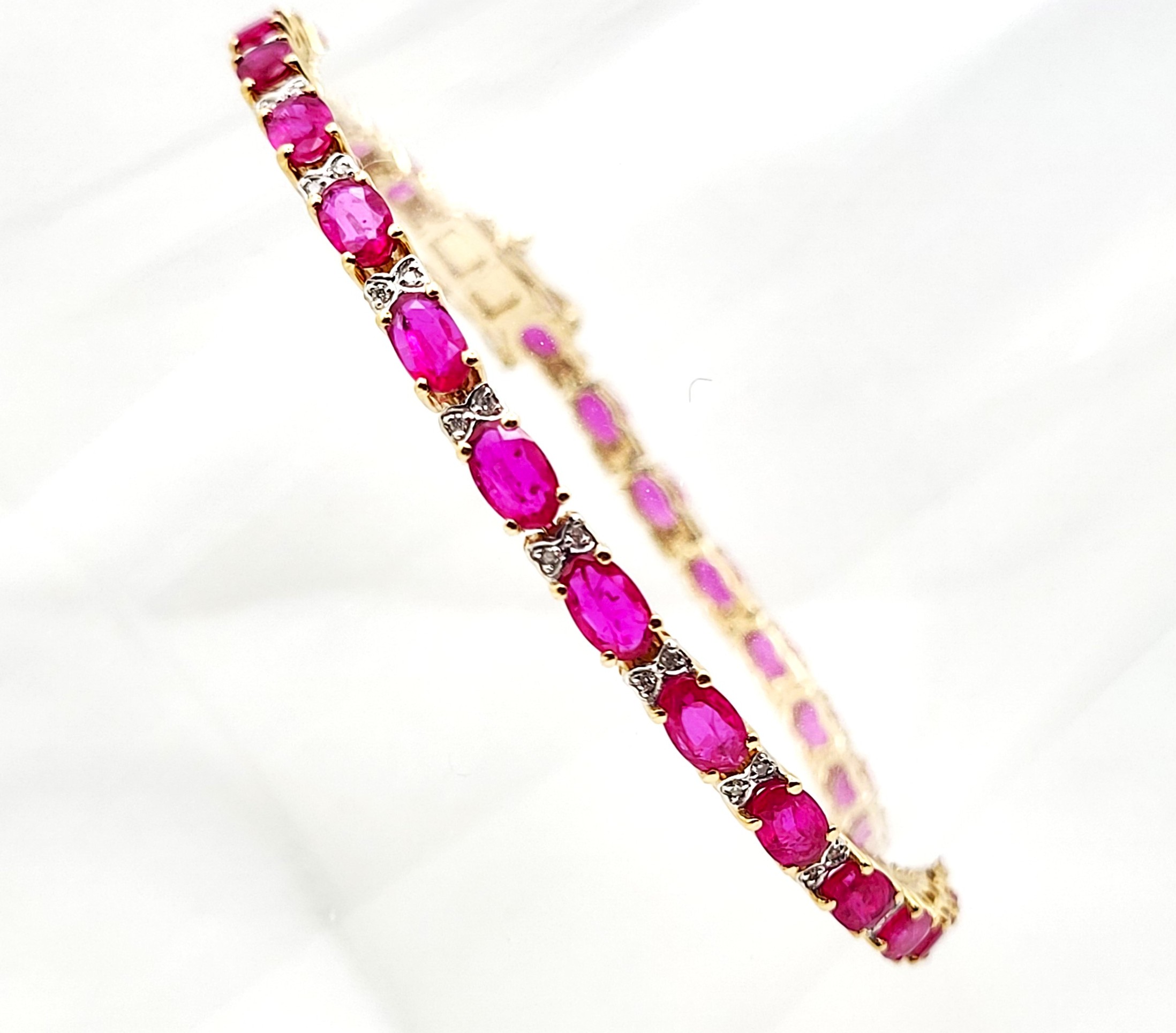 This 14 karat yellow gold bracelet contains over 5.00 carats of genuine, oval-cut rubies and each ruby represents an individual link. The links are separated by diamond-accentuated bow-tie shaped hinge covers. That means this bracelet has 5.87 carats of precious gemstones when you sum up the 5.72 carats total weight of rubies and the .15 carats total weight of round, faceted H-I color, I1 clarity diamonds! The bracelet is 7" long and has a hidden box clasp with 2 figure-eight safety clips. Admin: Q5743/31-bigr