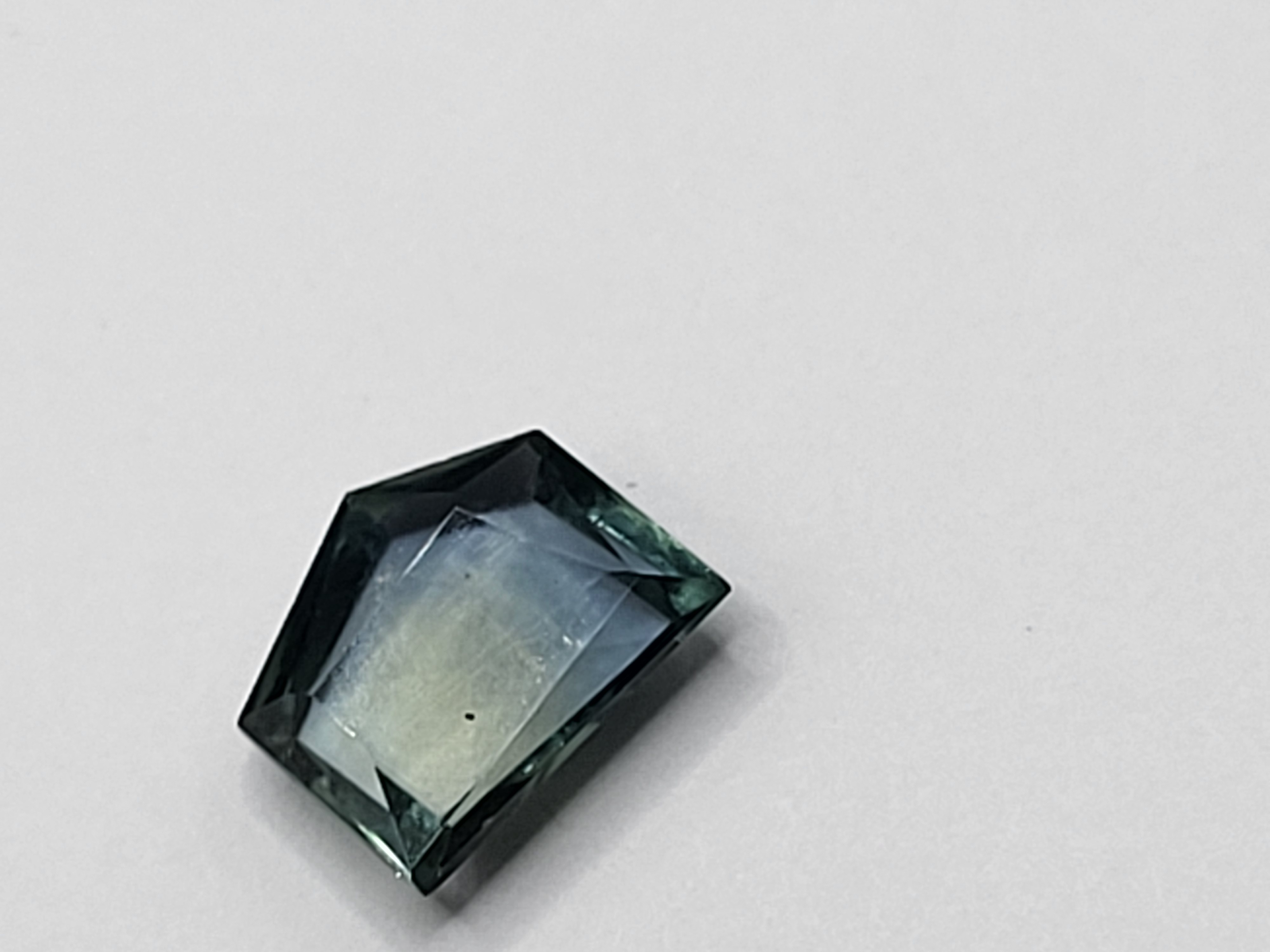 A striking 2.28 carat Montana Sapphire, masterfully cut into a rare pentagonal silhouette. This unheated gem showcases a natural bi-color gradient—deep blue edges transitioning into a luminous yellowish core—evoking the shimmer of alpine twilight. Precision faceting enhances its brilliance and symmetry, making it a standout collector’s piece or a bold centerpiece for custom design. Sourced responsibly and offered loose, ready to set or admire.