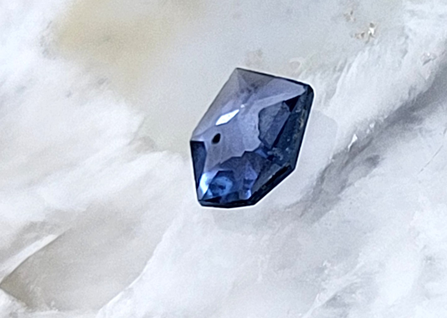 A rare .41 carat Montana Sapphire, mined from the famed Yogo Gulch and cut into a slender pentagonal silhouette. This unheated gem displays a natural gradient from pale to royal blue, with a distinctive dot-like inclusion that adds intrigue without compromising its clarity. Responsibly sourced and expertly cut and polished in Washington State, it measures approximately 6 × 4 × 2.5mm. Offered loose, ideal for minimalist settings or collectors seeking American-mined rarity. AdminCode: BKYG1/bpn