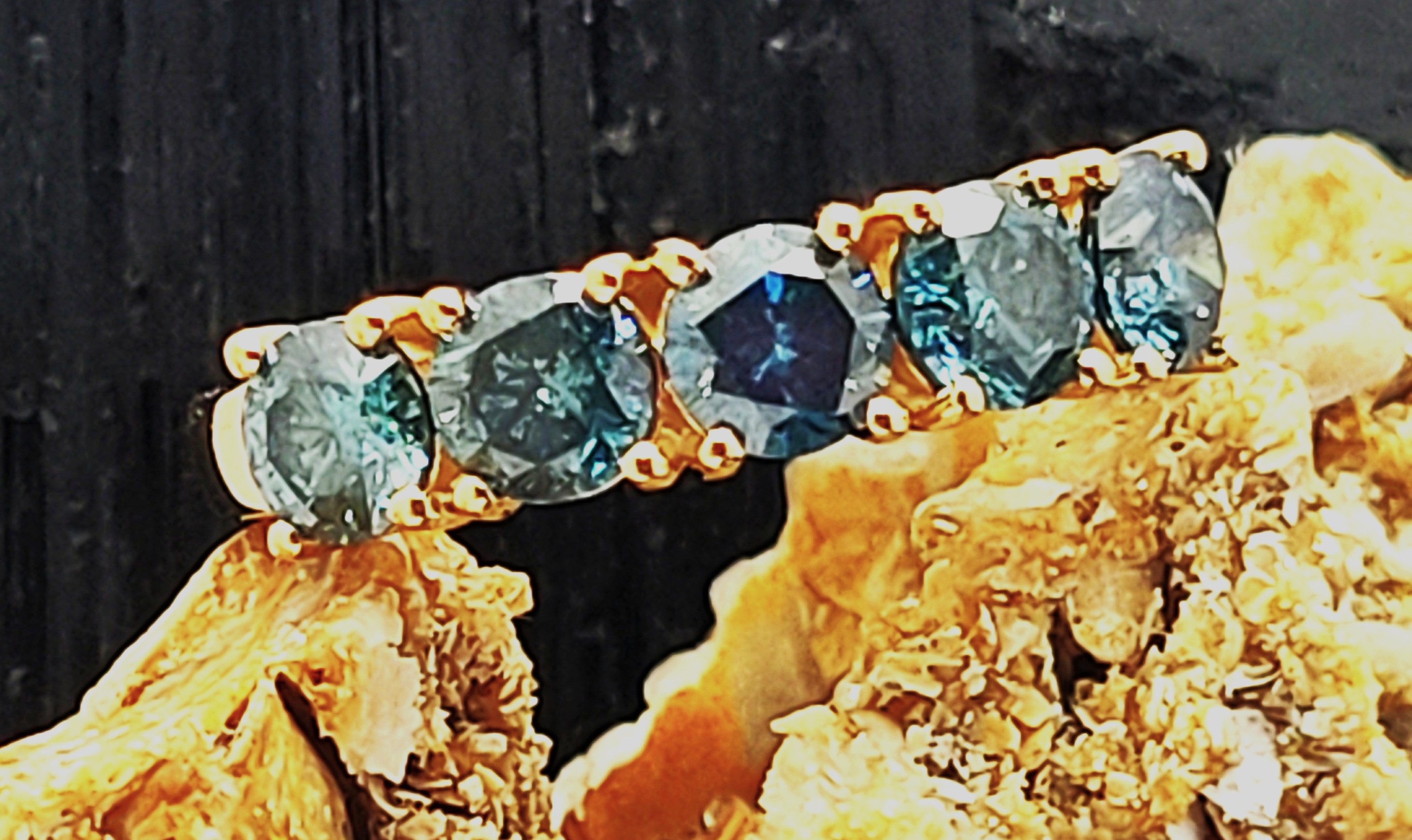 If blue diamonds formed 4 times deeper within the earth, now that they are out, shouldn’t you take them out and show them off four times more often? This 14 karat yellow gold ring is stunning and features 1.83 carats total weight of round, brilliant-cut, blue color, I1 clarity diamonds that are prong-set in a row that shoulders up to a polished shank, tapering to 2.5mm. The ring is US size 7. See below for sizing details and other information.