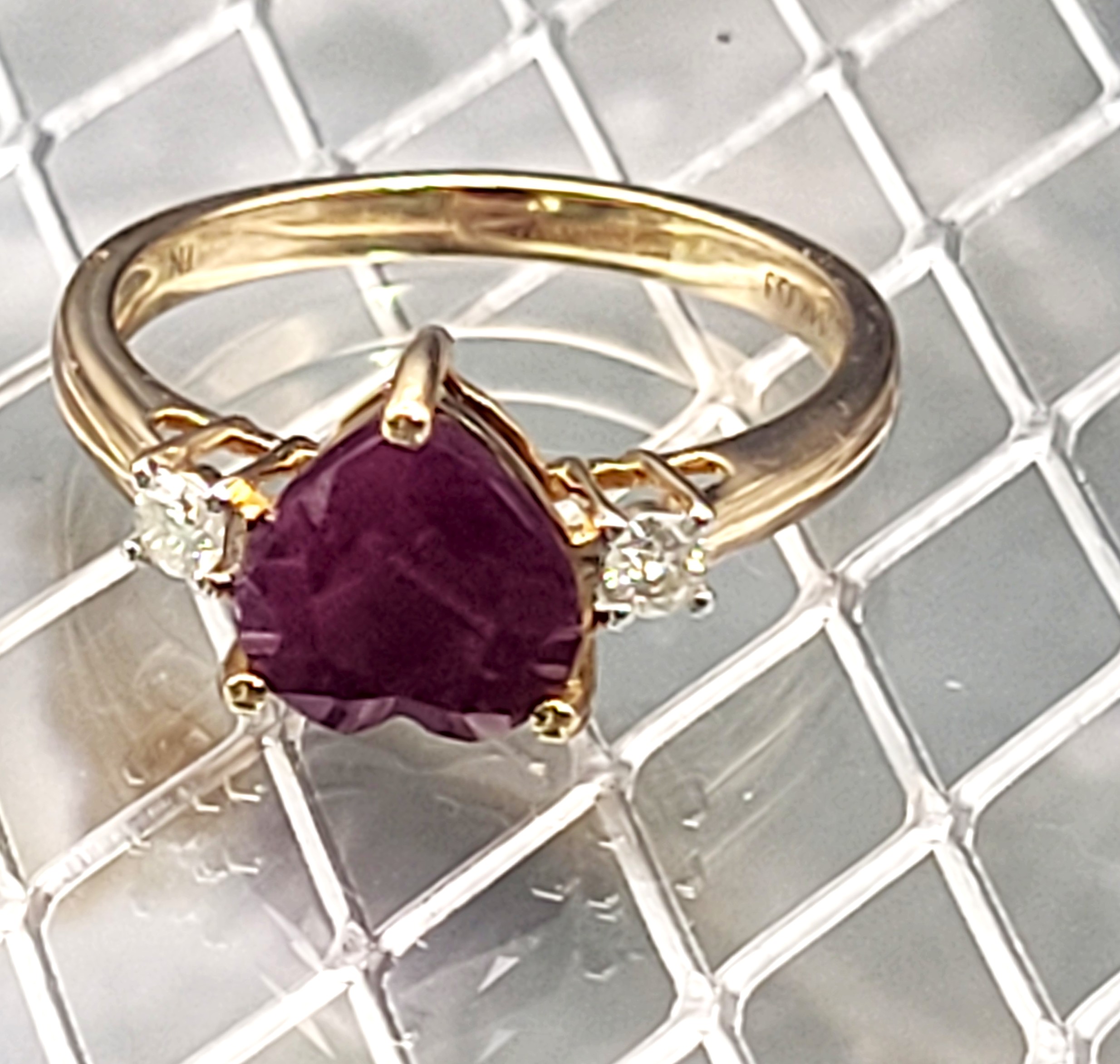 This 14 karat yellow gold ring features a 2.65 carat, heart-cut, genuine ruby* that is prong-set between two round, brilliant-cut, genuine, natural H-I color, I1 clarity, natural diamonds that total .14 carats total weight. The ruby is 8mm and displayed in cathedral shoulders that taper to an approximate 2.25mm shank. The ring is US size 7. 2.85 grams Admin: Q5743/15-ngrll